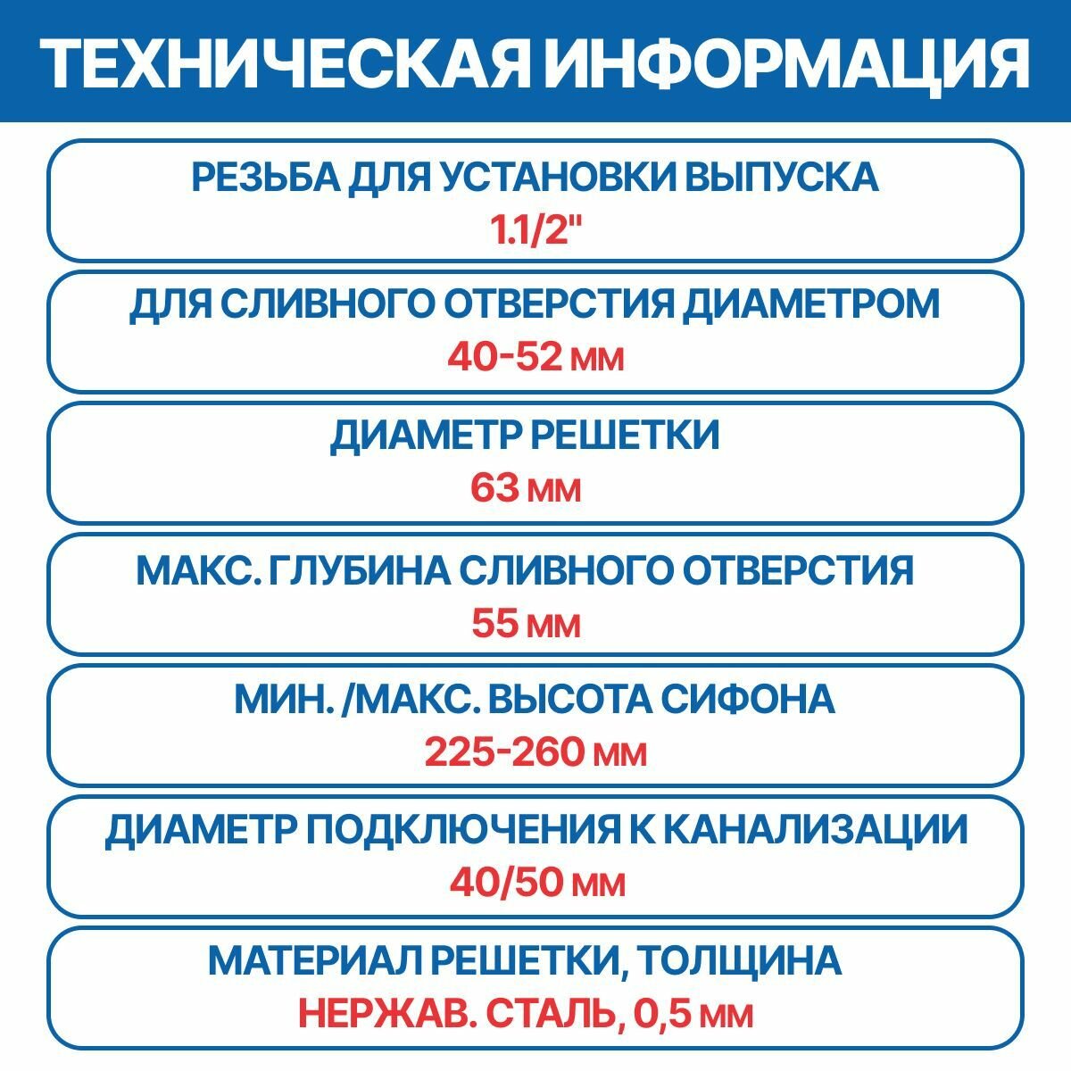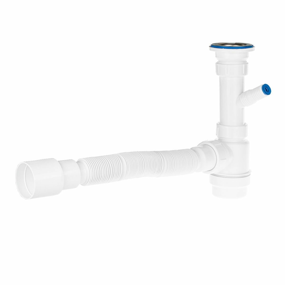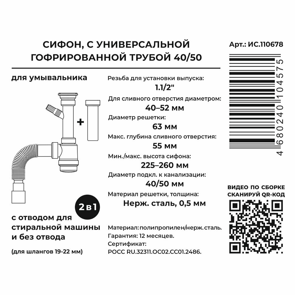 Сифон для выпуска 40-52 мм, 1.1/2x40, с нерж.решеткой, гофротрубой 40x40/50, дополнительным патрубком с отводом для с/м MasterProf ИС.110678 устанавливается в раковины умывальников с диаметром выпускного отверстия 40-52 мм. Минимальная и максимальная высота расположения сифона: 225-260 мм.Преимущества Выполнен сифон из первичного полипропилена, что гарантирует высокую прочность, надежность и долговечность изделия Выгодно отличает данный сифон два комплектных патрубка - один обычный, второй с отводом для подключения сливных шлангов бытовой техники. Появление стиральной машины не станет неожиданностью. Штуцер отвода позволяет подключить сливные шланги 19 и 22 мм Декоративная решетка из нержавеющей стали толщиной 0,5 мм и диаметром 63 мм не деформируется при нагрузке и обеспечивает долговременный декоративный эффект