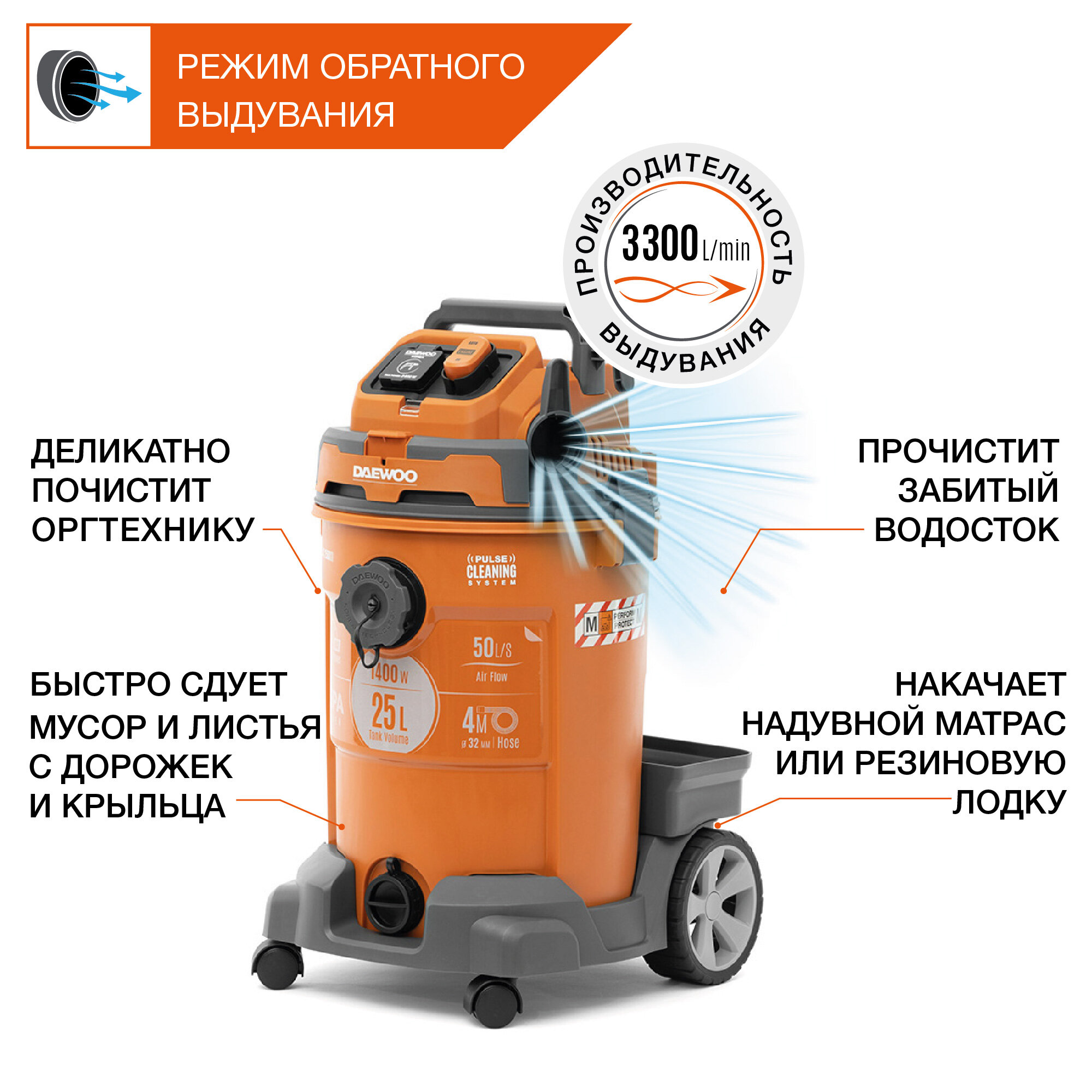 Пылесос строительный DAEWOO DAVC 2500SD 1400 Вт - специально разработан и предназначен для сухой и влажной уборки помещений, сбора любой сухой пыли, мокрой грязи и твердых частиц. Оборудован системой автоматического включения и отключения при одновременном использовании с электроинструментом для принудительного удаления продуктов пиления, строгания, фрезерования и т.п.ПреимуществаПылесос эффективно удаляет пыль с средней степени опасности, к которой относятся такие вещества как бетон, твердая древесина, керамика, никель, марганец, медная проволока, силикаты, жесть и другие. Нера-фильтр класса М применяется для очистки воздуха с эффективностью 99,9%;Инновационная система очистки фильтров.Состоит из 2-х частей: Встряхивание фильтра HEPA+ и обратное направление воздушного потока внутрь бака для очистки фильтра изнутри. Восстанавливает до 90% от первоначальной производительности фильтра. Активируется простым нажатием кнопки на панели управления.Индикатор заполнения бака.Он указывает на то, что пылесборник пора очистить или заменить. Если не сделать этого вовремя, интенсивность всасывания значительно уменьшится, а качество уборки ухудшится.Розетка для электроинструмента.Встроенная розетка позволяет подключать к нему электроинструменты мощностью до 2000 Вт.Автоматическое включение пылесоса при начале использования инструмента и отключение с задержкой для удаления грязи из шланга.Бак из ударопрочного пластика.Корпус пылесоса выполнен из современного, ударопрочного пластика с толщиной стенки 3 мм.Стойкий к механическим воздействиям и коррозии.Объем бака 25 литров.Возможность сбора воды.Функция всасывания и откачки воды позволяет эффективно собирать жидкость с любого покрытия в объеме до 17 - 18 литров.Автоматическая остановка всасывания для предотвращения попадания жидкости в двигатель.Сливное дренажное отверстие.Отверстие, расположенное в нижней части бака, облегчает слив собранной загрязненной жидкости без необходимости поднимать и переворачивать пылесос.Насадка для устранения засоров.Эффективно удаляет засоры в сливах раковин, ванн и душевых кабин, без необходимости разбора и применения химикатов.Специальная форма обеспечивает высокую степень разрежения и подходит для всех типов шлангов от 32 до 38 мм.Режим обратного выдувания.Функция обратного выдувания 3000 л/мин позволяет очистить рабочее место от опилок и стружки, сдуть листву с дорожек или прочистить водосток или канализацию.Шланг увеличенной длины 4 м.Шланг длиной 4 м позволяет собирать строительный мусор на высоте, без необходимости поднимать пылесос.Область примененияПредназначен для очистки помещений во время строительных работ.КомплектацияПылесос;Удлинительные трубки 2 шт;Щелевая насадка;Насадка для сухой и влажной уборки;Насадка для мебели;Растягивающийся всасывающий шланг (1 — 3 метра);HEPA – фильтр;Колёса 4 шт;Зарядное устройство DAEWOO DACH 2521Li;Аккумуляторная батарея DAEWOO DABT 4021Li;Гарантийный талон;Руководство по эксплуатации.