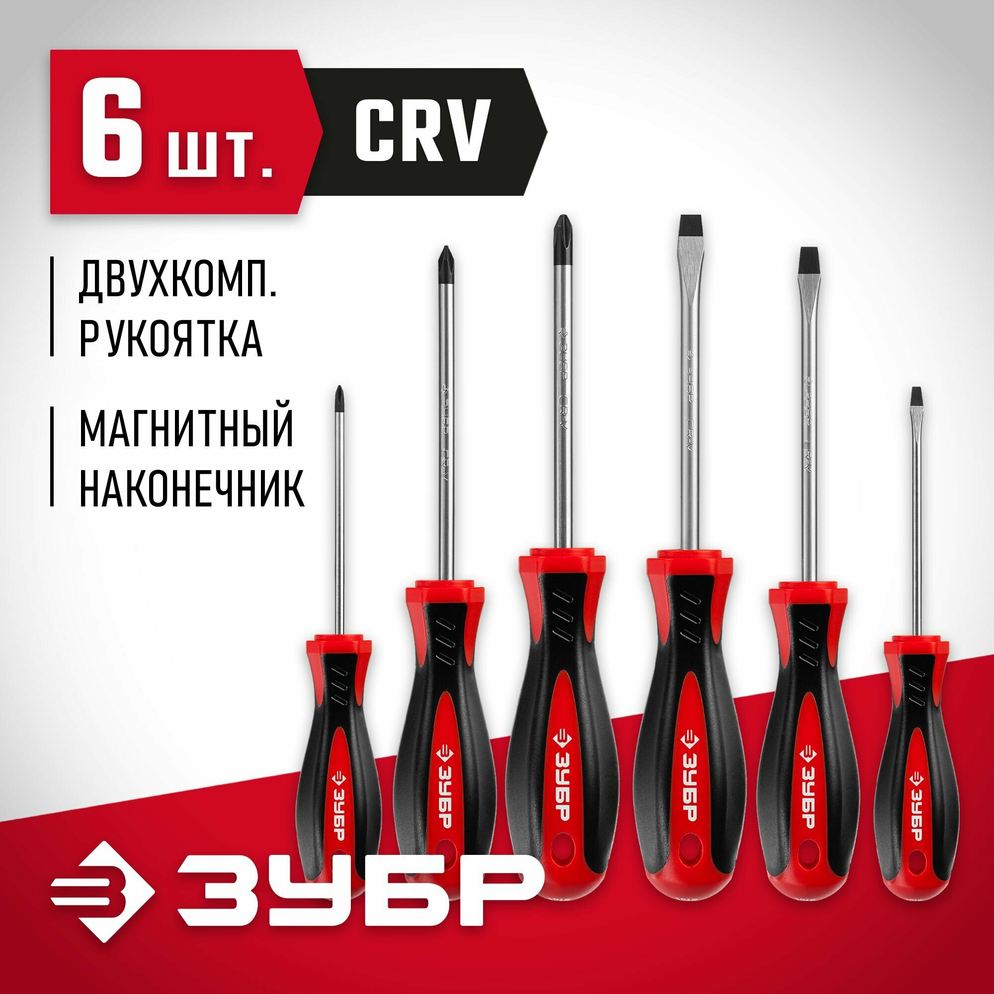 Набор отверток слесарных Зубр "МАСТЕР" 25066 6 предметов Cr-V сталь эргономичная двухкомпонентная рукоятка магнитный наконечник в коробке