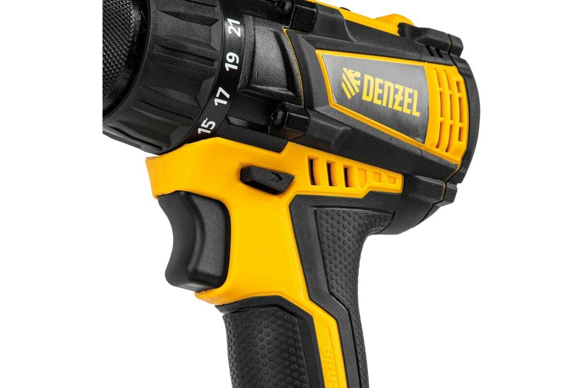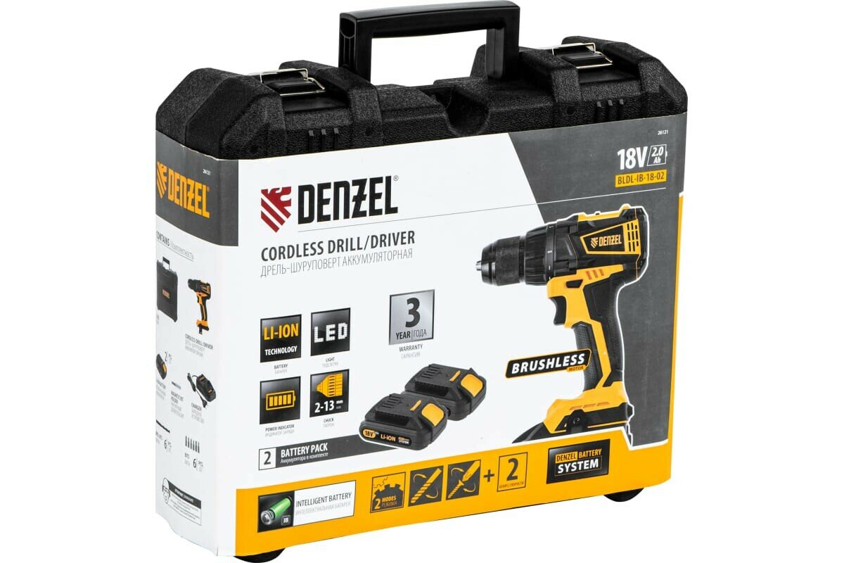 26105 - Дрель-шуруповерт аккумуляторная DENZEL CDL-12-02BM, Li-Ion, 12 В, 2 акк.Аккумуляторная дрель-шуруповерт Denzel CDL-12-02BM 26105 с 2 батареями Li-Ion 12 В предназначена для монтажа и демонтажа резьбовых соединений, cверления отверстий в металле (до 10 мм), древесине (до 16 мм), пластмассе и других материалах. Инструмент пригодится профессионалам и любителям на строительной площадке, дома или на даче.Надежные литий-ионные аккумуляторы без эффекта памяти и защитой от глубокого разряда обеспечивают долгий срок службы инструмента. Дрель не зависит от сети питания, что делает удобной работу на строительных объектах, на высоте и в отдаленных участках дома. Преимущества17+1 ступень регулировки крутящего момента — вы с легкостью подберете оптимальное усилие затяжки под тип крепежа.Два режима вращения — можно настроить скорость в диапазоне 0-400 или 0-1450 об/мин для работы с резьбовыми крепежами и сверления отверстий.Мгновенное переключение между задачами — реверс позволяет быстро перейти от монтажа к демонтажу крепежных элементов.Подсветка рабочей зоны — решать поставленные задачи удобно даже в условиях плохой освещенности и в труднодоступных местах.Защита от перетягивания крепежа — благодаря тормозу выбега шпиндель моментально останавливается после выключения.Высокий ресурс — корпус из ударопрочного пластика и металлические шестерни редуктора обеспечивают долгий срок службы инструмента.Бесперебойная работа — в комплект поставки входит зарядное устройство и 2 аккумулятора с индикацией уровня заряда.Быстрая и безопасная зарядка — на восстановление работоспособности аккумулятора требуется всего 1 час, о завершении процесса свидетельствует зеленый цвет индикатора на зарядном устройстве.Быстрая смена оснастки — блокировка шпинделя и одномуфтовый патрон позволяют снимать и устанавливать биты и сверла одной рукой.Дополнительные возможности — инструмент можно закрепить на ремне или кармане при помощи специального крюка.Комфортная работа — прорезиненная рукоятка обеспечивает надежный хват и поглощает вибрации, снижая нагрузку на руки мастера.Удобное хранение и транспортировка — дрель-шуруповерт поставляется в надежном пластиковом кейсе.Гарантия 3 года — качество инструмента подтверждено производителем.