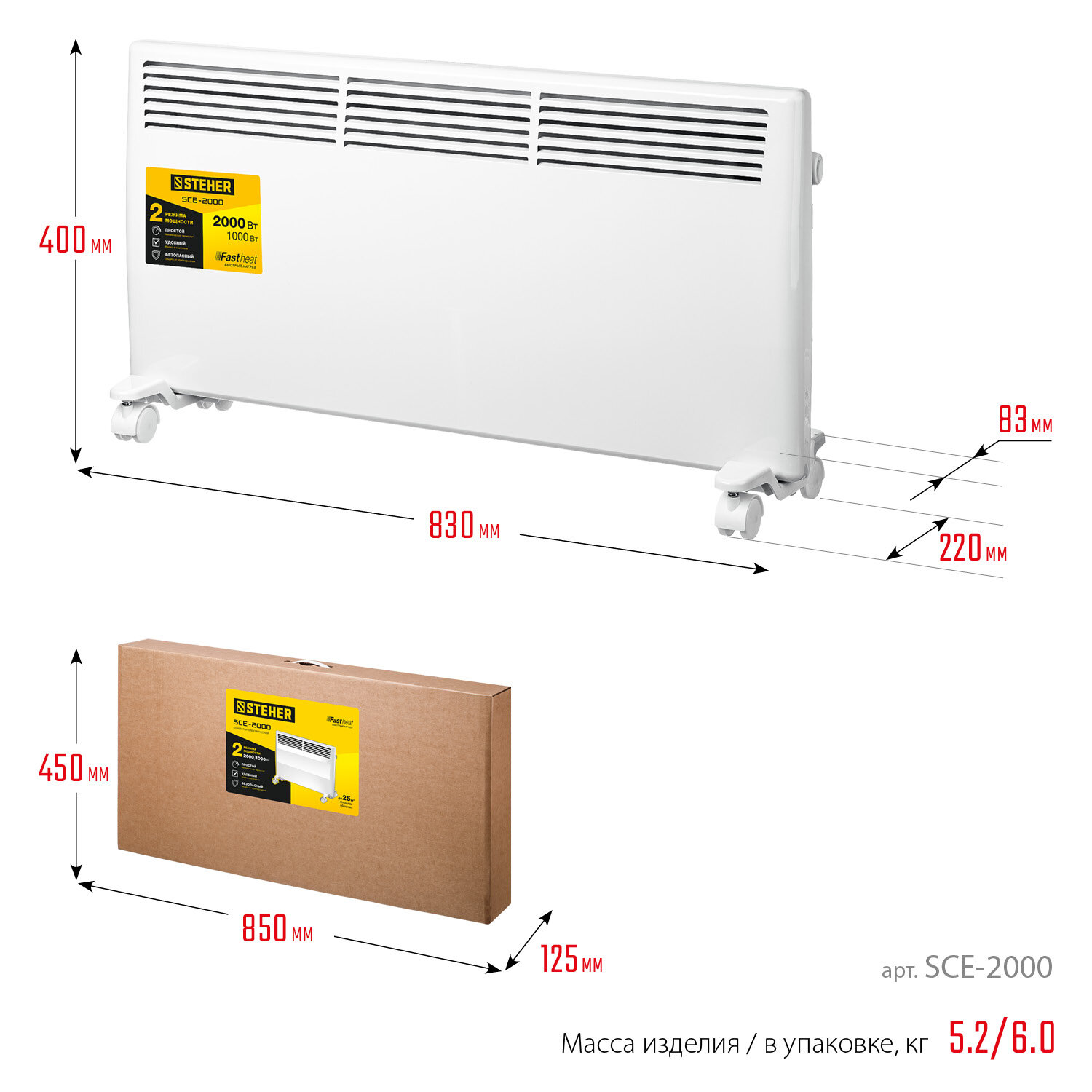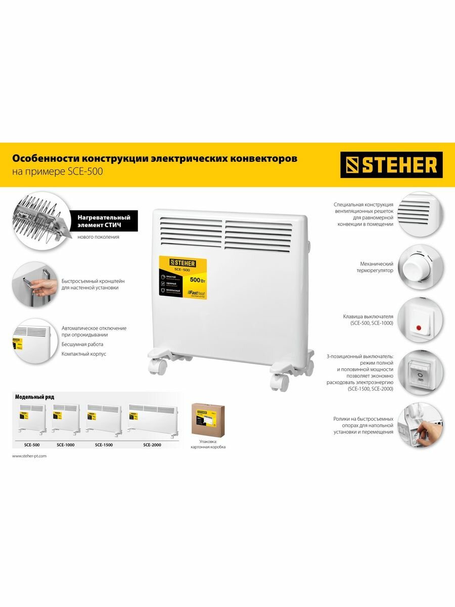 Электрический конвектор STEHER SCE-2000, Е серия, мощностью 2000 Вт - подойдет для обогрева любых домашних и офисных помещений площадью до 25 кв.м.Преимущества Равномерная конвекция воздуха благодаря вентиляционным решеткам на передней и боковых панелях Нагревательный элемент СТИЧ - моментальный нагрев до установленной температуры и остывание Механический терморегулятор Клавиша выключателя Режим полной и половинной мощности Быстросъемный кронштейн для крепления на стене в комплекте Автоматическое выключение при опрокидывании Бесшумная работа Ролики на быстросъемных опорах для напольной установки и перемещения