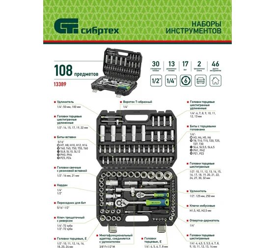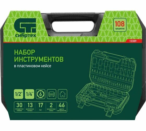 Набор инструментов Сибртех 13389 упакован в пластиковый кейс и состоит из 108 предметов с присоединительным размером 1/2"" и 1/4"", предназначенных для монтажа и демонтажа резьбового крепежа с разными типами шлицев. В комплект поставки входят карданы, удлинители и переходники, облегчающие работу в труднодоступных местах. Набор используется для ремонта автомобилей, а также полезен в быту.Преимущества Износостойкость — элементы набора изготовлены из высокопрочной стали Надежная защита от коррозии — на инструменты нанесено матовое хромовое покрытие Комфортная и эффективная работа — ключи-трещотки с 45 зубьями оснащены механизмом быстрого сброса, переключателем реверса с металлическим флажком и двухкомпонентной рукояткой Прочная фиксация — шариковый замок на трещотках, воротках, шарнирах и удлинителях надежно удерживает головки Удобное хранение и транспортировка — инструменты и насадки упакованы в ударопрочный пластиковый кейс с металлическими замками