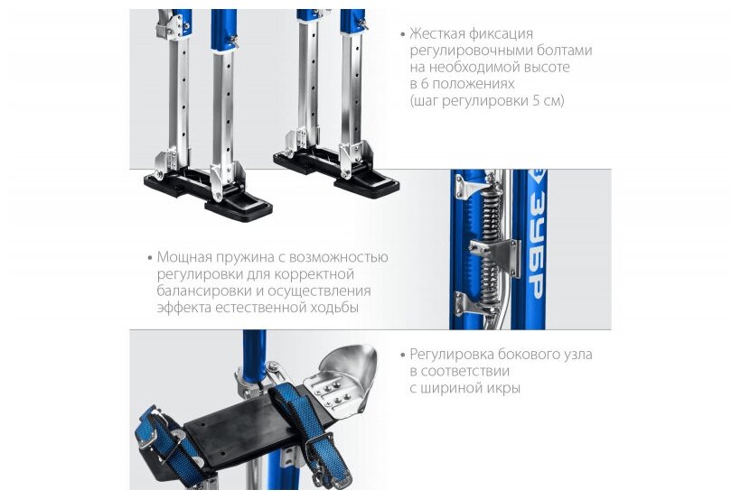 Строительные ходули ЗУБР Гулливер 480-770 мм серии "ПРОФЕССИОНАЛ" (10318) предназначены для ремонтных работ. С помощью них можно быстро и качественно осуществить электромонтажные и малярные работы на высоте от 480 мм до 770 мм. Также ходули отлично подходят для монтажа потолков. Оборудование позволяет заменить козлы и стремянки, при этом экономят время мастера на перемещение по рабочей площадке.Преимущества Надежная конструкция для быстрых и качественных электромонтажных, ремонтных, малярных и штукатурных работ, для монтажа потолков Регулируемый подпяточник и жесткие фиксирующие ремни - точная настройка под любой размер обуви для комфортной и безопасной работы Регулировка бокового узла в соответствии с шириной икры Широкие ремни, удерживающие ногу работника Изготовлены из алюминия - легкость и одновременно высокая жесткость конструкции Жесткая фиксация регулировочными болтами на необходимой высоте в нескольких положениях (шаг регулировки 5 см) Резиновое основание усиливает устойчивость конструкции, исключая проскальзывание Мощная пружина с возможностью регулировки для корректной балансировки и осуществления эффекта естественной ходьбы