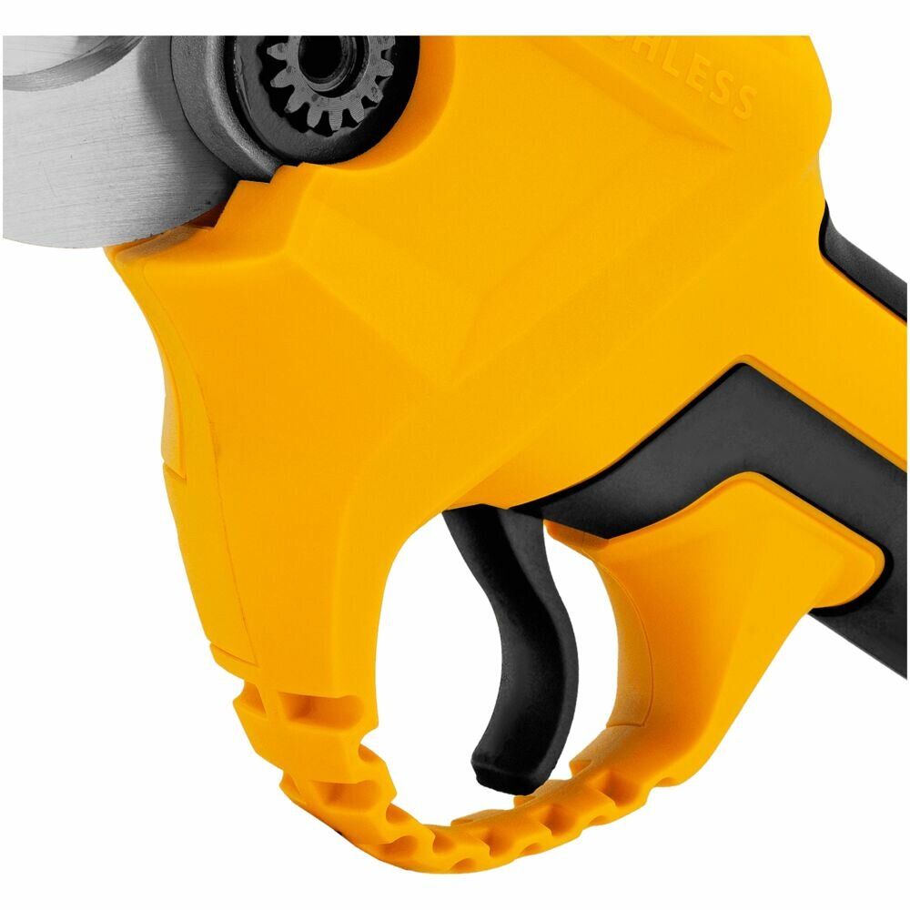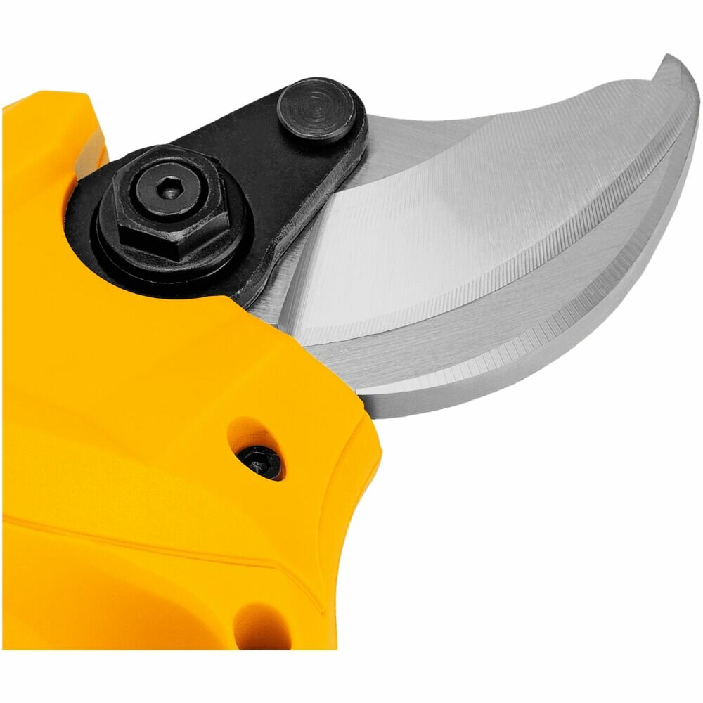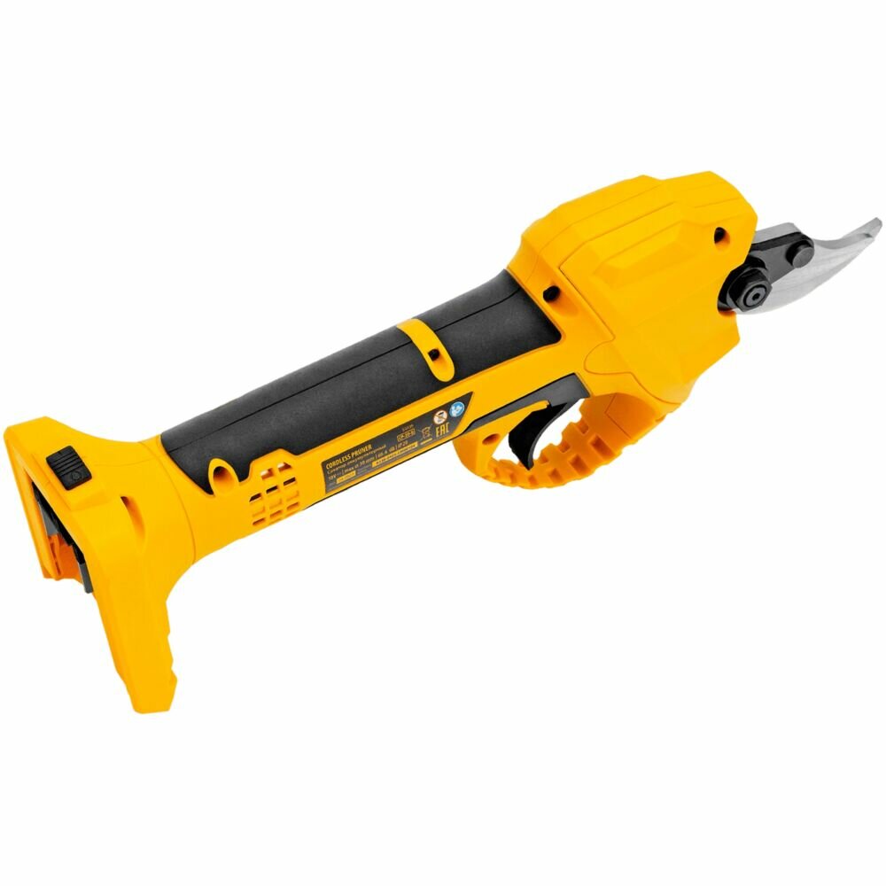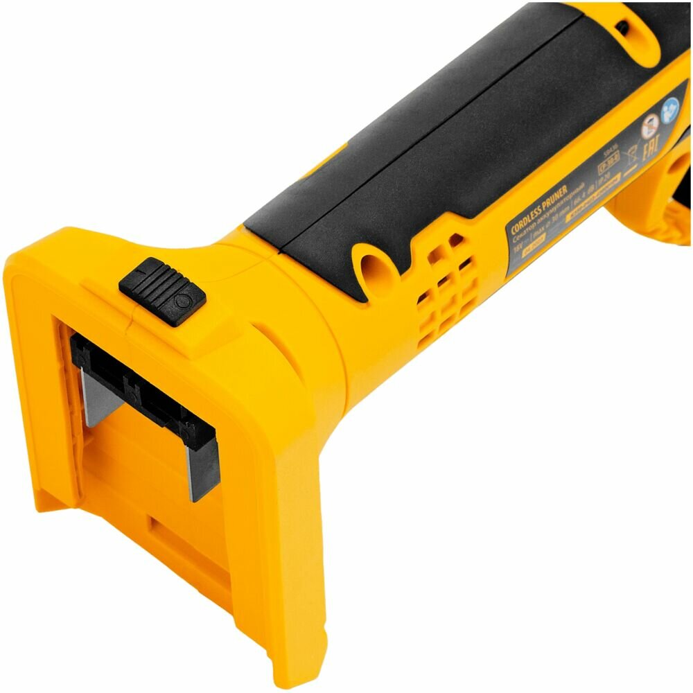 Аккумуляторный секатор Denzel CP-30-0 18В предназначен для срезания ветвей толщиной до 30 мм. Станет незаменимым помощником для владельцев загородных домов, дач и плодовых питомников. Компактный бесщеточный электродвигатель обеспечивает эффективную работу инструмента. Секатор работает от аккумулятора, поэтому будет полезен при работе в труднодоступных местах и отдаленных участках сада. Аккумулятор и зарядное устройство приобретаются отдельно.Преимущества Прочность и долговечность — стальные лезвия закалены до твердости 55-60 HRC, благодаря чему долго остаются острыми Защита от случайного пуска — блокировка куркового выключателя не допускает начало работы по неосторожности Предотвращение случайного повторного включения — в случае, если отключение произошло по причине разрядки, секатор не запустится после установки заряженного аккумулятора, а перейдет в защищенный режим Функция автоотключения — инструмент выключается примерно через 10 минут, такое решение повышает безопасность рабочего процесса Работа без простоев — LED индикатор на корпусе позволяет оценить оставшееся до подзарядки время Комфортная эксплуатация — эргономичная форма инструмента обеспечивает надежный и удобный захват Запасное подвижное лезвие в комплекте — возможность замены ножа позволяет избежать выход секатора из строя при поломке оснастки и оперативно заменить ее Безопасное хранение и транспортировка — после выключения режущий узел переводится в сомкнутое положение, в комплекте имеется защитный чехол Гарантия 3 года — качество инструмента подтверждено производителем
