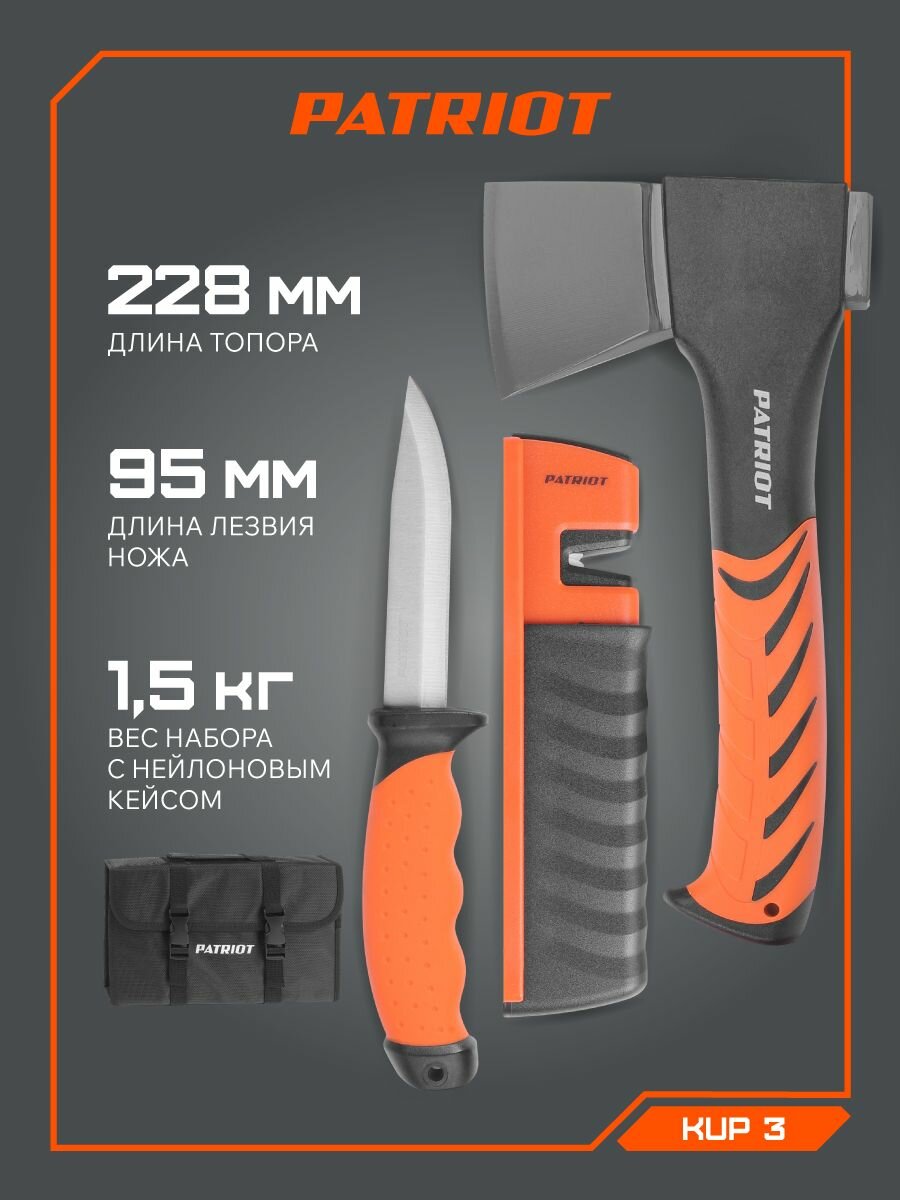 Набор универсальный Patriot KUP 3 содержит топор, многофункциональный нож и точило. Предназначен для охотников, рыбаков и туристов. Такие инструменты будут незаменимы в походе, обеспечивая удобство заготовки дров.Преимущества Компактные размеры инструментов, наличие пластикового держателя и ножен, а также нейлоновый кейс для набора обеспечивают удобство транспортировки и хранения инструментов Эргономичная форма рукояток способствует безопасной и комфортной эксплуатации. Это препятствует выскальзыванию инструментов из рук при напряженной работе Топорище изготовлено из кованой углеродистой стали, что делает их устойчивыми к высоким нагрузкам. Рукоятка топора выполнена из фибергласса и покрыта прорезиненным пластиком. Длина топора – 228 мм Многофункциональный нож имеет длину лезвия 95 мм, рукоятка выполнена прорезиненного пластика Точило предназначено для заточки топоров и ножей. Материал абразива – керамика Набор универсальный Patriot KUP 3 – это компактное решение для туристов, рыбаков и охотников, а также дачников