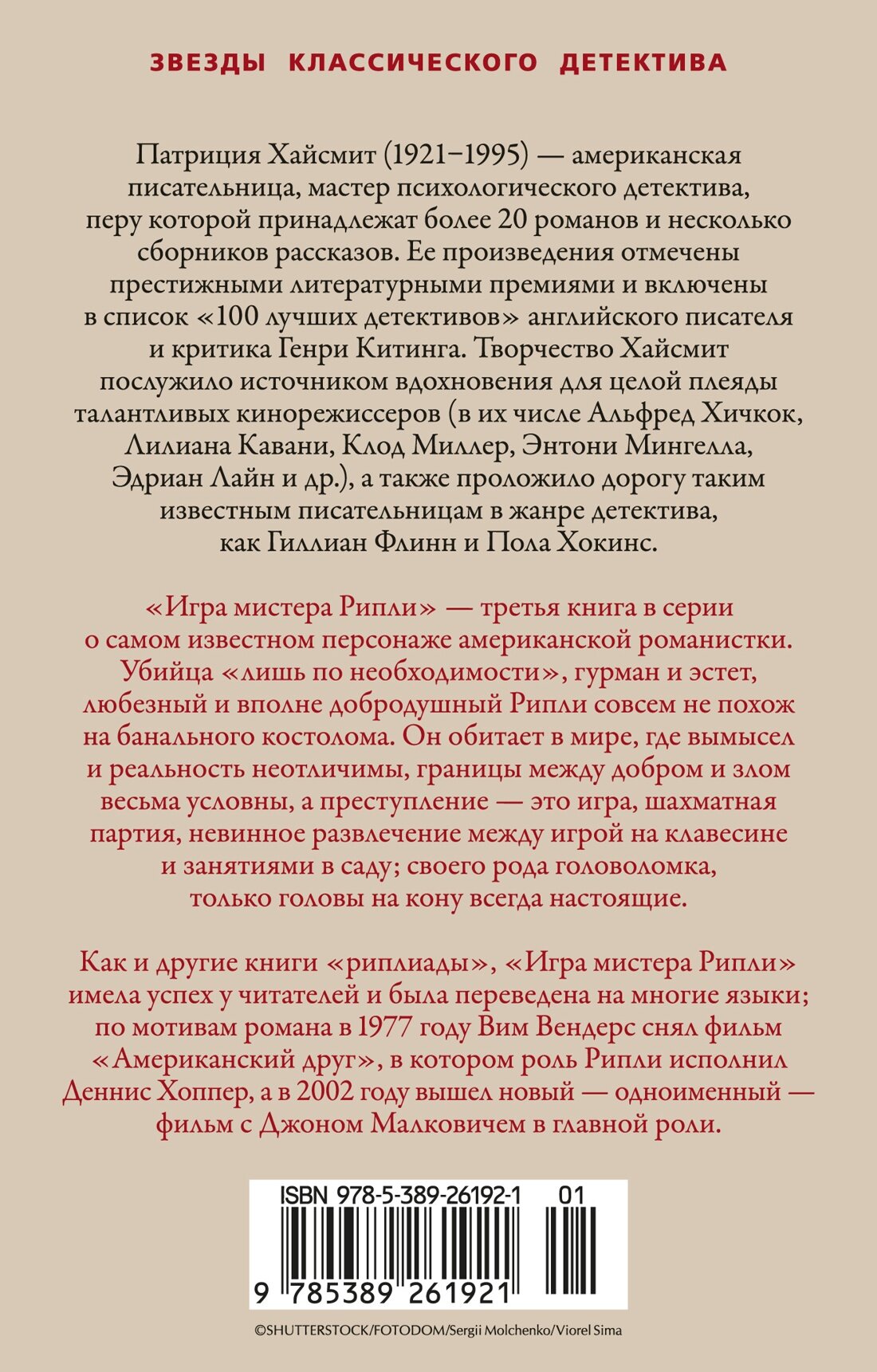 «Игра мистера Рипли» третья книга в серии о самом известном персонаже американской романистки. Убийца «лишь по необходимости», гурман и эстет, любезный и вполне добродушный Рипли совсем не похож на банального костолома. Он обитает в мире, где вымысел и реальность неотличимы, границы между добром и злом весьма условны, а преступление это игра, шахматная партия, невинное развлечение между игрой на клавесине и занятиями в саду; своего рода головоломка, только головы на кону всегда настоящие. Как и другие книги «риплиады», «Игра мистера Рипли» имела успех у читателей и была переведена на многие языки; по мотивам романа в 1977 году Вим Вендерс снял фильм «Американский друг», в котором роль Рипли исполнил Деннис Хоппер, а в 2002 году вышел новый одноименный фильм с Джоном Малковичем в главной роли.