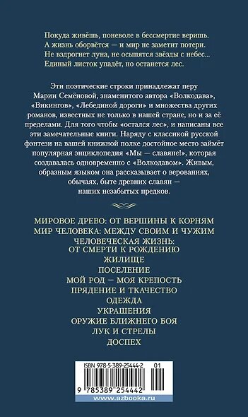 Мария Семёнова большой мастер, сказавший своё звонкое слово в русской литературе. Она создала собственный «квазиславянский» мир, заслужив благодарность и искреннее восхищение миллионов читателей. Её перу принадлежат «Лебединая дорога», «Поединок со Змеем», «Там, где лес не растёт», «Валькирия», «Меч мёртвых» и множество других романов. Самый знаменитый из них «Волкодав» для многих стал настольной книгой, которую перечитывают и берут с собой в дорогу, словно частицу родного дома. Однако «последний из рода Серых Псов» не появился бы на свет без своего безымянного альтер эго, вятича или кривича, героя популярной энциклопедии «Мы славяне!». По словам писательницы, обе эти книги создавались параллельно. Таким образом великий мифотворец Мария Семёнова развеяла миф о том, будто наши предки безгласно канули в небытие. Память о них покрылась пылью веков и архивов, тем не менее сведений хватило бы не на один том. Строго говоря, энциклопедию нельзя причислить к результатам научного исследования, прежде всего из-за эмоционального, живого изложения но, может, этим и запомнится книга читателю? Между тем здесь собран серьёзный фактический материал, посвящённый большей частью язычеству, в котором автор видит ключи к пониманию духовного и материального мира древних славян. Мифология и пантеон, быт и обычаи, домашняя утварь, оружие, ремёсла эту книгу можно читать с любой главы и в любой последовательности с неизменно возрастающим интересом. Издание содержит более 300 иллюстраций на основе этнографических источников.