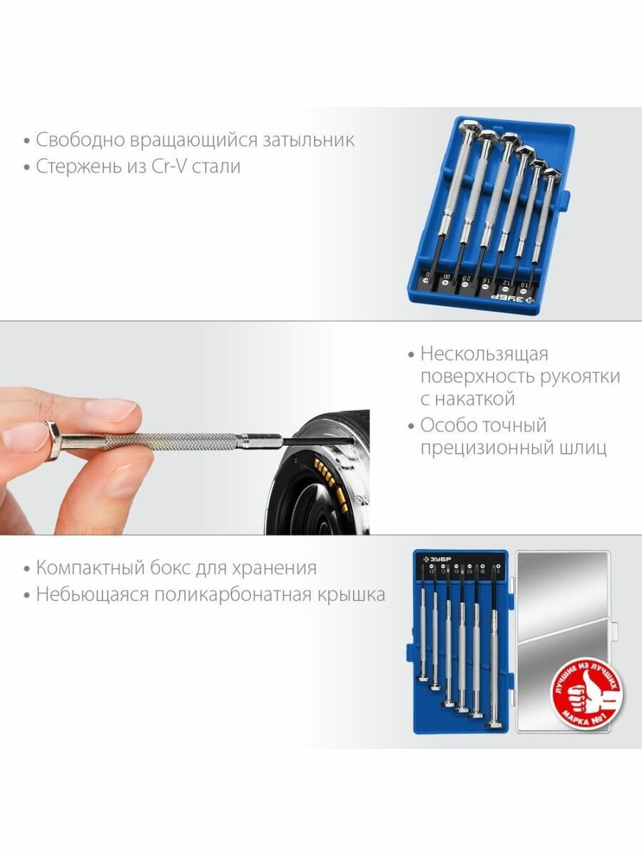 Набор часовых отвёрток «Зубр Часовщик» состоит из 6 предметов и предназначен для выполнения высокоточных механических работ, таких как монтаж электроаппаратуры, сборка и ремонт часов.Преимущества Стержни из хромованадиевой стали обеспечивают прочность и долговечность инструмента Затыльник рукояток свободно вращается, что облегчает закручивание и повышает точность работ Специальная закалка по особой технологии гарантирует высокую твёрдость и износостойкость В набор входят шесть различных часовых отвёрток для разных видов работ Удобная упаковка облегчает хранение и транспортировку инструмента