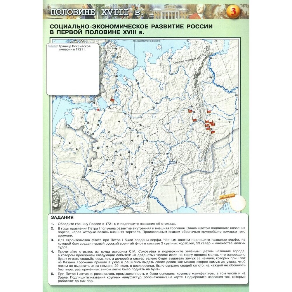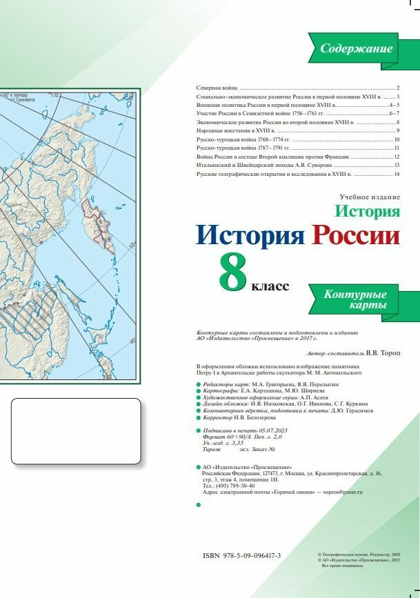 Контурные карты являются составной частью учебно-методического комплекта "История России. 8 класс" (авторы учебника Н. М. Арсентьев, А. А. Данилов, И. В. Курукин, А. Я. Токарева) и представляют собой современное учебное картографическое издание. Цветные контурные карты выполнены в технике объемного изображения рельефа. К каждой карте предлагается система заданий разных типов и уровней сложности, ориентированных как на закрепление основных исторических знаний и формирование базовых навыков, так и на развитие аналитических способностей школьников. Контурные карты могут быть использованы с любым из действующих учебников по истории для 8 класса.