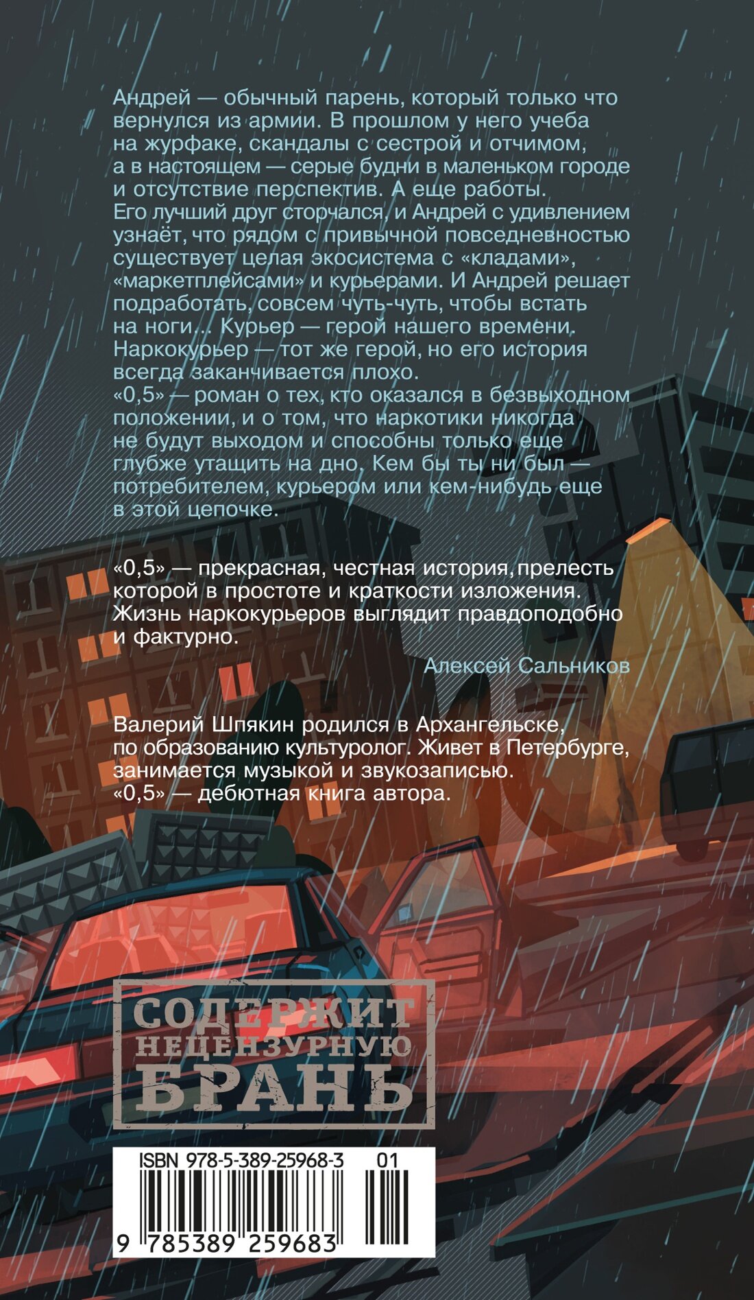 Андрей — обычный парень, который только что вернулся из армии. В прошлом у него учеба на журфаке, скандалы с сестрой и отчимом, а в настоящем — серые будни в маленьком городе и отсутствие перспектив. А еще работы. Его лучший друг сторчался, и Андрей с удивлением узнаёт, что рядом с привычной повседневностью существует целая экосистема с «кладами», «маркетплейсами» и курьерами. И Андрей решает подработать, совсем чуть-чуть, чтобы встать на ноги… Курьер — герой нашего времени. Наркокурьер — тот же герой, но его история всегда заканчивается плохо. «0,5» — роман о тех, кто оказался в безвыходном положении, и о том, что наркотики никогда не будут выходом и способны только еще глубже утащить на дно. Кем бы ты ни был — потребителем, курьером или кем-нибудь еще в этой цепочке. «„0,5“ — прекрасная, честная история, чья прелесть в простоте и краткости изложения. Жизнь наркокурьеров выглядит правдоподобно и фактурно» (Алексей Сальников). Валерий Шпякин родился в Архангельске, по образованию культуролог. Живет в Петербурге, занимается музыкой и звукозаписью. «0,5» — дебютная книга автора.