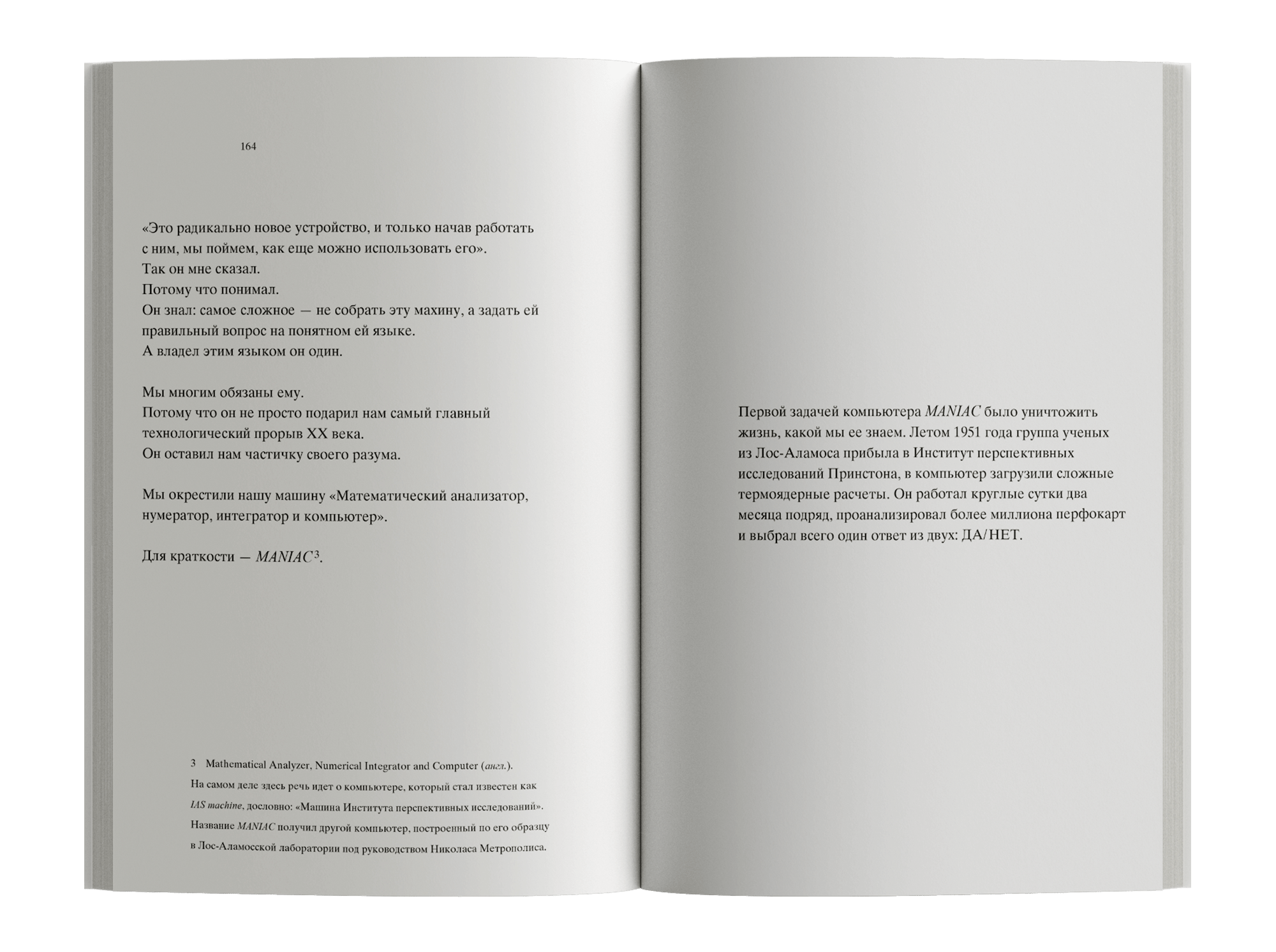Центральное место автор отводит биографии математика-вундеркинда Джона фон Неймана, участника Манхэттенского проекта и создателя архитектуры вычислительных машин, на основе которой был построен один из первых компьютеров — MANIAC.