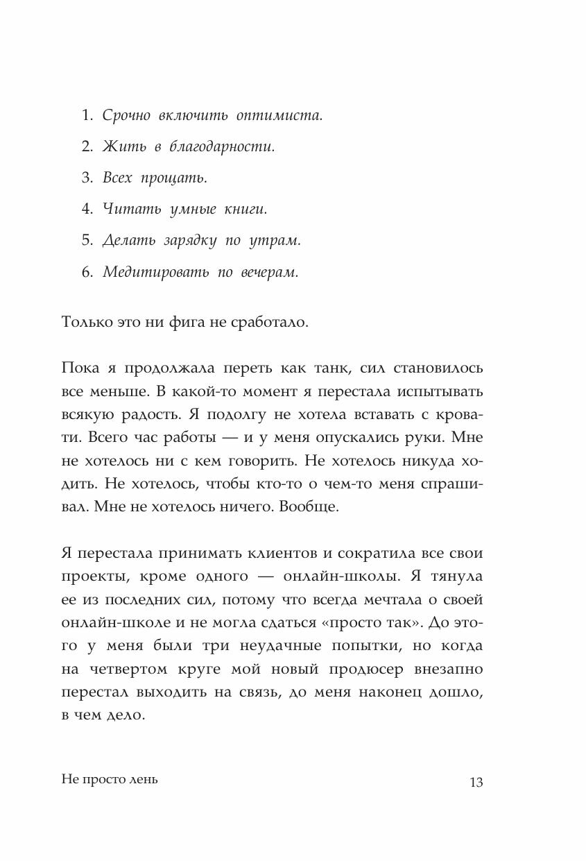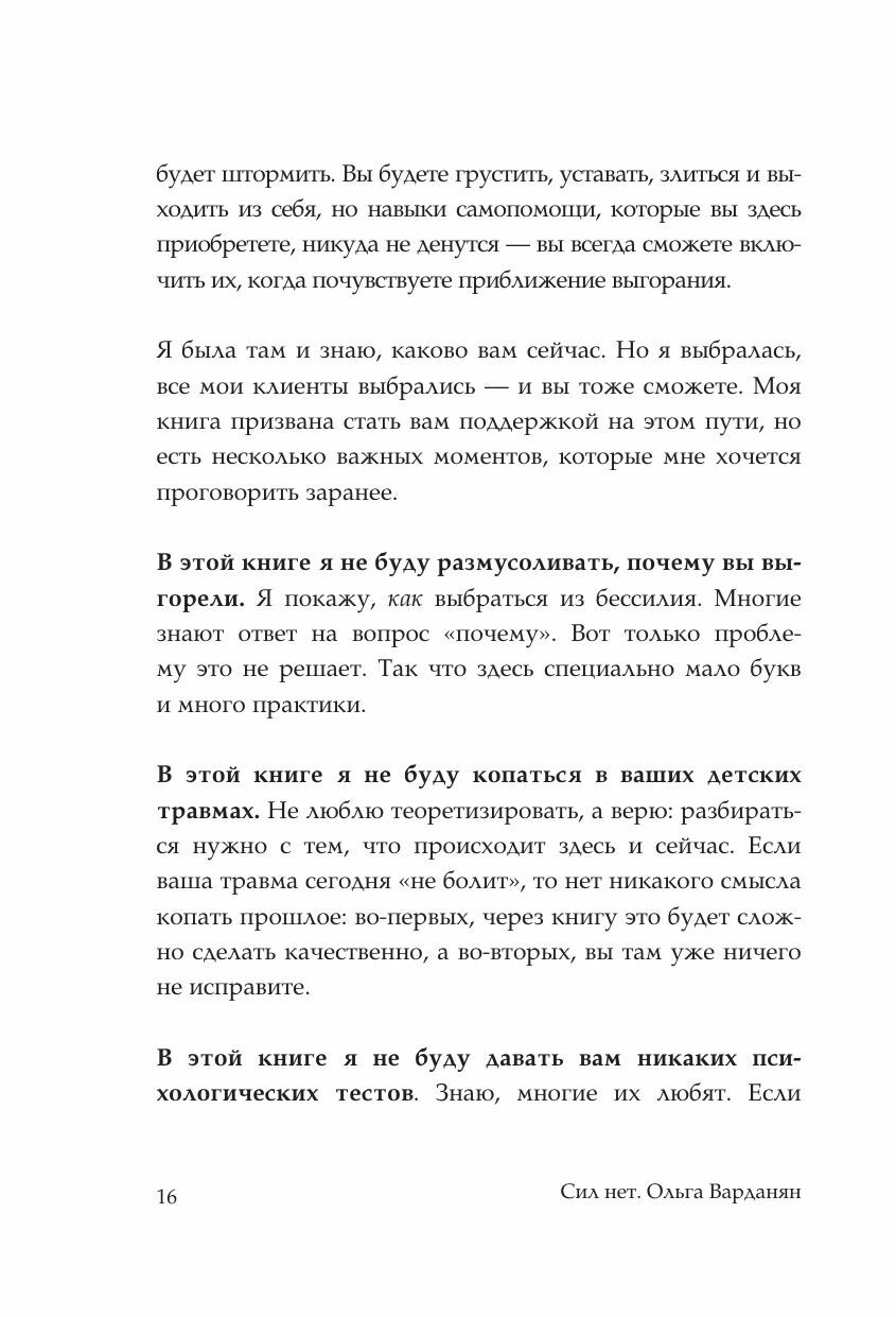 «В этой книге мы не будем разбираться, почему вы выгорели. Не будем копаться в ваших детских травмах — и проводить миллион психологических тестов. Я знаю, что вы устали. Сильно устали. И хотите быстрее вернуться в колею.