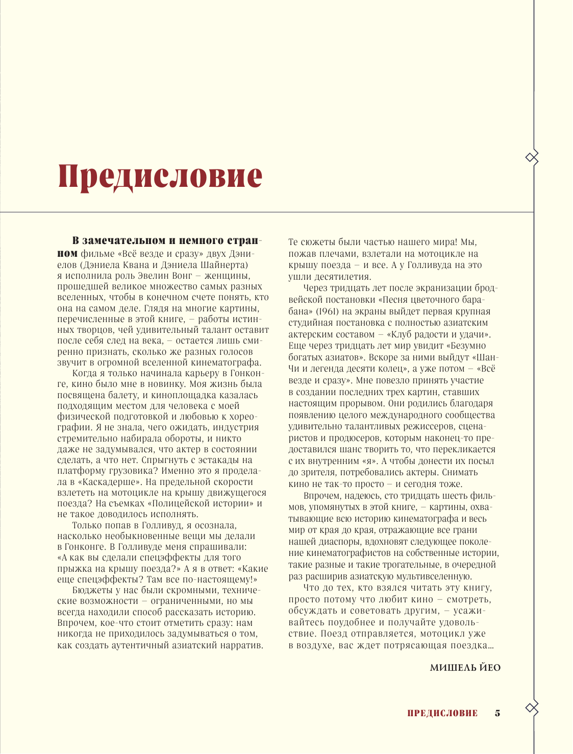 «Только попав в Голливуд, я осознала, насколько необыкновенные вещи мы делали в Гонконге. В Голливуде меня спрашивали: «А как вы сделали спецэффекты для того прыжка на крышу поезда?» А я в ответ: «Какие еще спецэффекты? Там все по-настоящему!» — Из предисловия Мишель Йео (Обладательница премии «Оскар» за главную женскую роль в фильме «Все везде и сразу»)