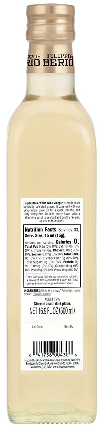 Уксус винный FILIPPO BERIO белый оптимально подходит для маринования мясных и рыбных блюд, а также может использоваться в качестве приправы. Он изготовлен из сортового белого вина и обладает насыщенным пикантным вкусом и богатым ароматом с утонченными цветочными нотками.