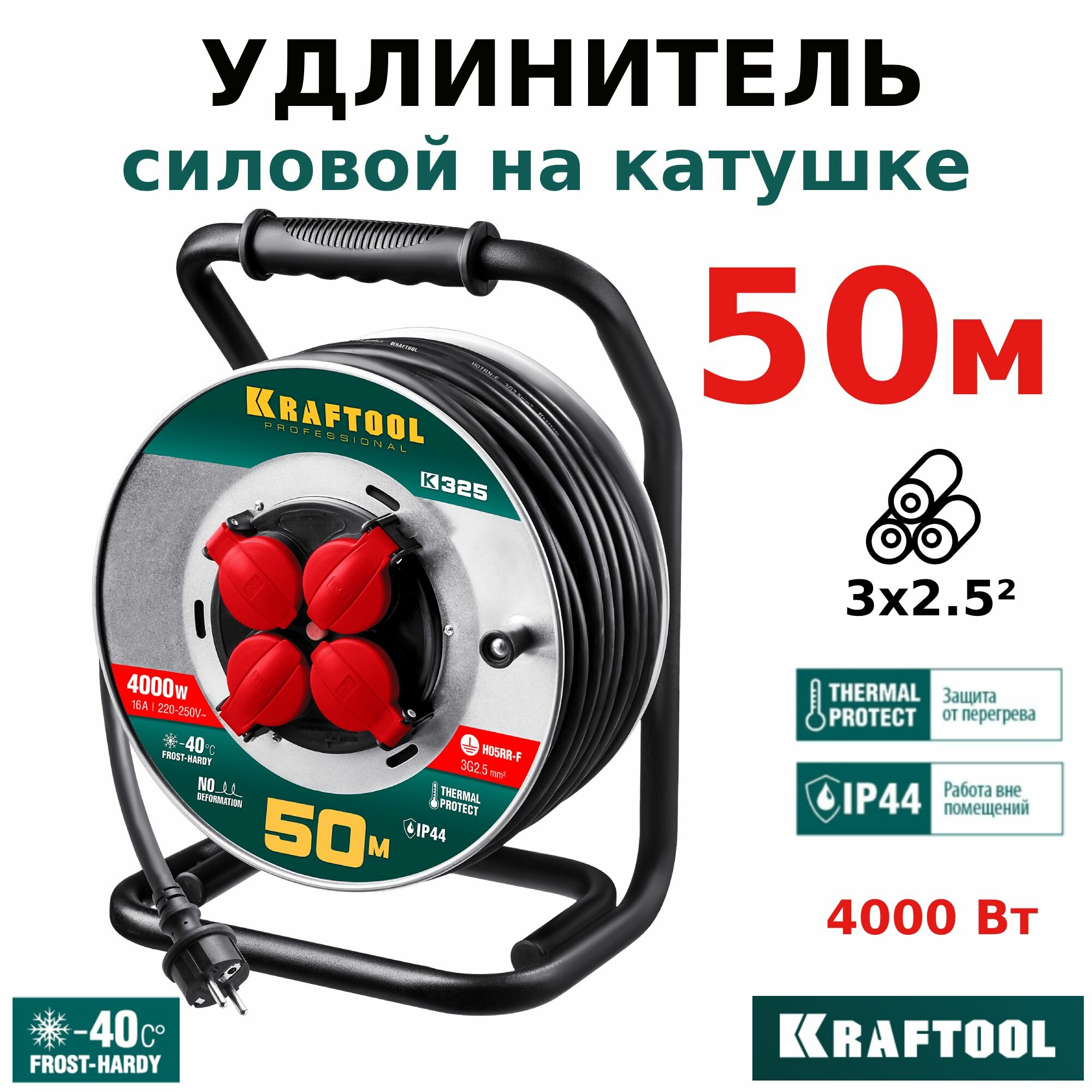 Силовой удлинитель на стальной катушке Kraftool K-325 — это высококачественный продукт, предназначенный для профессионального использования.Преимущества Удлинитель оснащён четырьмя розетками и термопредохранителем, обеспечивающим безопасность работы Максимальная нагрузка составляет 4000 Вт, что позволяет использовать его для подключения мощных электроприборов Изоляция провода выполнена из резины, устойчивой к низким температурам и агрессивным средам Пылевлагозащита IP44 обеспечивает защиту от пыли и брызг воды, что делает удлинитель подходящим для использования на открытом воздухе или в условиях повышенной влажности Провод КГ с резиновой изоляцией, устойчивый к низким температурам, агрессивным средам и механическим воздействиям Удобное крепление кабеля к клеммам, предотвращающее нагрев и искрение