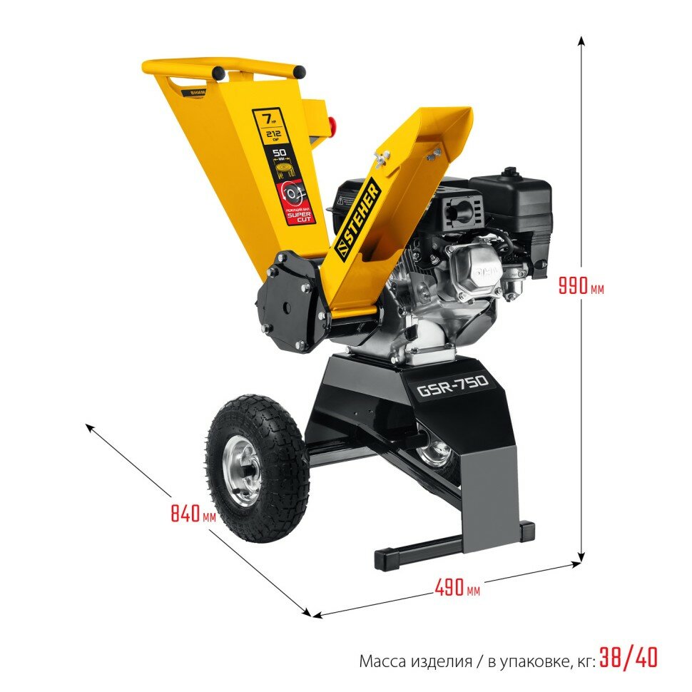 Steher GSR-750 - высокопроизводительный компактный измельчитель древесного материала диаметром до 50 мм.Преимущества Мощный четырехтактный двигатель STEHER надежен в эксплуатации Система режущий вал с 2 ножами обеспечивают высокую производительность Режущие ножи из закаленной стали с двухсторонней заточкой обеспечивают отличную режущую способность Колеса большого диаметра увеличивают мобильность и облегчают эксплуатацию изделия Большая воронка облегчает загрузку веток Металлическая конструкция измельчителя обеспечивает надежность и длительный срок службы