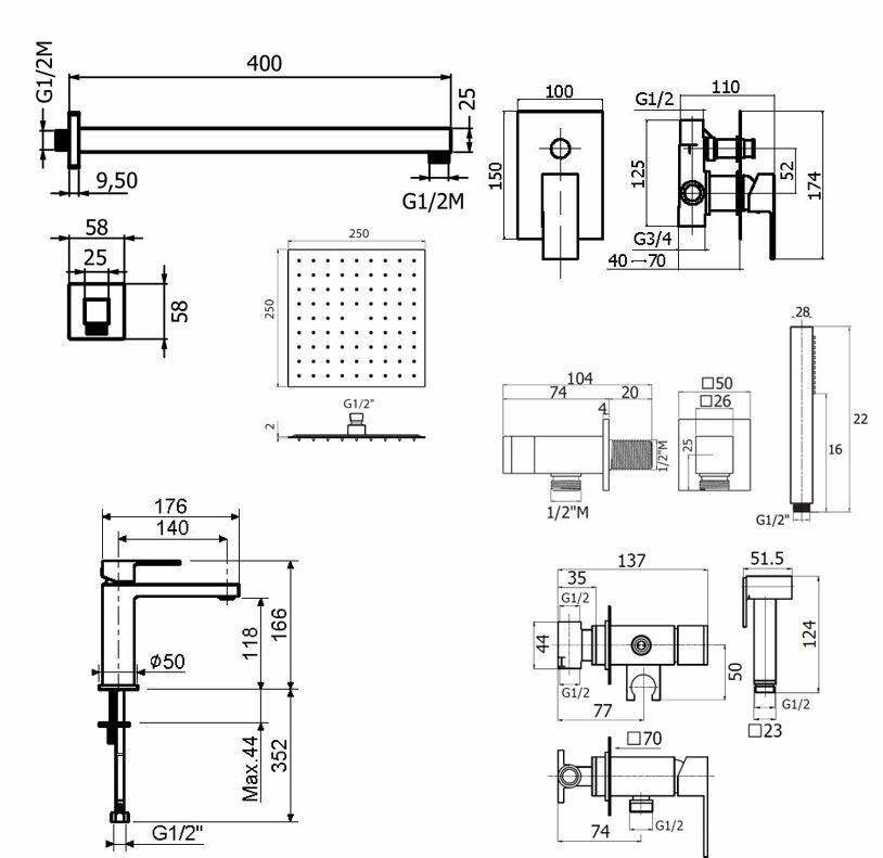 | Состав комплекта | верхний душ, смеситель, гигиенический душ, шланговое подключение, душевой гарнитур |