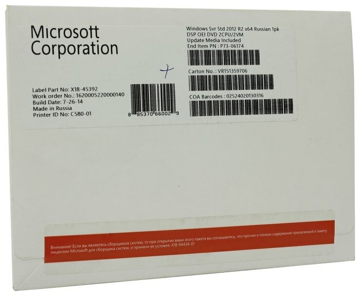 Программное обеспечение MICROSOFT Win Svr Std 2012 Rus 64bit 1pk DSP OEI DVD 2CPU/2VM+id839057 [p73-06174-l]