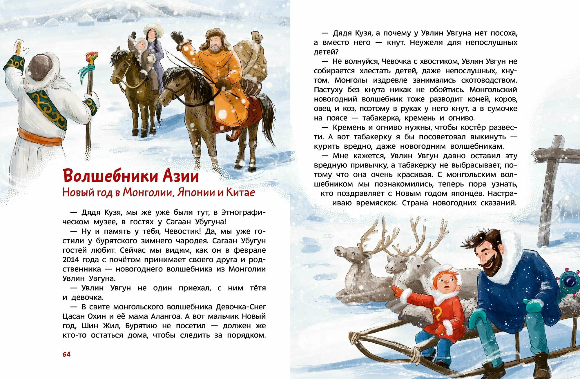 В этой энциклопедии Чевостик и дядя Кузя познакомятся с новогодними и рождественскими волшебниками разных народов и стран. Они совершат путешествие по регионам нашей страны(от Поволжья до полуострова Ямал), узнают, какие зимние волшебники существуют в Европе и Азии, встретятся с Санта-Клаусом, Дедом Морозом и многими другими героями новогодних сказаний.