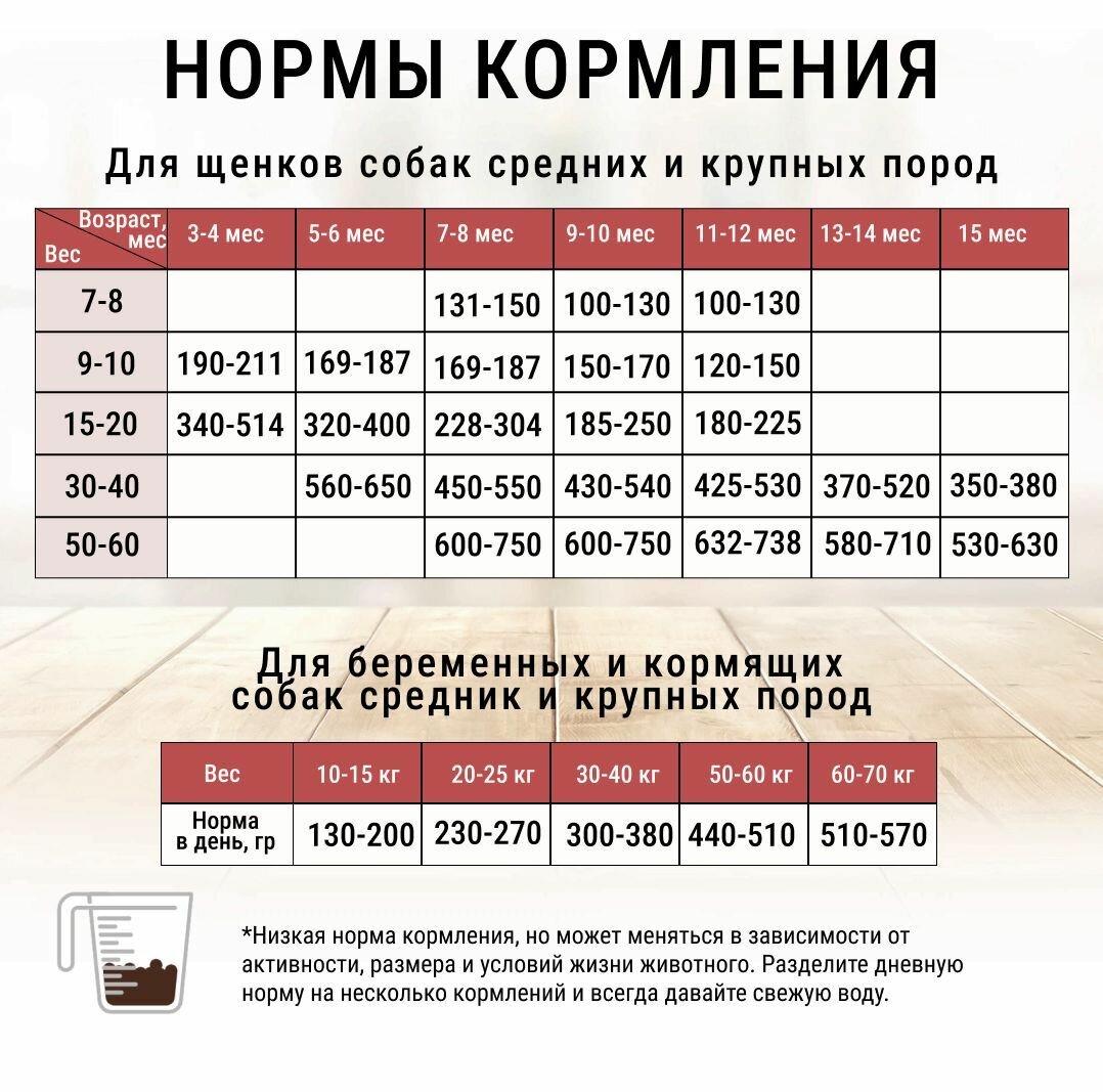 | Инструкция по кормлению | Для взрослых собак 30-150 гр. в день. Норма кормления может меняться в зависимости от активности, размера и условий жизни животного. Разделите дневную норму на несколько кормлений и всегда давайте свежую воду. |