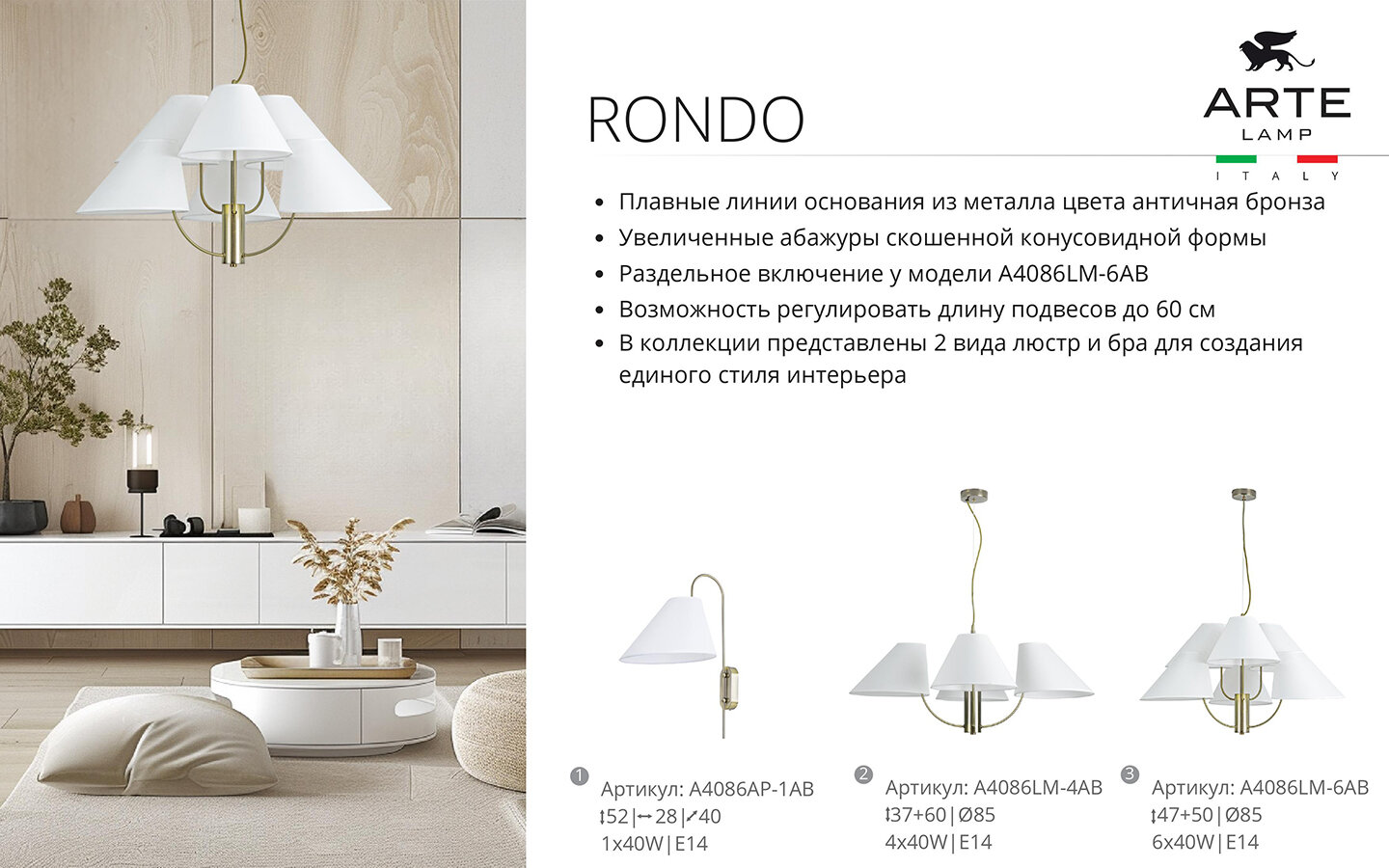 Подвесная люстра Arte Lamp серии RONDO Неоклассика. Подчеркнет стиль помещения. Высота 47 cm. Диаметр 85 cm Параметры пылевлагозащиты IP 20. Форма декоративная. Плафон текстильный белого цвета, а материал/цвет арматуры металл/хром. Использует лампу с цоколем E14. Площадь освещения охватывает 8 m?. Идеально подходит для гостиной или спальни. Страна происхождения бренда Италия. Максимальная мощность лампы: 40Вт. Лампы в комплект не входят.