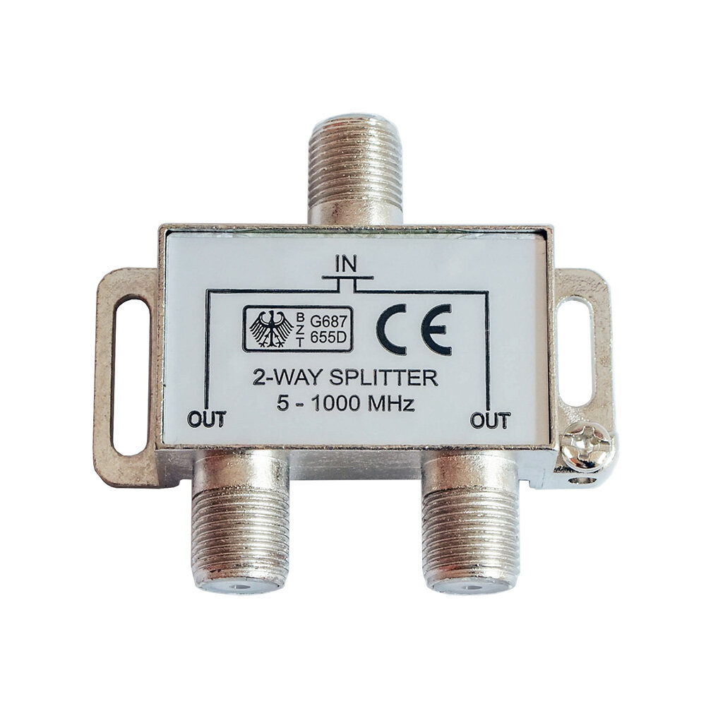Разветвитель на 2 TV предназначен для деления сигнала, идущего от эфирной антенны на два телевизора с помощью F-разъемов. Представляет собой устройство, заключенное в металлический корпус, оснащенный несколькими разъемами для подключения телевизионных кабелей. Равномерно распределяет сигнал от внешнего источника на нужное количество выходов, к которым подключаются телевизоры или другие приемники ТВ-сигнала (подключение по схеме «звезда»). При встраивании делителя в систему нет необходимости в пайке контактов. Кабели обжимаются при помощи F-штекеров и легко накручиваются на резьбу разъемов сплиттера (входят в комплект) Характеристики устройства Разъем на входе — F-гнездо. Разъем на выходе — F-гнездо. Диапазон частот — 5-1000 МГц Преимущества использования сплиттера Минимальное затухание сигнала. В отличие от последовательной схемы подключения (через проходные розетки) поломка одной из линий или розеток не нарушает работу других. Антенные кабели имеют одну точку выхода.