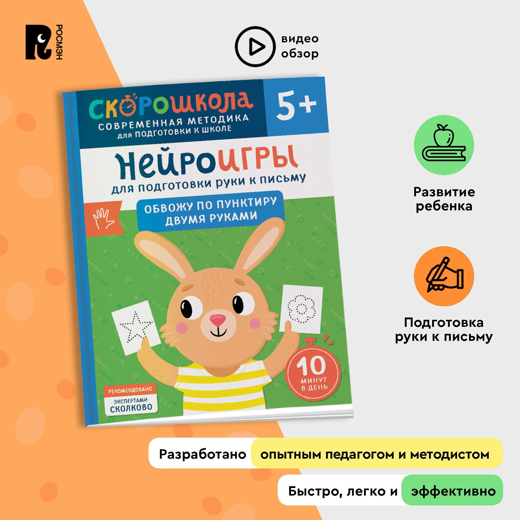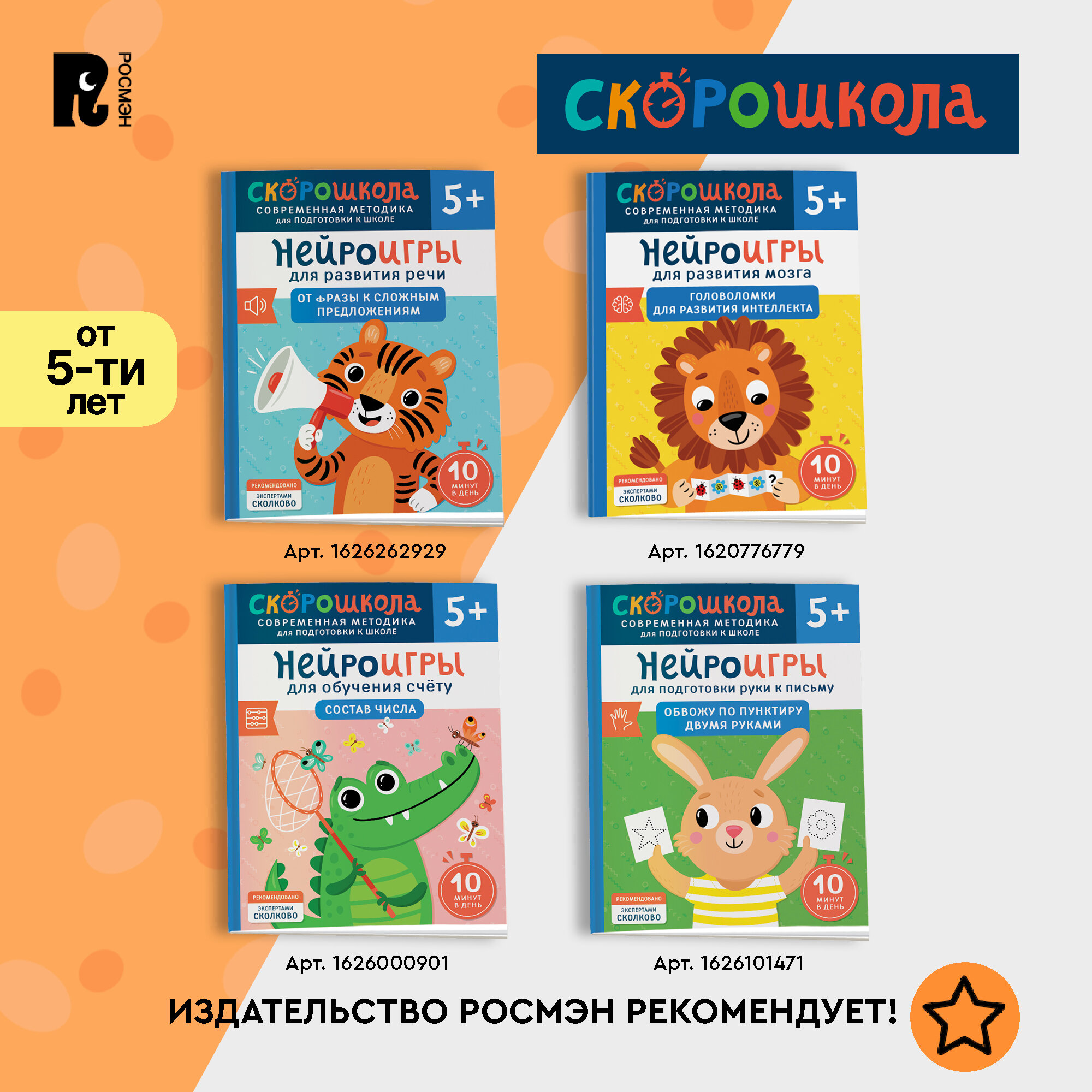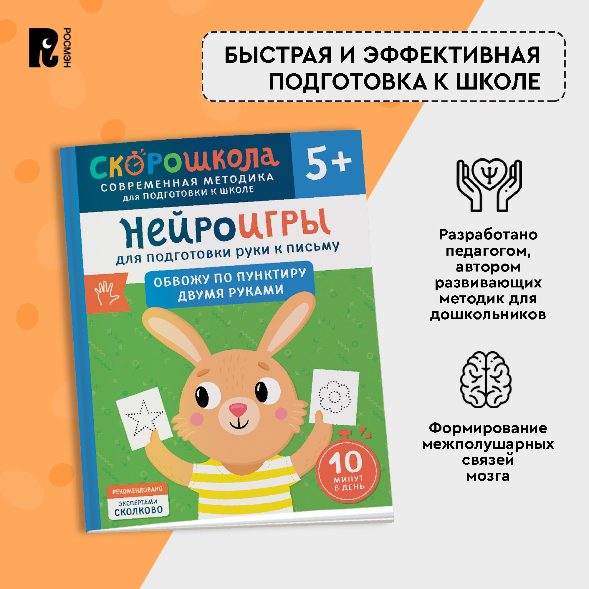 Скорошкола – это поэтапная система развития навыков с трех лет и до первого класса с понятной инструкцией для родителей, основанная на самых современных исследованиях о работе мозга.В серии "Нейроигры для развития речи" собран полный курс для развития красивой связной речи, начиная от умения различать звуки на слухи тренировки артикуляции и до состава сложных предложений, грамматических согласований. Работая по "От звука к слову", ребенок научится произносить простые слова, разовьет слуховое внимание и пополнит предметный и глагольный словарь.Автор Елена Молчанова — логопед-дефектолог, педагог, специалист по запуску речи и развитию слухового внимания.Книжки для малышей содержат разнообразные материалы для подготовки к школе. Благодаря этим развивашкам ребенок сможет усовершенствовать свои навыки письма и математики до начала учебного года.Также в ассортименте присутствуют тренировочные пособия — пиши-стирай тетрадь, многоразовые прописи и каллиграфические прописи. В нем есть книжки и букварь, в котором представлены прописи и цифры. Они помогут первокласснику освоить правильное написание букв и слов. Кроме того, тренажер по чтению научит читать по слогам, что способствует развитию логики и обогащению словарного запаса.Этот набор - отличный подарок ребенку перед началом учебы. Он содержит все необходимое для грамотной подготовки к школьным занятиям и поможет сформировать базовые знания эмоционального интеллекта и мягких навыков уже на дошкольном этапе обучения.
