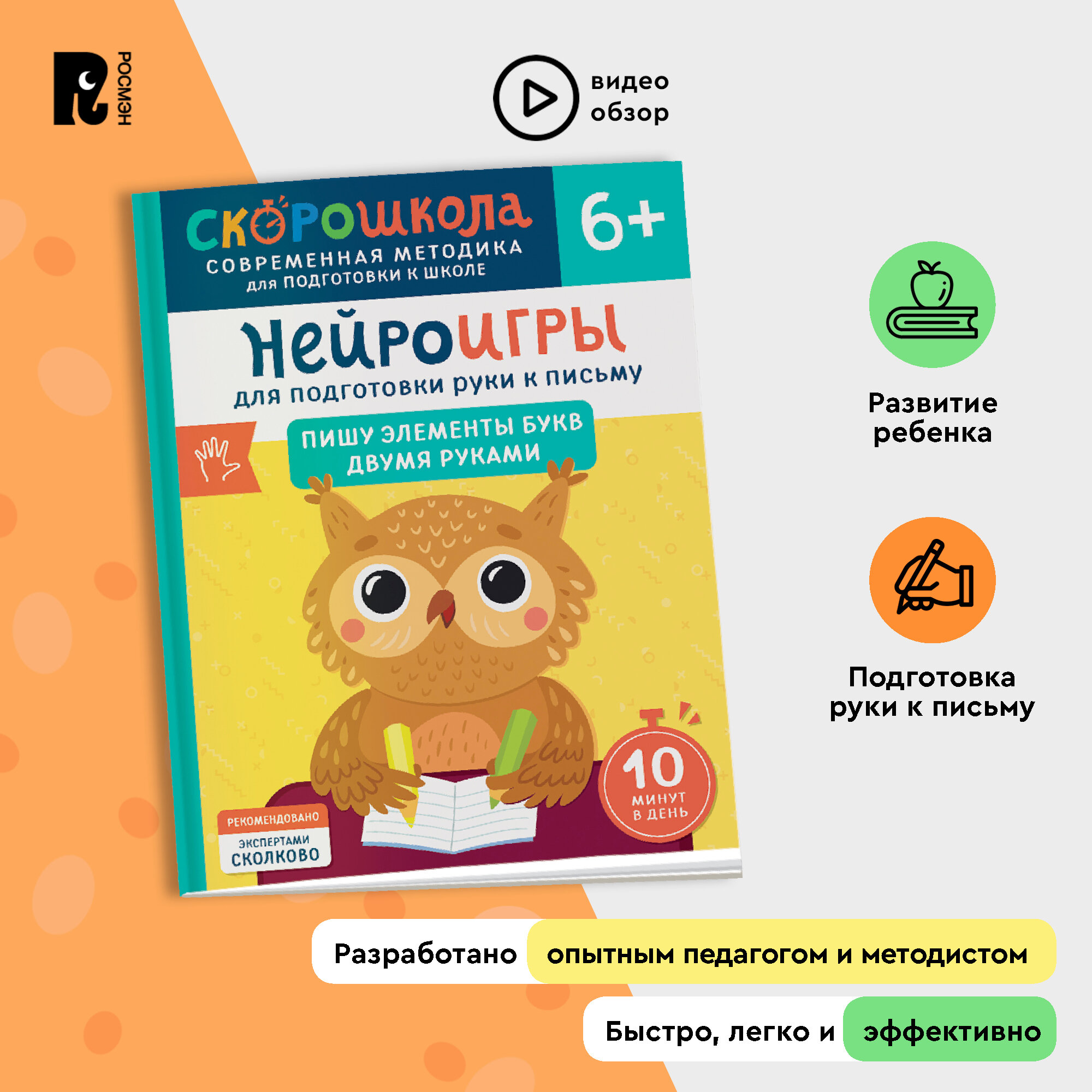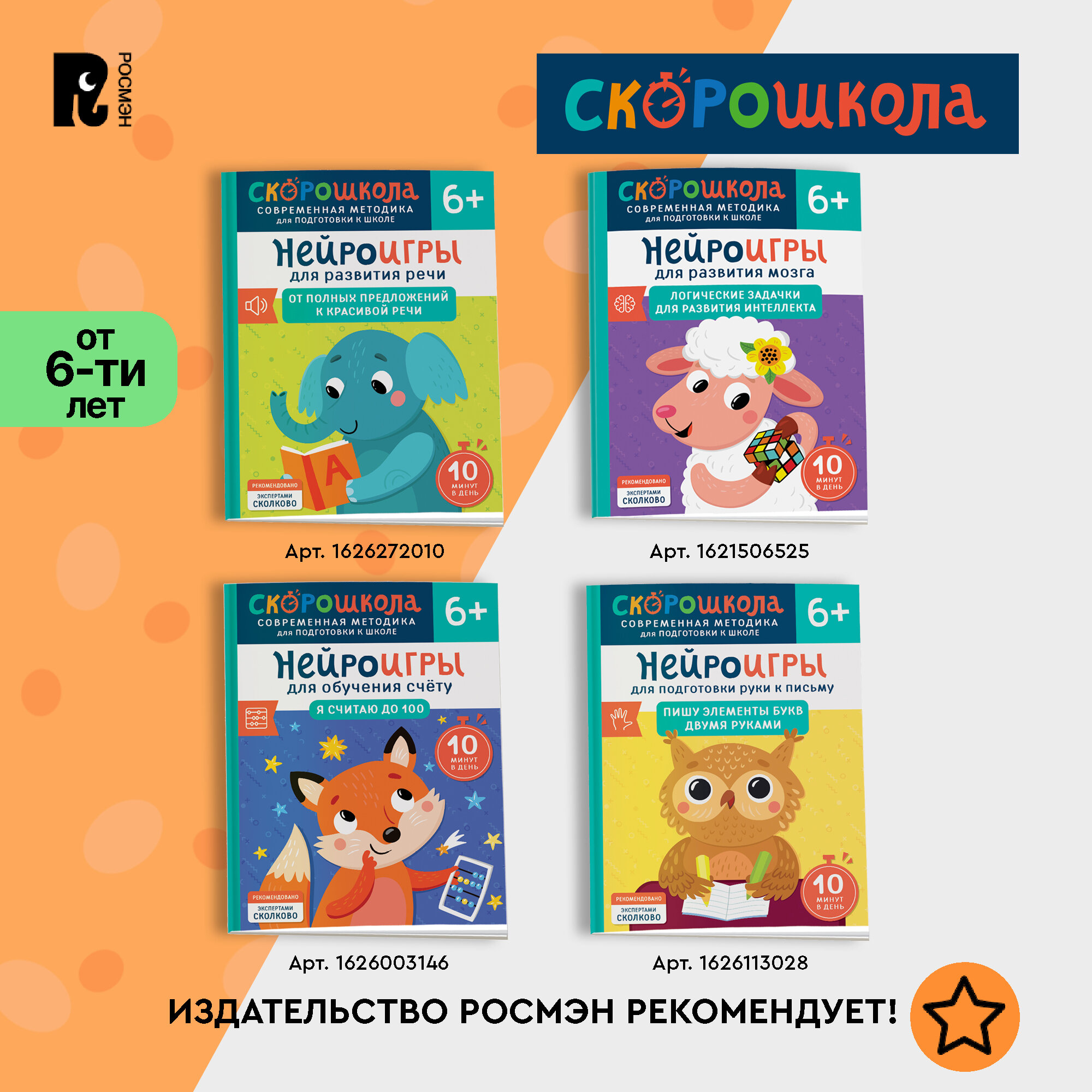 Скорошкола – это поэтапная система развития навыков с трех лет и до первого класса с понятной инструкцией для родителей, основанная на самых современных исследованиях о работе мозга.В серии "Нейроигры для развития речи" собран полный курс для развития красивой связной речи, начиная от умения различать звуки на слухи тренировки артикуляции и до состава сложных предложений, грамматических согласований. Работая по "От звука к слову", ребенок научится произносить простые слова, разовьет слуховое внимание и пополнит предметный и глагольный словарь.Автор Елена Молчанова — логопед-дефектолог, педагог, специалист по запуску речи и развитию слухового внимания.Книжки для малышей содержат разнообразные материалы для подготовки к школе. Благодаря этим развивашкам ребенок сможет усовершенствовать свои навыки письма и математики до начала учебного года.Также в ассортименте присутствуют тренировочные пособия — пиши-стирай тетрадь, многоразовые прописи и каллиграфические прописи. В нем есть книжки и букварь, в котором представлены прописи и цифры. Они помогут первокласснику освоить правильное написание букв и слов. Кроме того, тренажер по чтению научит читать по слогам, что способствует развитию логики и обогащению словарного запаса.Этот набор - отличный подарок ребенку перед началом учебы. Он содержит все необходимое для грамотной подготовки к школьным занятиям и поможет сформировать базовые знания эмоционального интеллекта и мягких навыков уже на дошкольном этапе обучения.