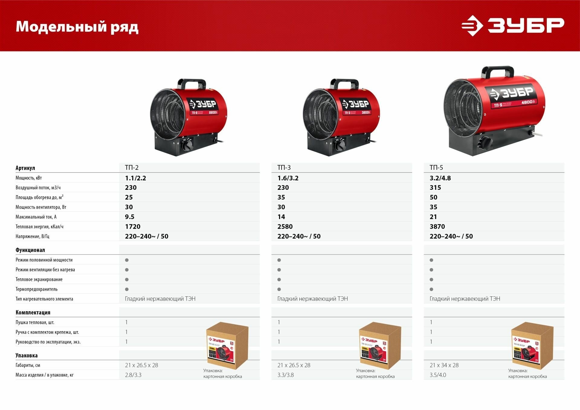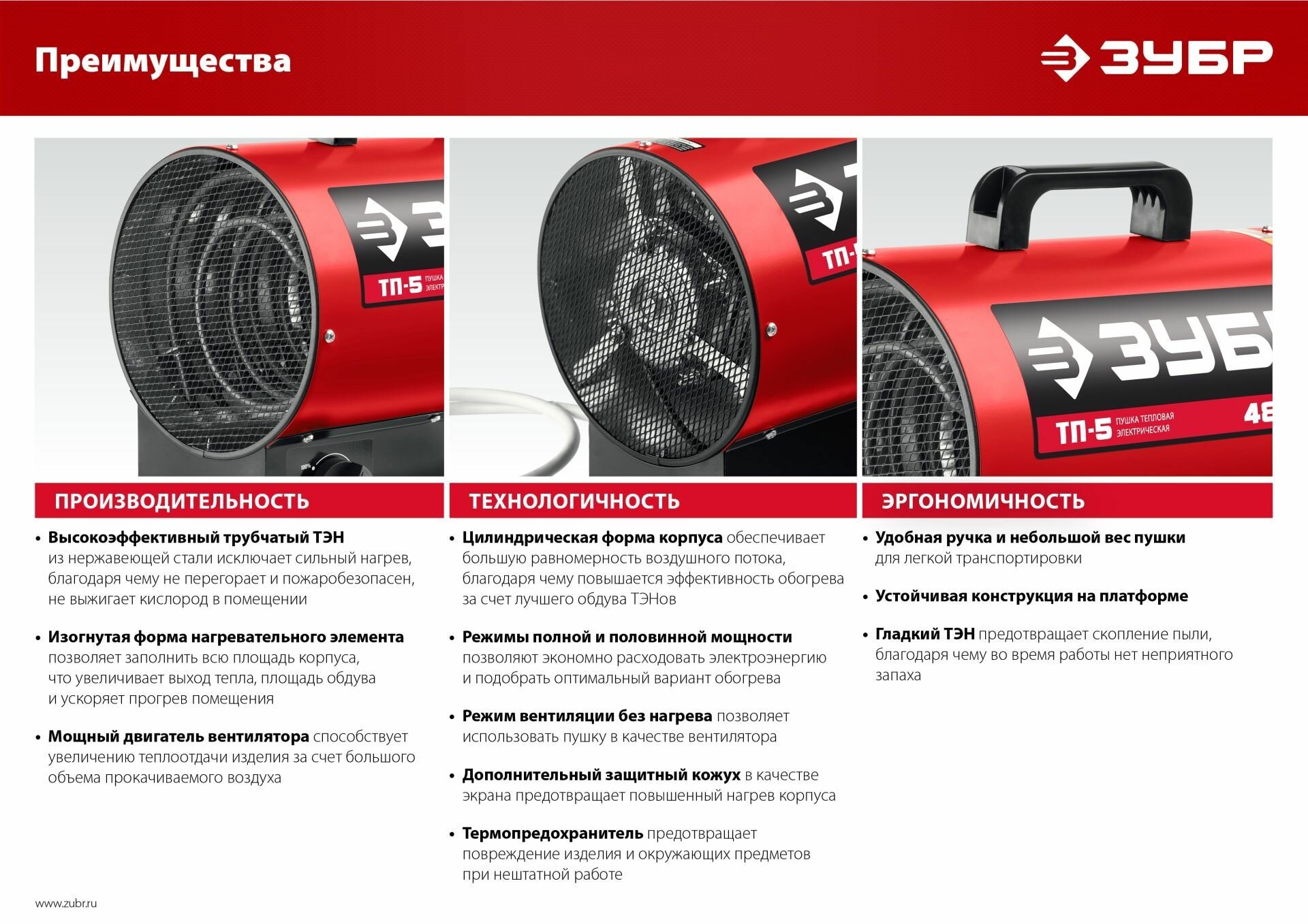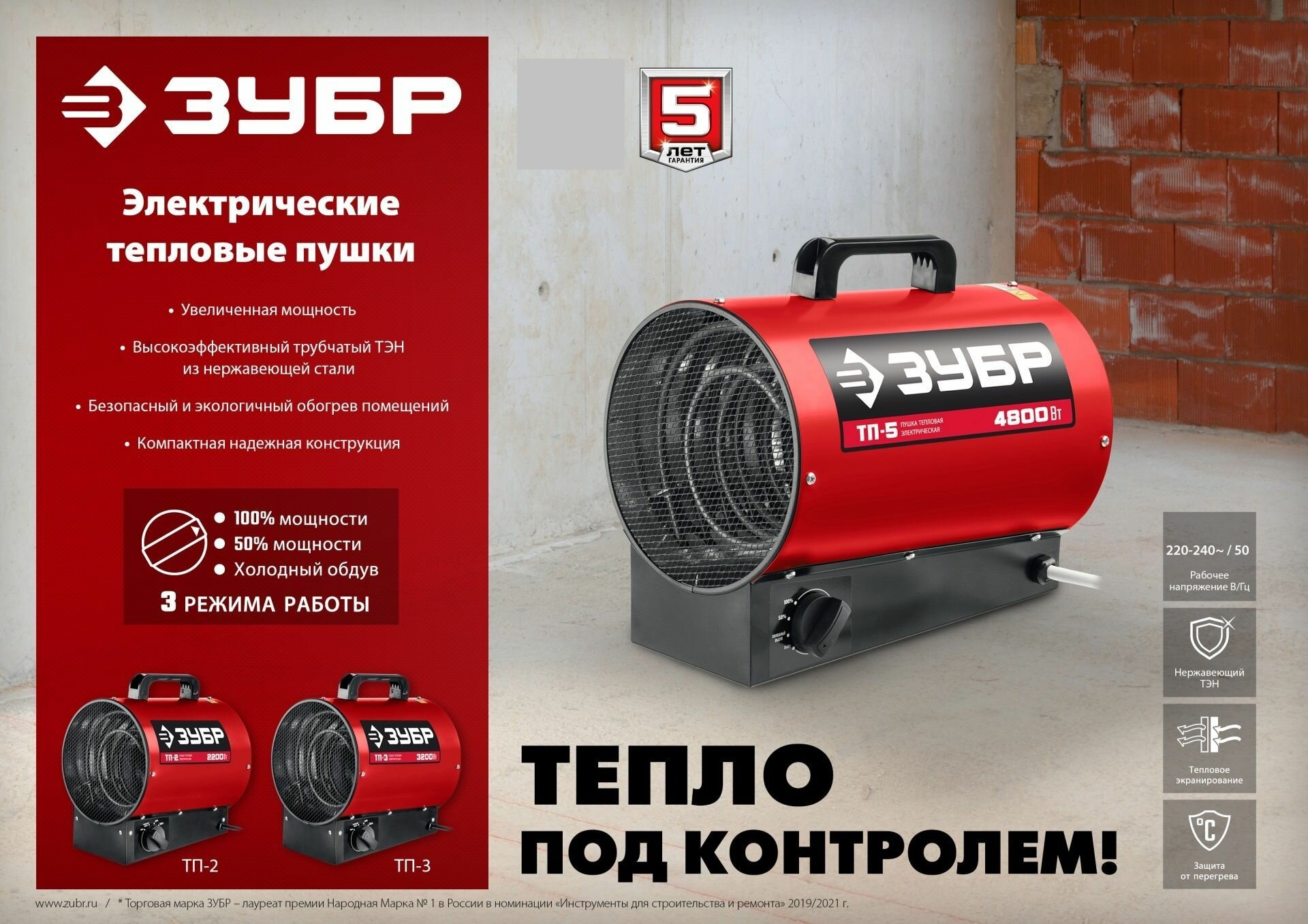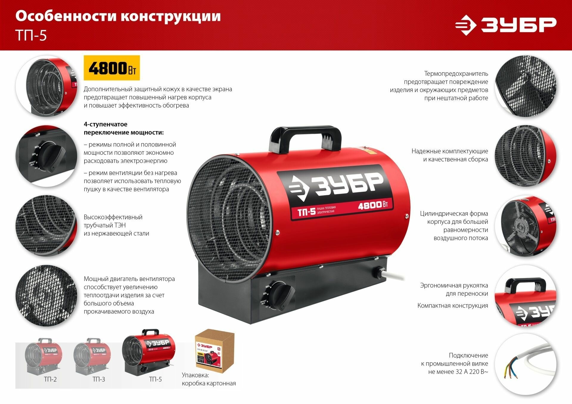 Компактный и легкий обогреватель ЗУБР ТП-5 в круглом корпусе для квартиры, загородного дома, мастерских гаражей и т.д. Предназначен для генерации горячего воздуха, который может быть использован для обогрева, сушки бытовых и промышленных помещений и т. д. Большая площадь ТЭНов и эффективный обдув способствуют более быстрому нагреву помещения. Конструктивные меры безопасности (дополнительный защитный кожух, термопредохранитель, заземление корпуса) защищают Вас и изделие при нештатных ситуациях. ЗУБР - тепло и уют Вашего дома.Преимущества Безопасная тепловая пушка для направленного обогрева Небольшие габариты и легкий вес Высокоэффективный трубчатый ТЭН из нержавеющей стали исключает сильный нагрев, благодаря чему не перегорает и пожаробезопасен, не выжигает кислород в помещении Изогнутая форма нагревательного элемента позволяет заполнить всю площадь корпуса, что увеличивает выход тепла, площадь обдува и ускоряет прогрев помещения Цилиндрическая форма корпуса для большей равномерности воздушного потока, благодаря чему повышается эффективность обогрева за счет лучшего обдува ТЭНов Термопредохранитель предотвращает повреждение изделия и окружающих предметов при нештатной работе Дополнительный защитный кожух в качестве экрана предотвращает повышенный нагрев корпуса Мощный двигатель вентилятора способствует увеличению теплоотдачи изделия за счет большого объема прокачиваемого воздуха За счет универсальной опоры тепловая пушка легко перемещается и устанавливается В жаркую погоду может служить как вентилятор