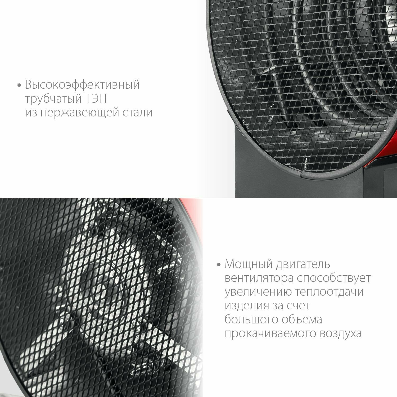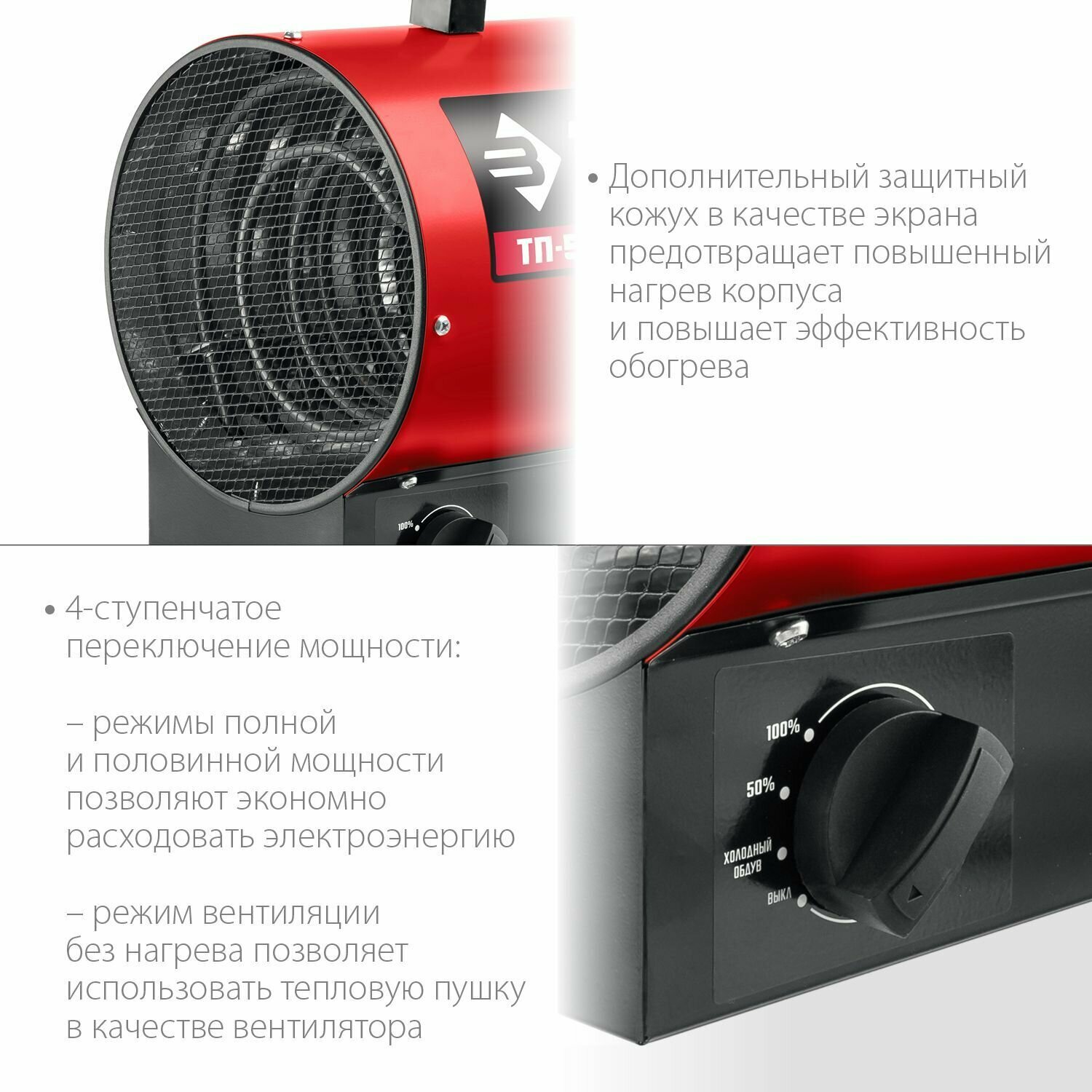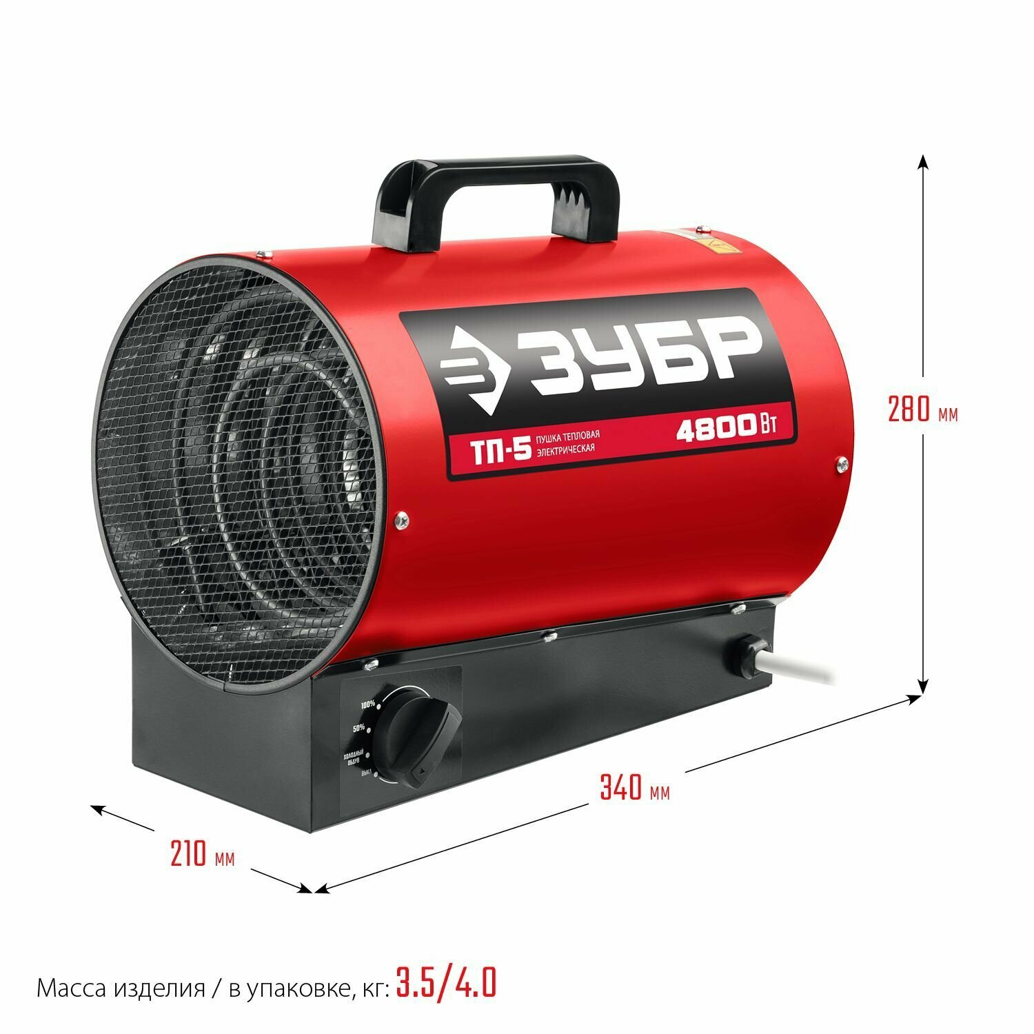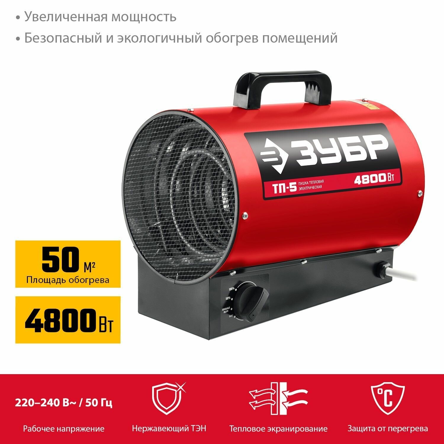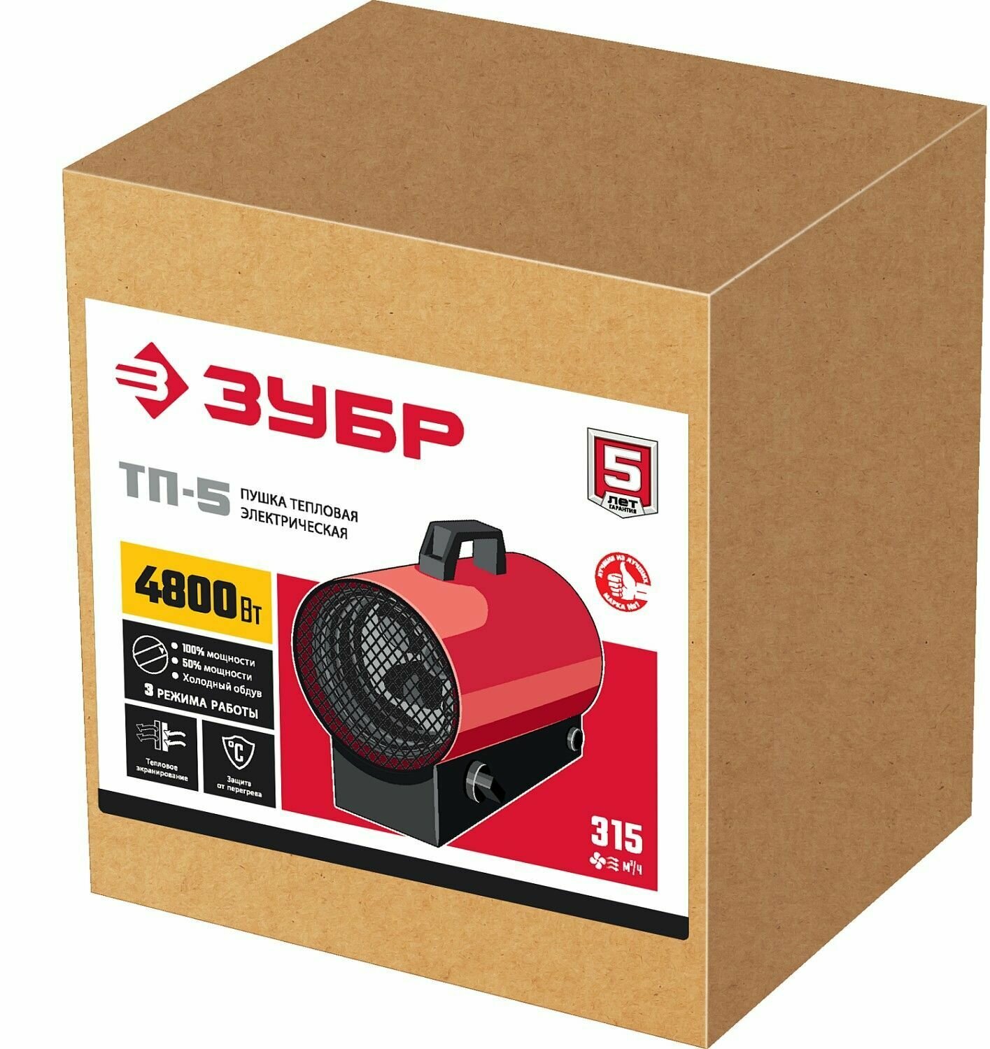 Компактный и легкий обогреватель ЗУБР ТП-5 в круглом корпусе для квартиры, загородного дома, мастерских гаражей и т.д. Предназначен для генерации горячего воздуха, который может быть использован для обогрева, сушки бытовых и промышленных помещений и т. д. Большая площадь ТЭНов и эффективный обдув способствуют более быстрому нагреву помещения. Конструктивные меры безопасности (дополнительный защитный кожух, термопредохранитель, заземление корпуса) защищают Вас и изделие при нештатных ситуациях. ЗУБР - тепло и уют Вашего дома.Преимущества Безопасная тепловая пушка для направленного обогрева Небольшие габариты и легкий вес Высокоэффективный трубчатый ТЭН из нержавеющей стали исключает сильный нагрев, благодаря чему не перегорает и пожаробезопасен, не выжигает кислород в помещении Изогнутая форма нагревательного элемента позволяет заполнить всю площадь корпуса, что увеличивает выход тепла, площадь обдува и ускоряет прогрев помещения Цилиндрическая форма корпуса для большей равномерности воздушного потока, благодаря чему повышается эффективность обогрева за счет лучшего обдува ТЭНов Термопредохранитель предотвращает повреждение изделия и окружающих предметов при нештатной работе Дополнительный защитный кожух в качестве экрана предотвращает повышенный нагрев корпуса Мощный двигатель вентилятора способствует увеличению теплоотдачи изделия за счет большого объема прокачиваемого воздуха За счет универсальной опоры тепловая пушка легко перемещается и устанавливается В жаркую погоду может служить как вентилятор