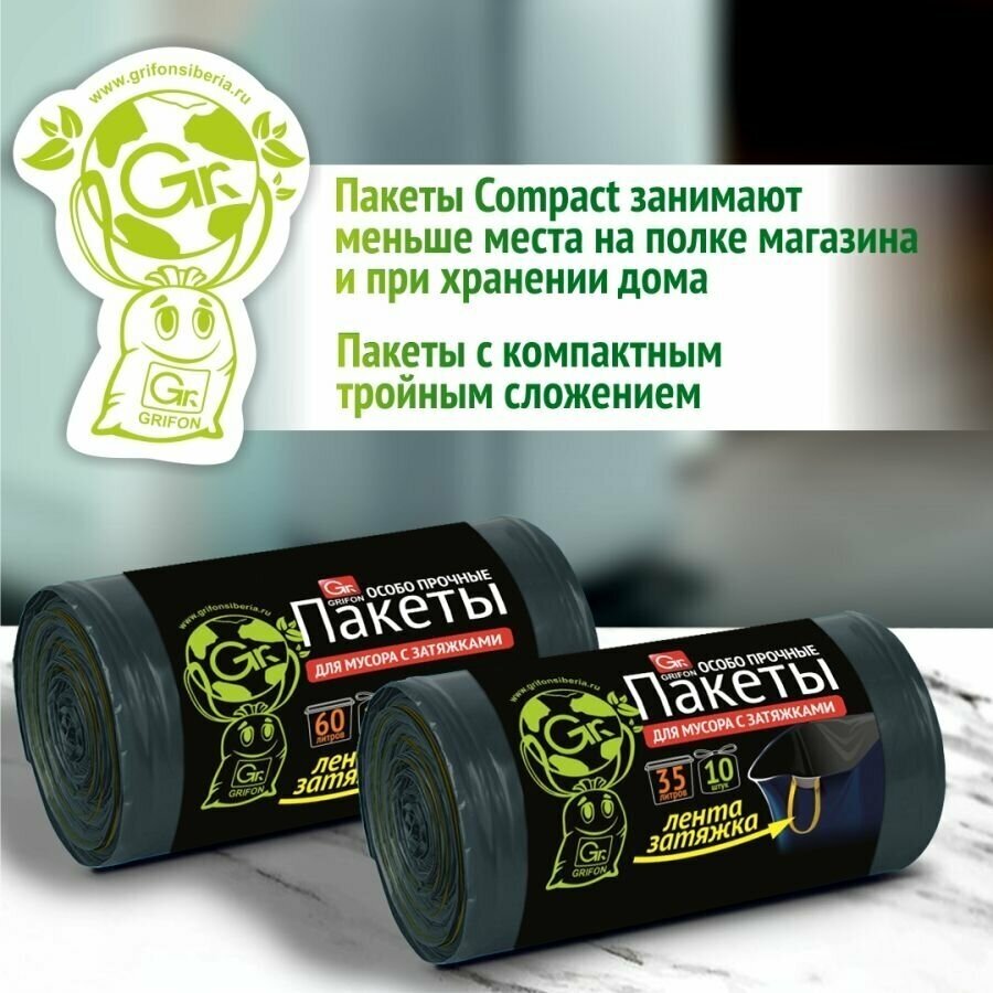 Пакеты для мусора грифон с завязками. Объем 35л. В рулоне 10 шт. Мешки для мусора позволяют собирать и утилизировать отходы более удобно и гигиенично.