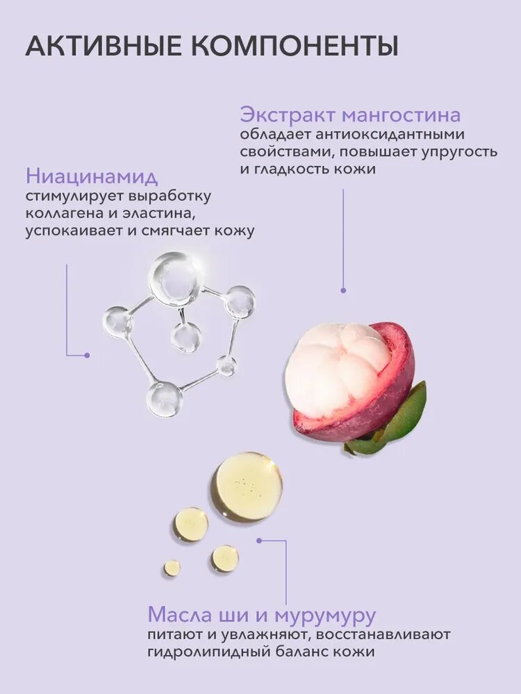 | Особенности | Ниацинамид стимулирует выработку коллагена и эластина, успокаивает и смягчает кожу. Масла ши и мурумуру питают и увлажняют, восстанавливают гидролипидный баланс кожи. \Экстракт мангостина обладает антиоксидантными свойствами, повышает упругость и гладкость кожи. |