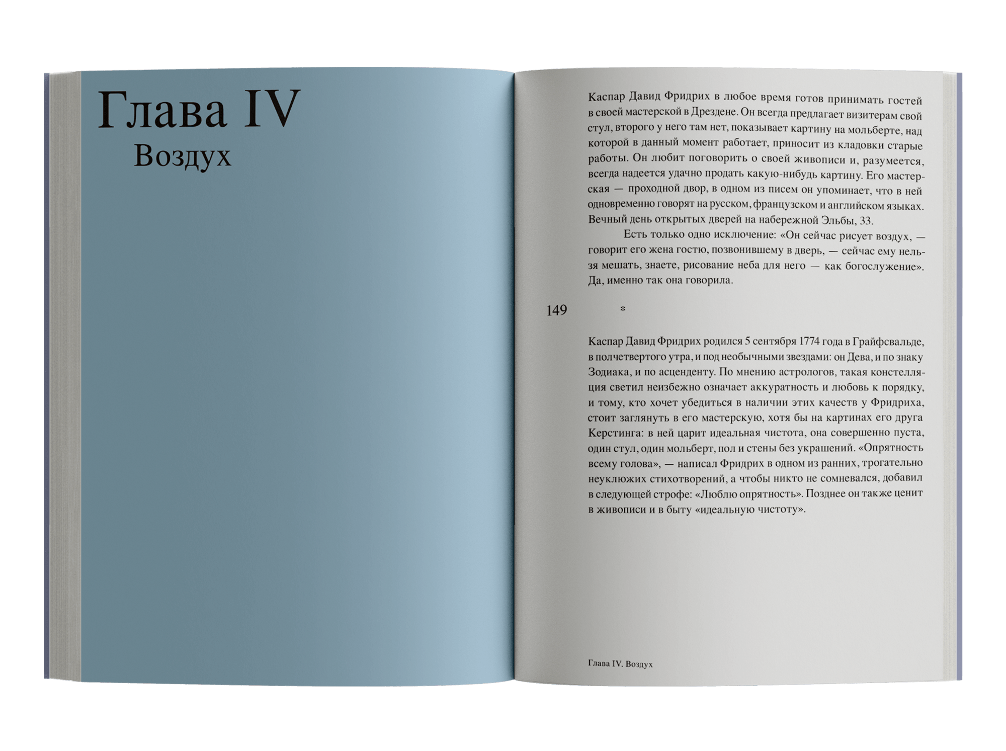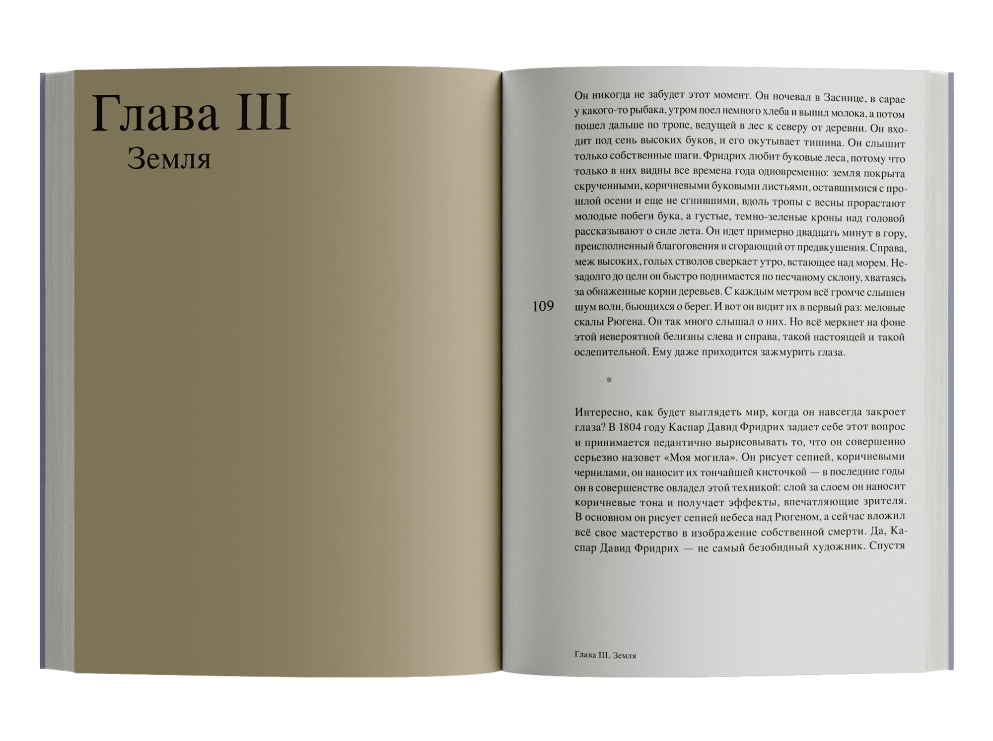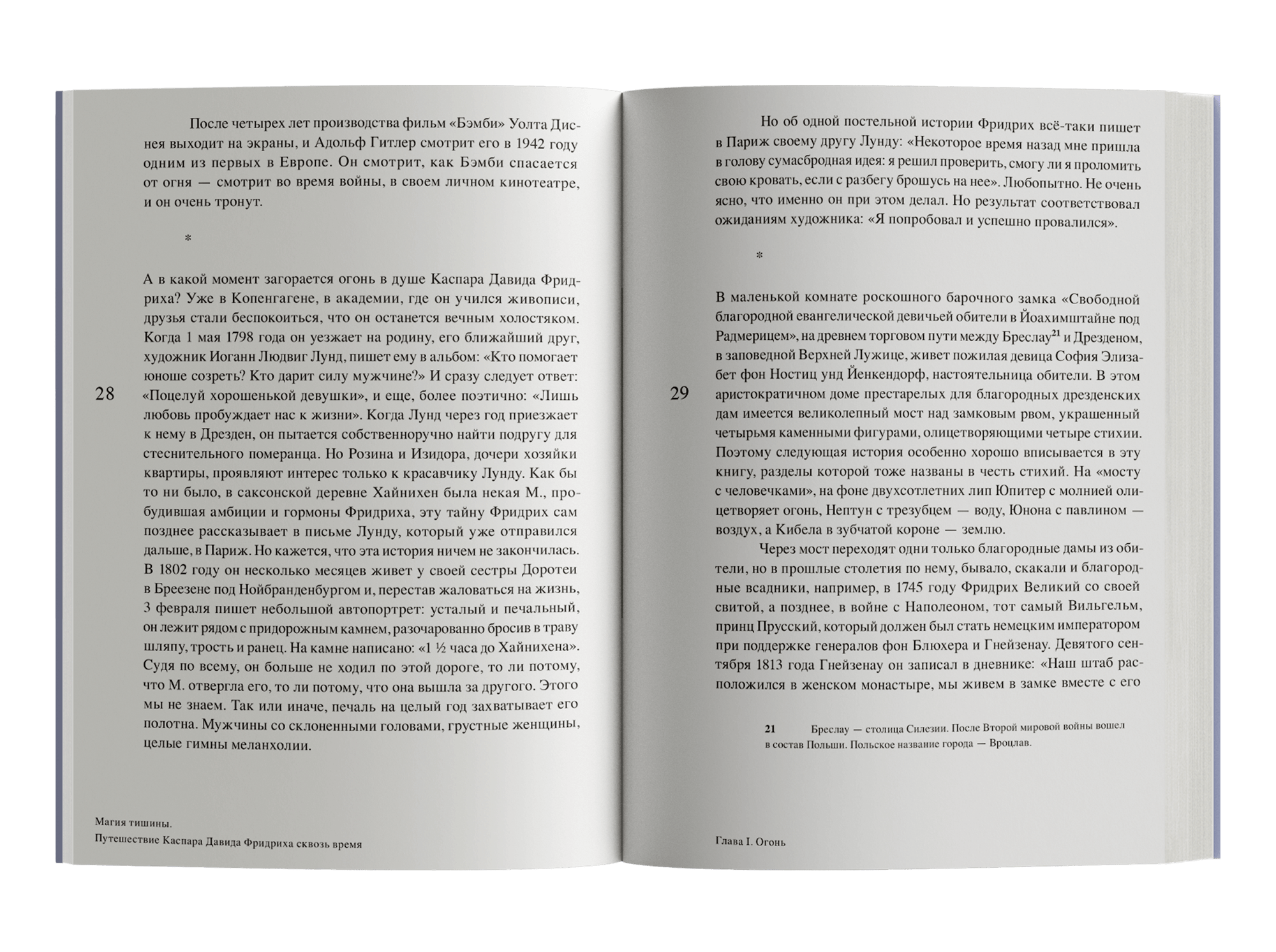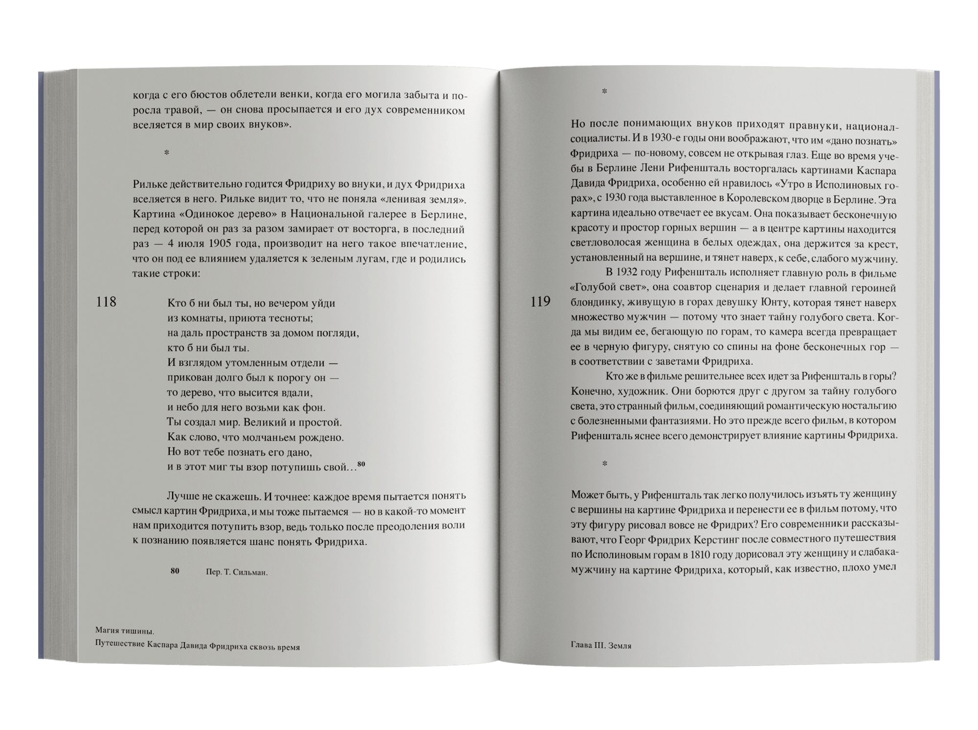 Двести пятьдесят лет немецкой истории — от 1774 года и до наших дней — разворачиваются сквозь пейзажи Каспара Давида Фридриха, самого немецкого из художников, открывшего всему миру романтическое томление духа. Гёте, например, так раздражала эта специфическая меланхоличность, что он расколотил одну из картин об стол; Диснея работы Фридриха вдохновляли настолько, что стали основой и фоном для знаменитого мультфильма «Бэмби». Нашедший поклонников среди известных авторов начала XX века и боготворимый нацистами, ненавидимый поколением 1968 года и презираемый своими современниками, Каспар Давид Фридрих столь же противоречив, как и написанные им картины. Флориан Иллиес продолжает традицию, заданную его предыдущими работами, и проводит читателей по закоулкам истории, сталкивает эпохи и личности, внешнюю хронику и частную жизнь, чтобы создать портрет художника, путешествующего во временах и эпохах.