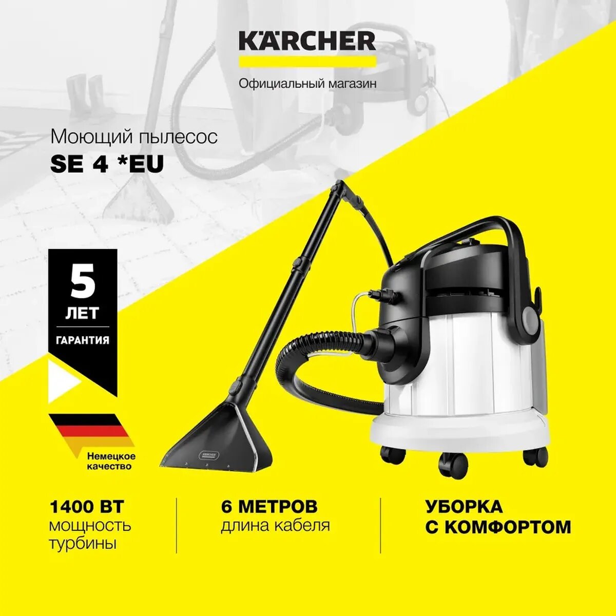 Моющий пылесос Karcher SE 5 *EU 1.081-230.0 обеспечивает тщательную, глубокую очистку текстильных поверхностей, например ковров или обивки мягкой мебели. Он прекрасно подходит для семей, аллергиков и владельцев домашних животных.Высокая эффективность уборки в сочетании с эргономичностью и многофункциональностью: моющий пылесос SE 5, отличающийся привлекательным дизайном, обеспечивает тщательную, глубокую очистку разнообразных текстильных материалов ковров и ковровых напольных покрытий, обивки мягкой мебели и автомобильных сидений, матрасов, стенных ковров и т. д. Превосходный результат чистки гарантирует испытанная технология экстракции: моечный раствор, приготавливаемый путем добавки в водопроводную воду предлагаемого Karcher средства для чистки ковров RM 519, под давлением разбрызгивается на текстильную поверхность и сразу же собирается вместе с отделяемыми загрязнениями. Такой пылесос прекрасно подходит для семей, аллергиков и владельцев домашних животных. Пылесос для дома Karcher SE 5 многофункциональный продукт «3 в 1», который благодаря широкому набору принадлежностей может использоваться и в качестве полноценного хозяйственного пылесоса. Другими его особенностями являются система 2 резервуаров со съемными баками для чистой и грязной воды, эргономичная ручка для переноски и возможность хранения принадлежностей на корпусе. Простота очистки моющего пылесоса по окончании уборки способствует продлению срока его службы.