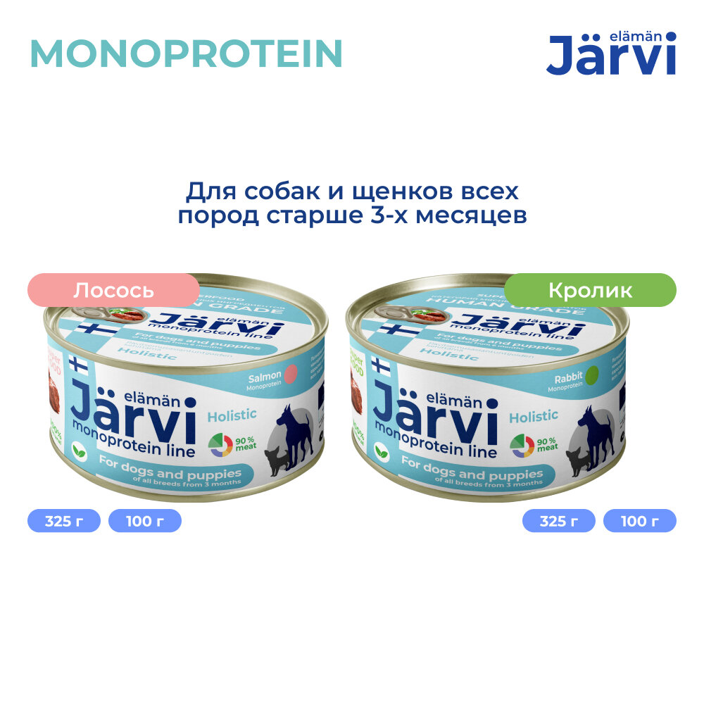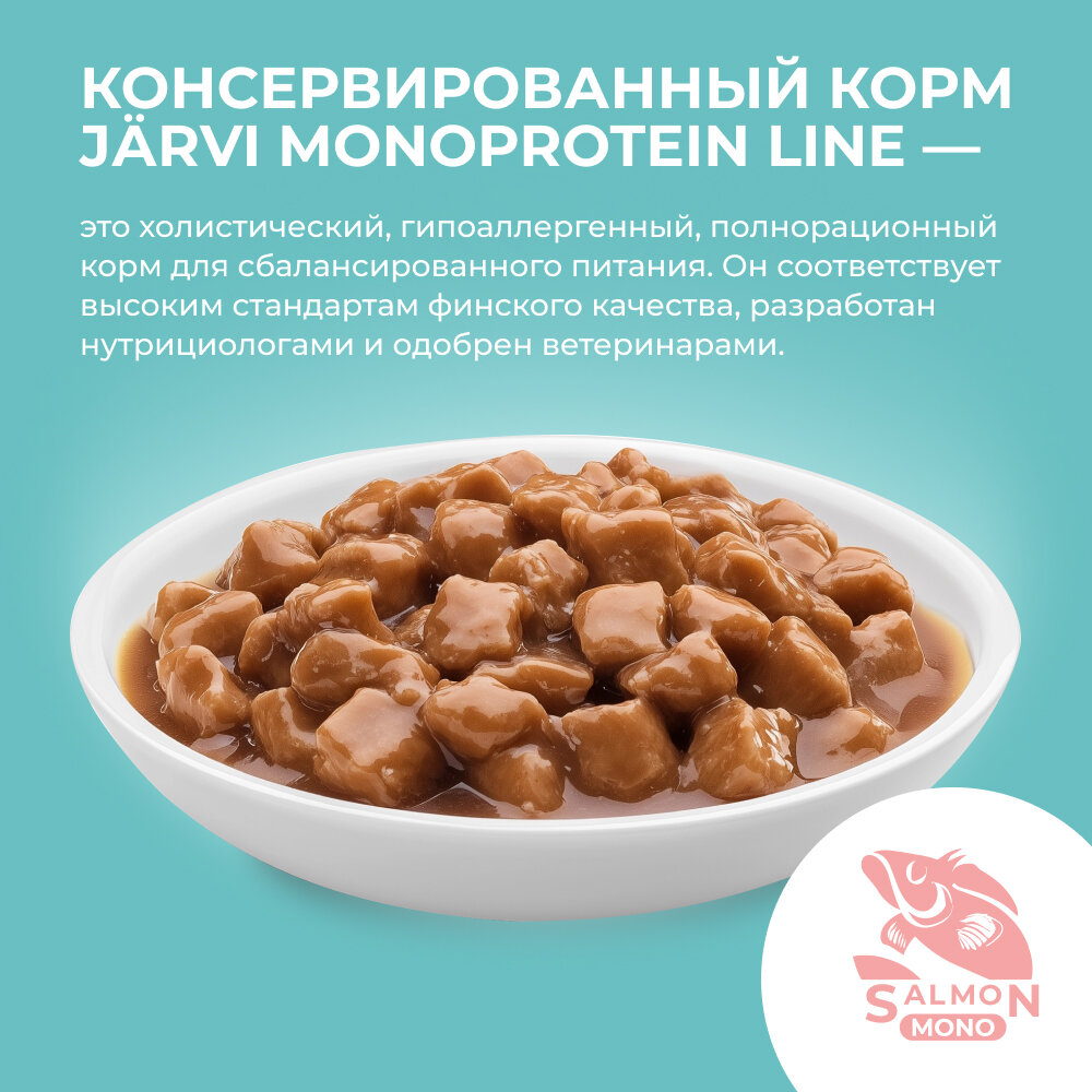 Консервированный корм Jarvi Monoprotein Line – это холистический, гипоаллергенный, полнорационный корм для сбалансированного питания. Он соответствует высоким стандартам финского качества, разработан нутрициологами и одобрен ветеринарами.В составе корма используется только один источник животного белка, что делает его подходящим для питомцев, предрасположенных к пищевой непереносимости, повышенной чувствительности кишечника и кожи. В Jarvi Monoprotein Line содержится 90 % мясного ингредиента категории HUMAN GRADE, что делает корм идеальным для ежедневного потребления и удовлетворения всех потребностей вашего питомца.Кроме того, содержание всех необходимых витаминов и микроэлементов способствует полноценному развитию, поддержке здоровой кожи и шерсти, укреплению опорно-двигательного аппарата и сердечно-сосудистой системы вашего питомца, содержит антиоксиданты, которые помогают защитить клетки организма от свободных радикалов. Широкий ассортимент Jarvi Monoprotein Line позволит вам подобрать корм, подходящий под индивидуальные особенности вашего домашнего животного.Консервированный корм Jarvi Monoprotein Line – это холистический, гипоаллергенный, полнорационный корм для сбалансированного питания. Он соответствует высоким стандартам финского качества, разработан нутрициологами и одобрен ветеринарами.В составе корма используется только один источник животного белка, что делает его подходящим для питомцев, предрасположенных к пищевой непереносимости, повышенной чувствительности кишечника и кожи. В Jarvi Monoprotein Line содержится 90 % мясного ингредиента категории HUMAN GRADE, что делает корм идеальным для ежедневного потребления и удовлетворения всех потребностей вашего питомца.Кроме того, содержание всех необходимых витаминов и микроэлементов способствует полноценному развитию, поддержке здоровой кожи и шерсти, укреплению опорно-двигательного аппарата и сердечно-сосудистой системы вашего питомца, содержит антиоксиданты, которые помогают защитить клетки организма от свободных радикалов. Широкий ассортимент Jarvi Monoprotein Line позволит вам подобрать корм, подходящий под индивидуальные особенности вашего домашнего животного.