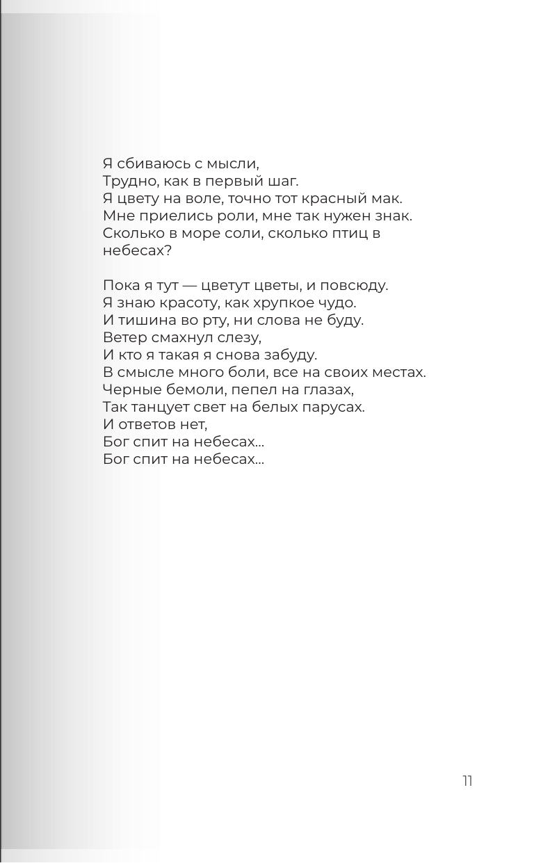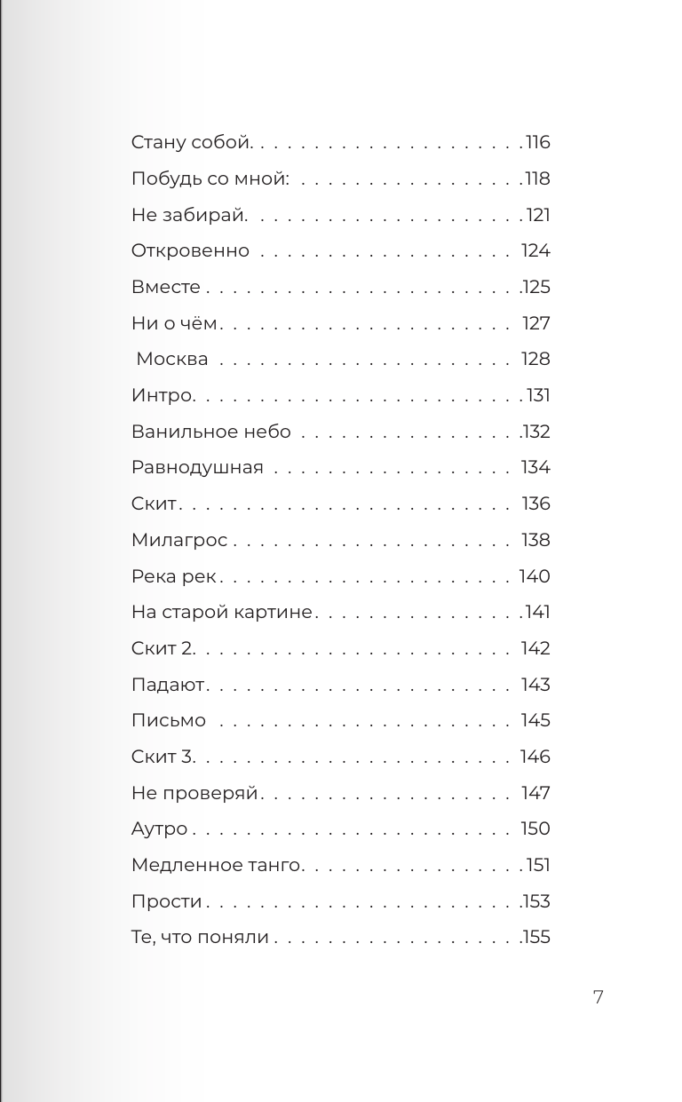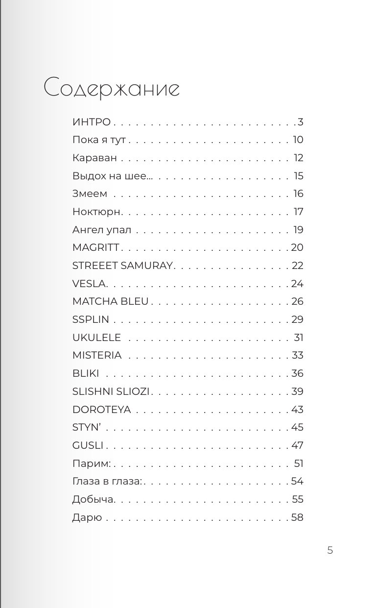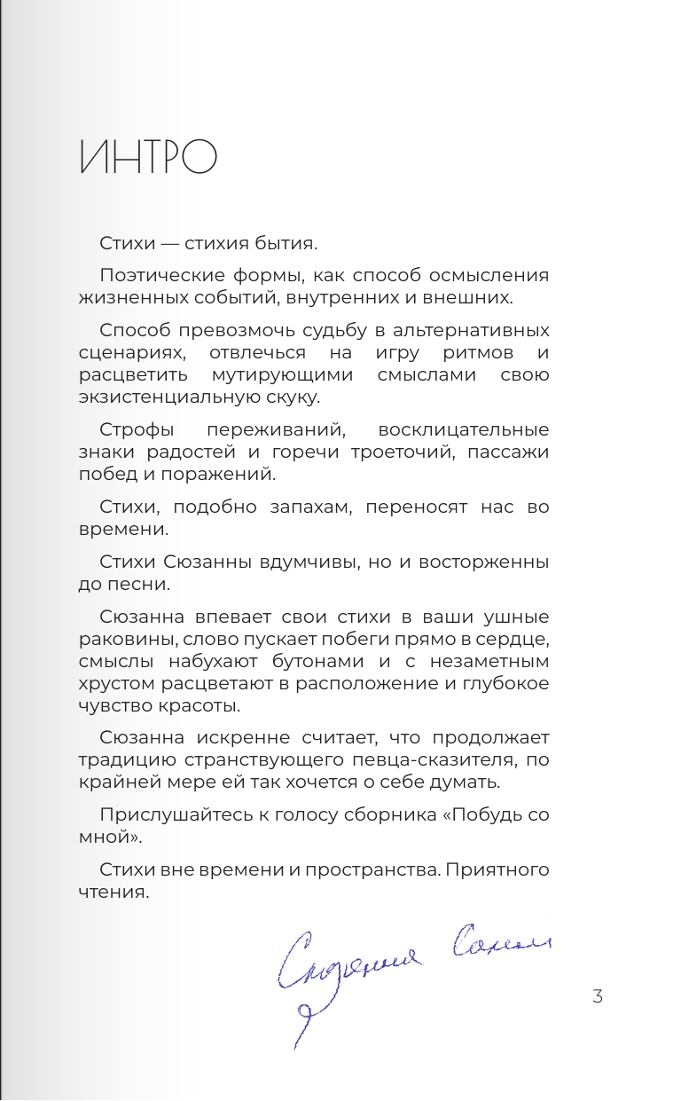 "Первый большой сборник текстов Сюзанны - певицы, композитора и сонграйтера. Строфы переживаний, восклицательные знаки радостей и горечи троеточий, пассажи побед и поражений. Стихи, подобно запахам, переносят нас во времени, словно мы прислушиваемся к странствующему певцу-сказителю. Это слова о самом важном в жизни каждого из нас. Сюзанна с 2016 по 2020 годы выступала с группой Мальбэк, а с 2020 года занимается сольным творчеством совместно с московским продюсером и композитором Никитой Каменским - тоже героем этой книги. Вместе они основали лейбл для актуальной поп-музыки “Улица Новаторов”. На счету Сюзанны 8 сольных альбомов и 2 альбома в сотрудничестве с Мальбэк, более 20 синглов и EP, а также совместные треки с IOWA, Хаски, Thomas Mraz, масло чёрного тмина и другими.