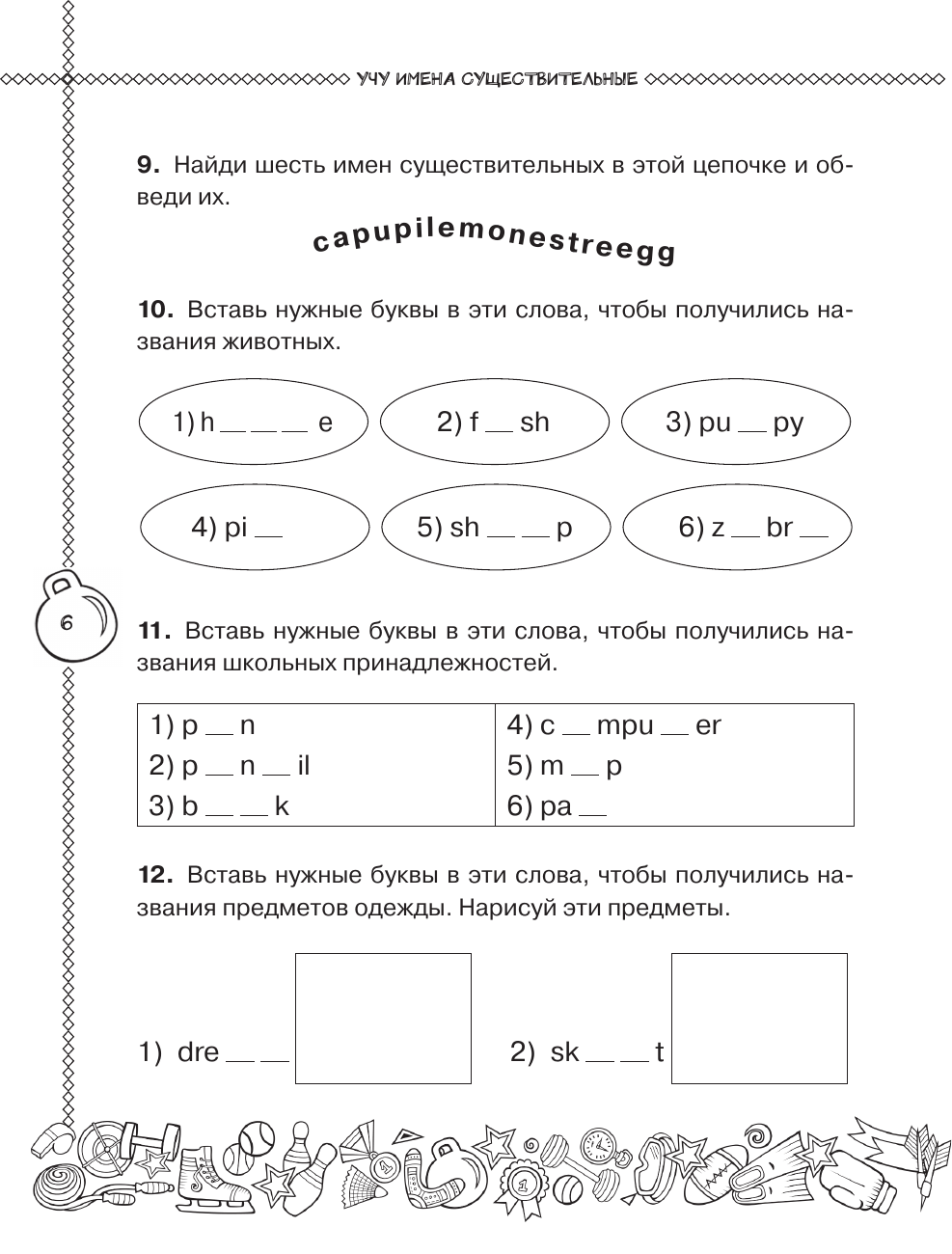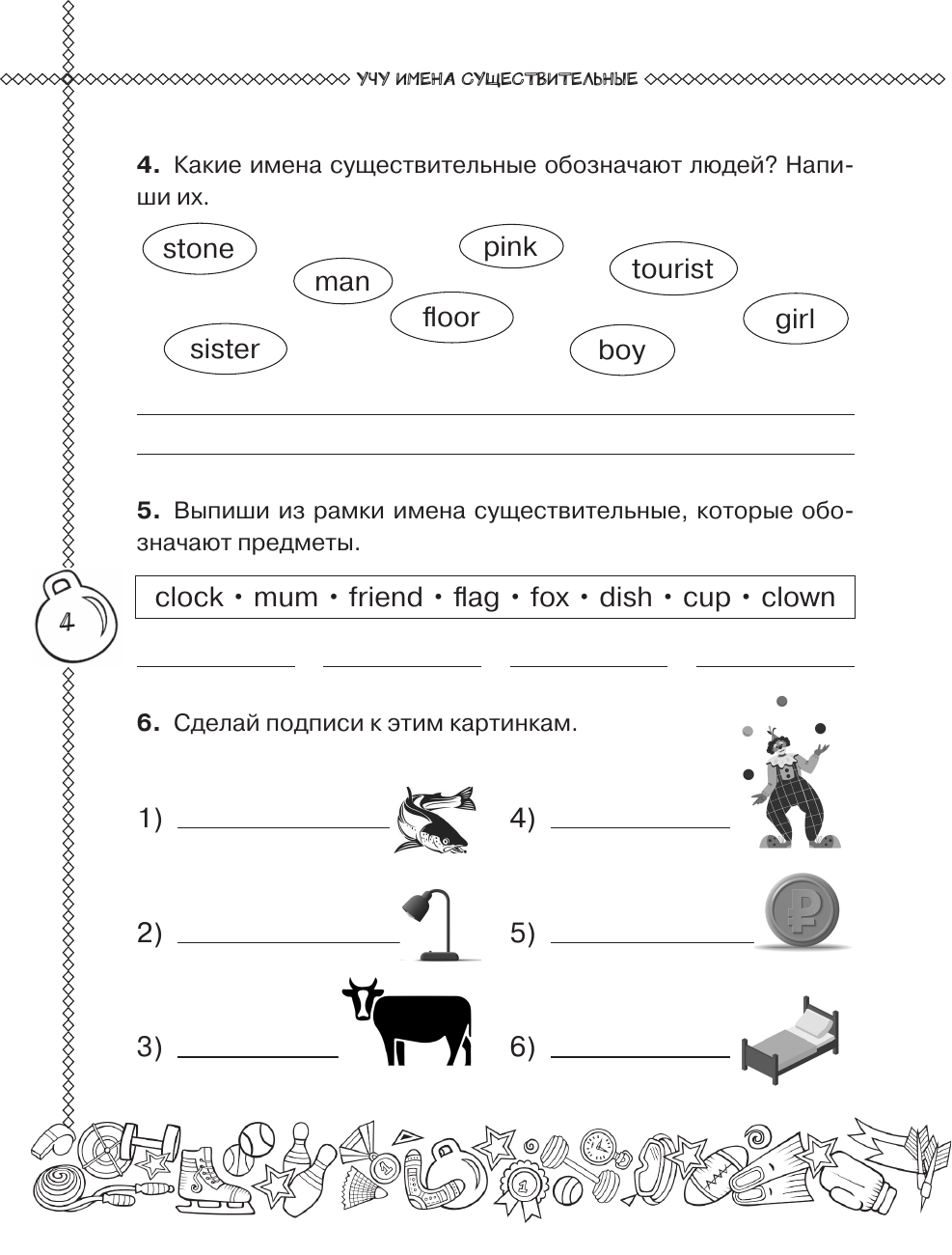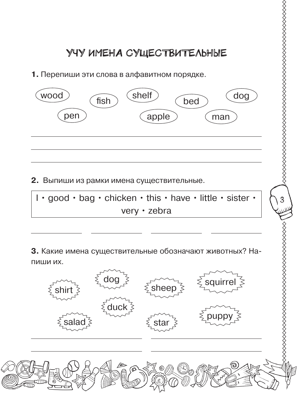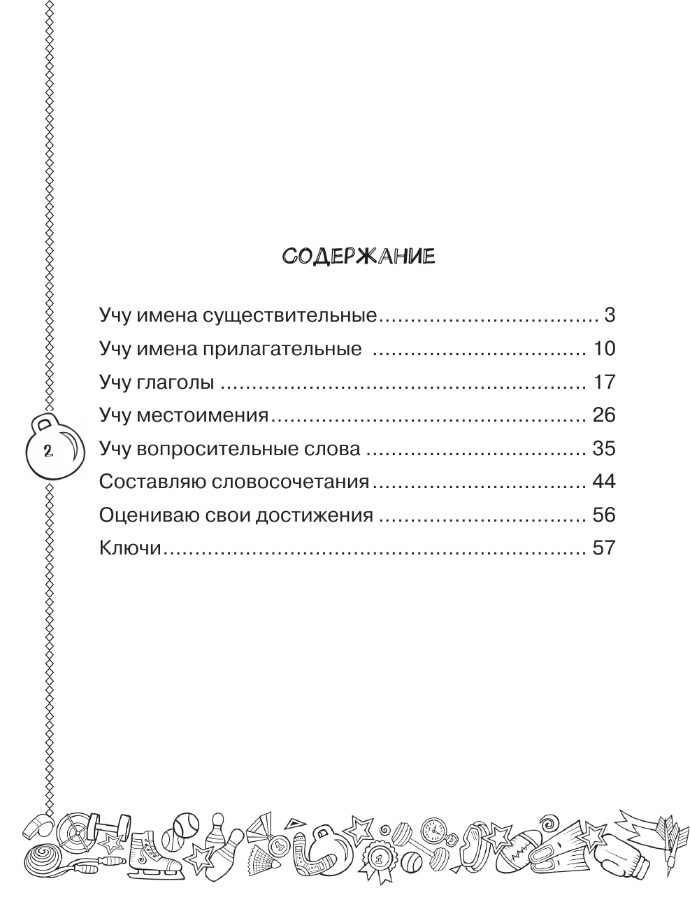 Выполняя задания, можно узнать об именах существительных и прилагательных, глаголах, местоимениях и вопросительных словах, а также научиться составить словосочетания.