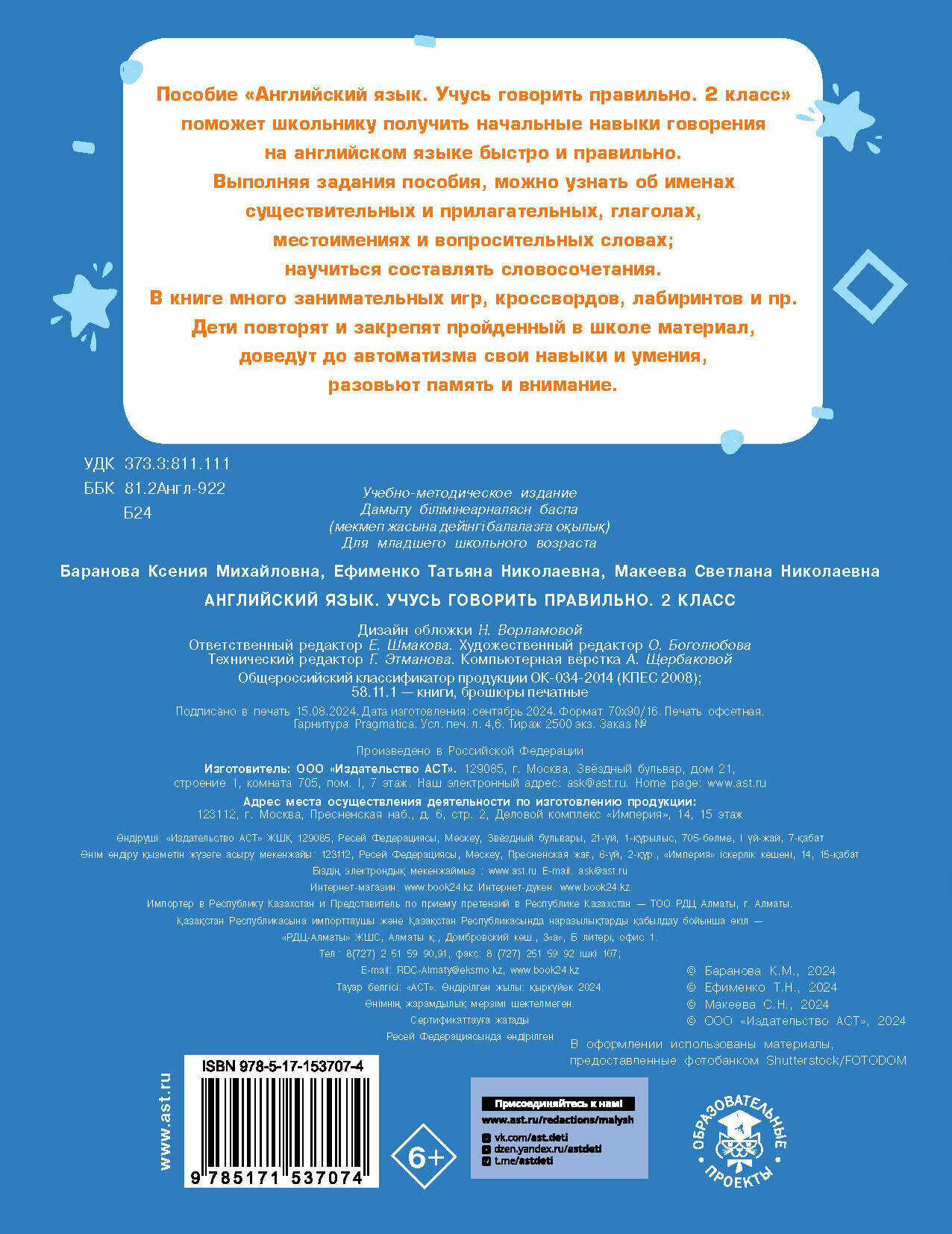 Английский язык. Учусь говорить правильно. 2 класс (Светлана Николаевна Макеева, Ксения Михайловна Баранова, Татьяна Николаевна Ефименко); АСТ, 2024