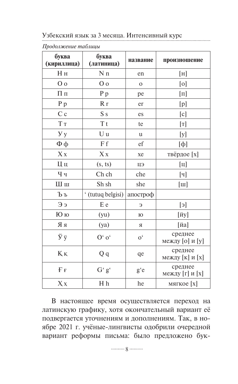 Быстро овладейте узбекским языком с помощью пособия «Узбекский язык за 3 месяца. Интенсивный курс». Простые уроки содержат необходимую грамматику для начинающих, а также общеупотребительную лексику и полезные выражения, которые позволят говорить на узбекском уже с первых уроков. Пособие содержит много упражнений для закрепления полученных знаний, а также ответы. В конце находится удобный русско-узбекский и узбекско-русский словари. Пособие подходит всем, кто начинает изучать узбекский язык.