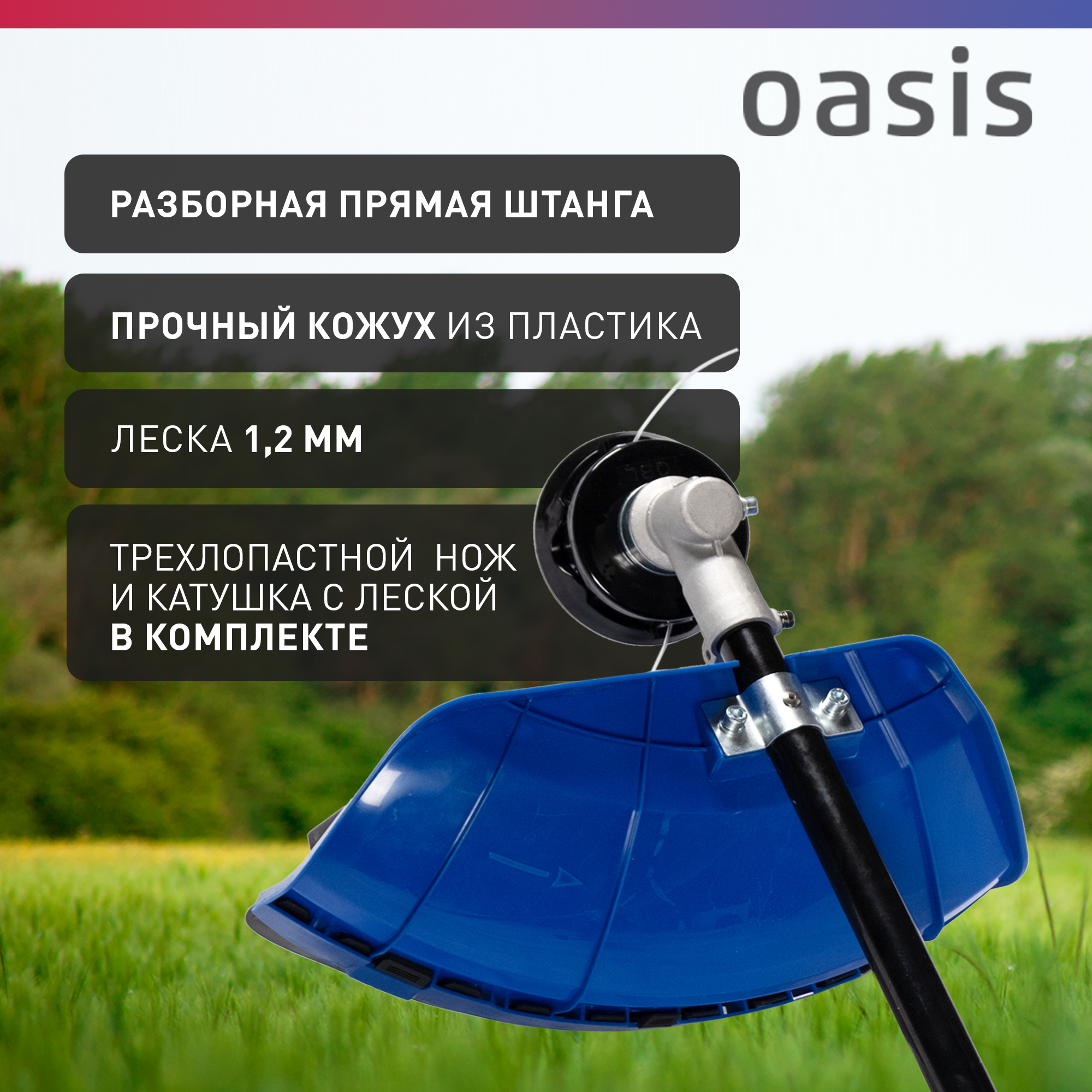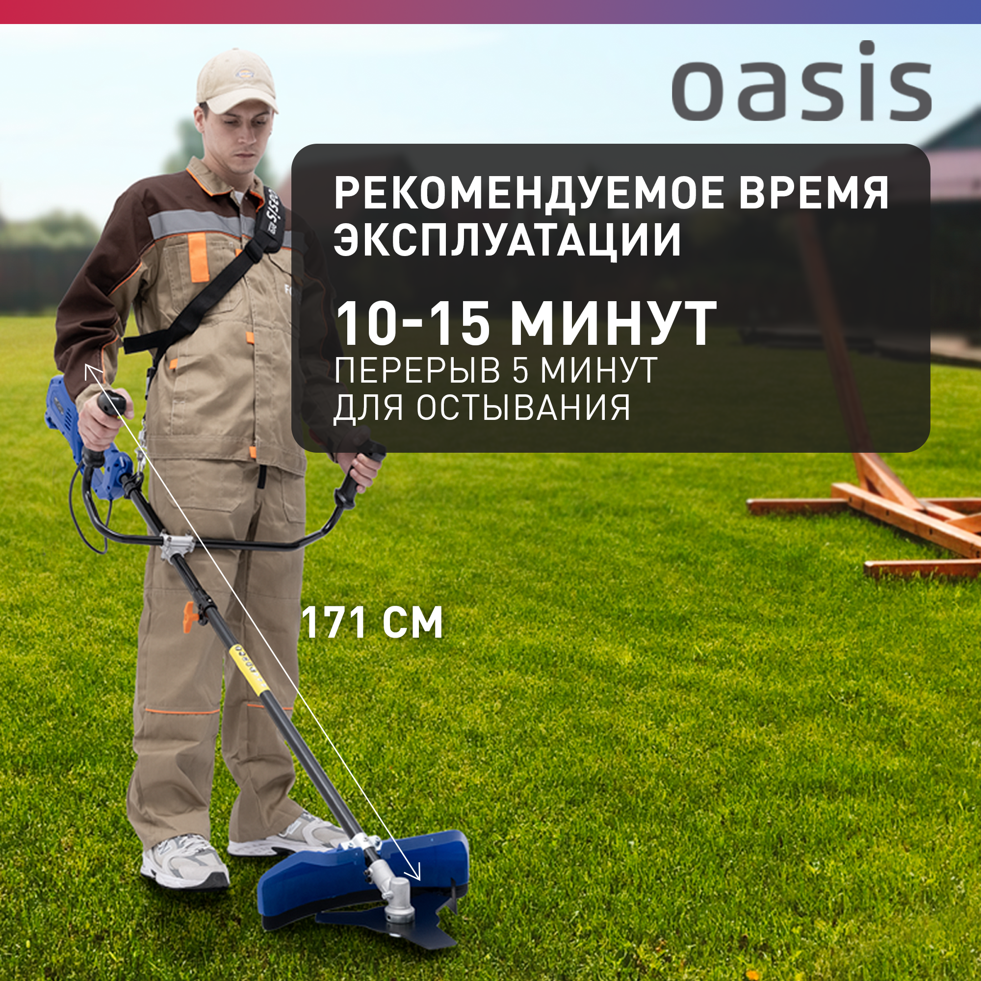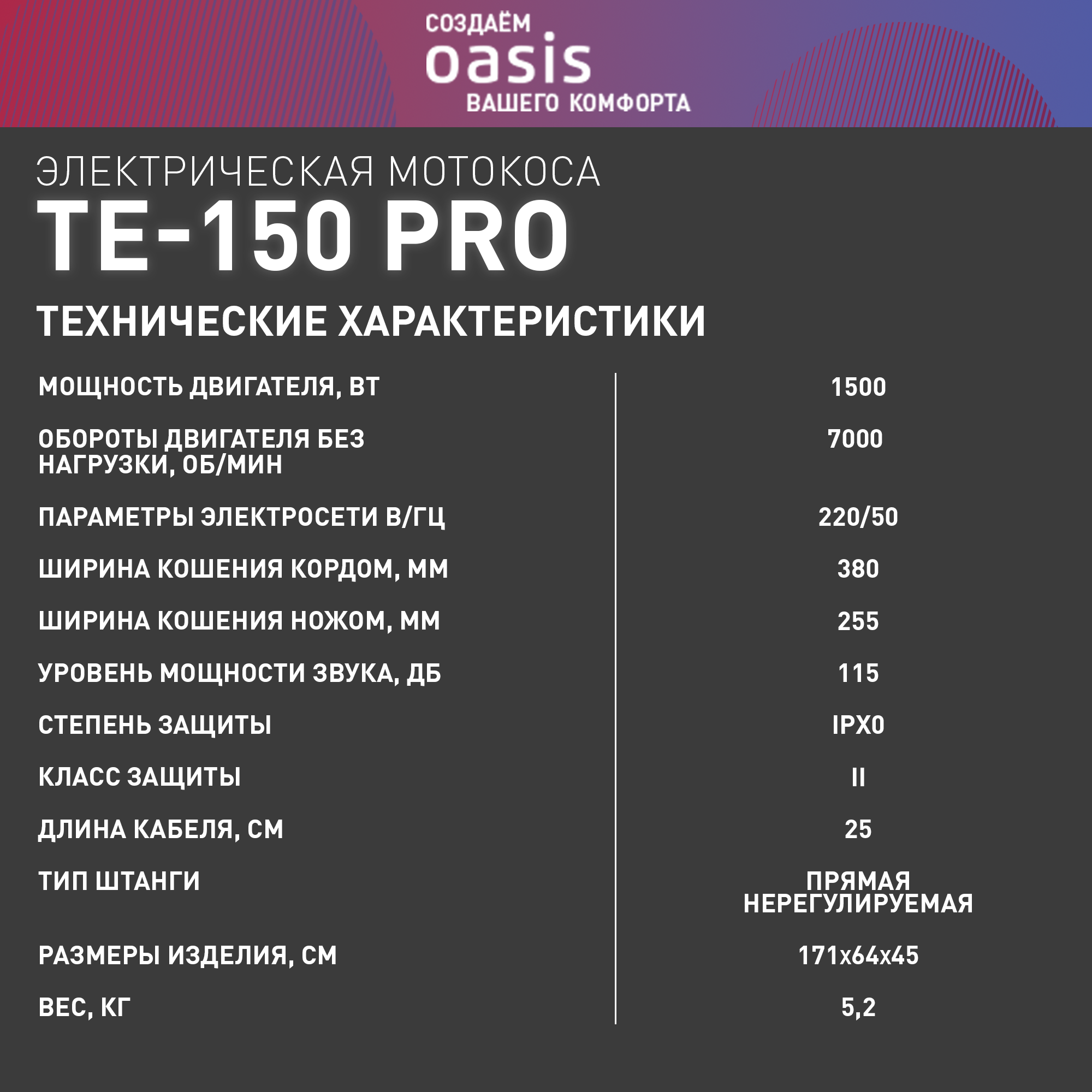 **Мотокоса электрическая Oasis TE-150 PRO** — удобная в эксплуатации и простая в обслуживании модель с щеточным двигателем, который хорошо справляется с кошением и подравниванием травы. Также она подходит для срезка мелких кустарников. Устройство незаменимо на садовом и дачном участке. Телескопическую штангу можно настроить под рост пользователя, что сделает рабочий процесс более удобным. Наплечный ремень в сочетании с антивибрационной системой уменьшает нагрузку, оказываемую на руке — это особенно актуально при выполнении больших объемов работы. D-образная ручка обеспечивает надежный хват и улучшенный контроль над мотокосой. Для защиты от травы и мелких камней в нижней части установлен специальный кожух.