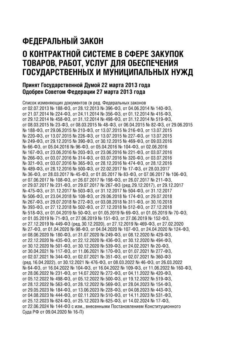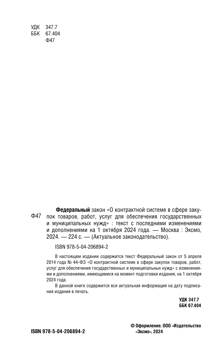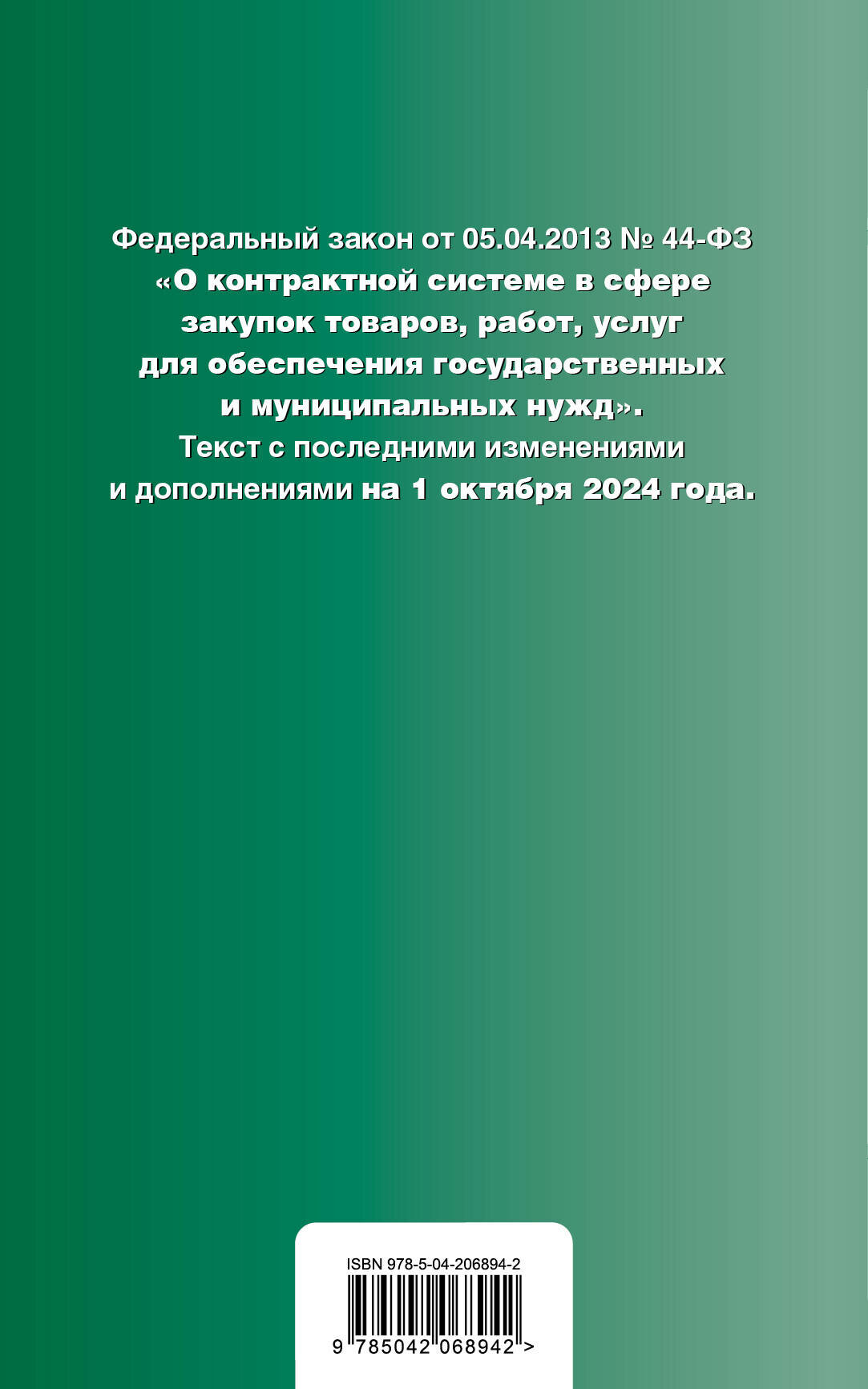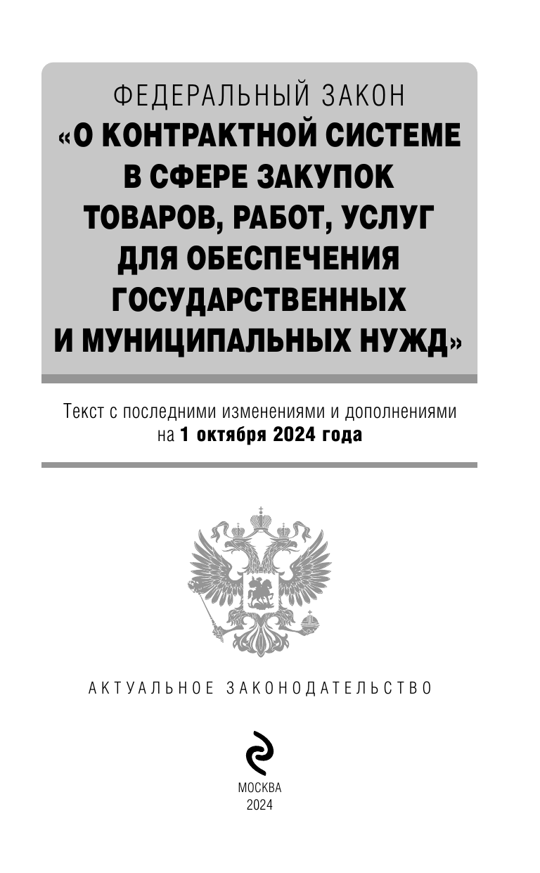 В настоящем издании содержится текст Федеральный закон от 5 апреля 2014 года 44-ФЗ "О контрактной системе в сфере закупок товаров, работ, услуг для обеспечения государственных и муниципальных нужд" с изменениями и дополнениями, имеющимися на момент подготовки издания, на 1 октября 2024 года. В данной книге содержится вся актуальная информация на дату подписания издания в печать.