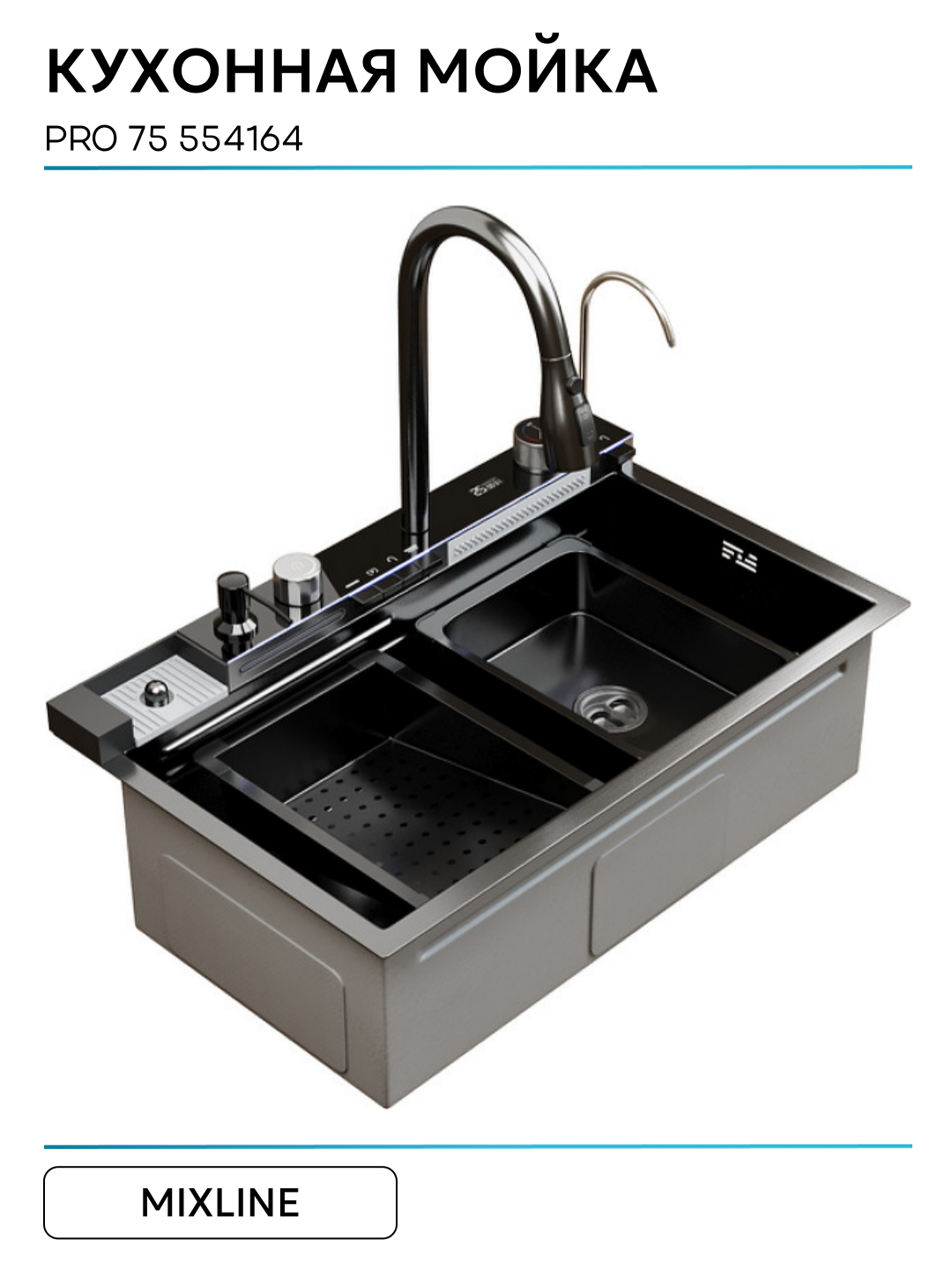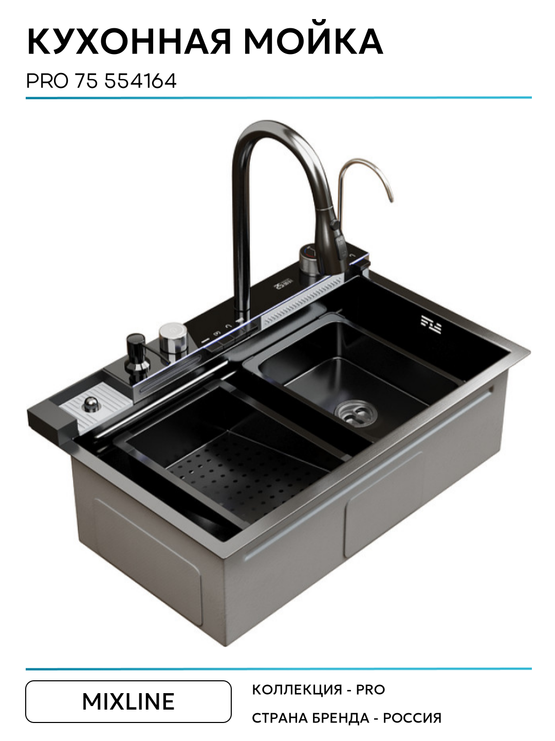 Мойка кухонная Mixline Pro 75х46 с сифоном+дозатор+смеситель+коландер+доска разделочная+ополаскиватель стаканов 554164