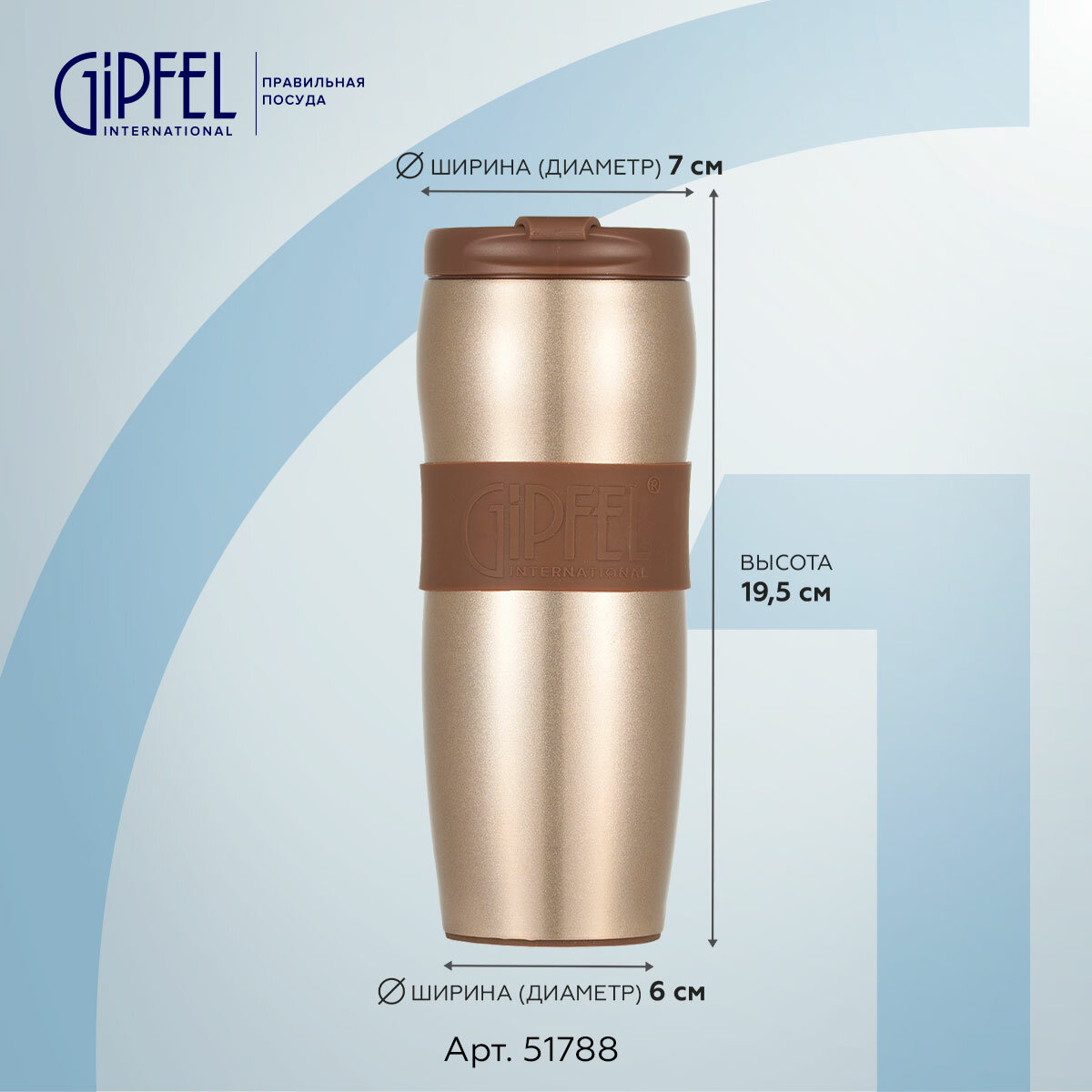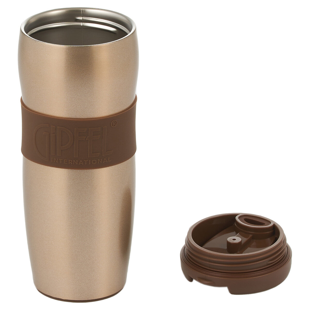 У кружки оригинальный дизайн. Она выполнена в благородном золотистом цвете, обтекаемой формы. Мягкая силиконовая вставка с логотипом Gipfel не только элемент декора, за нее удобно держать изделие.