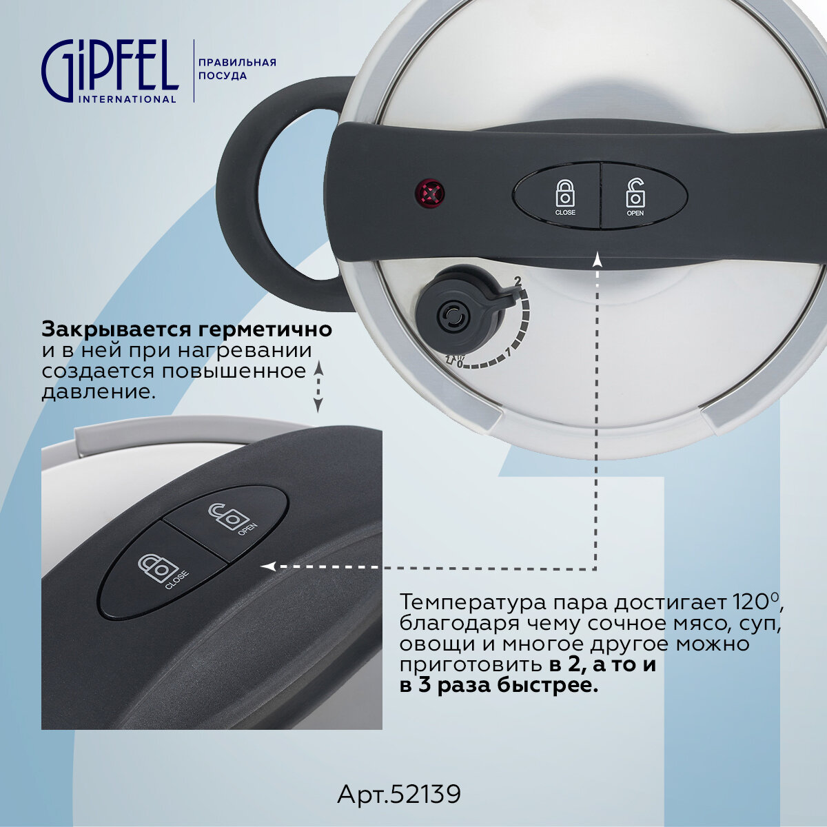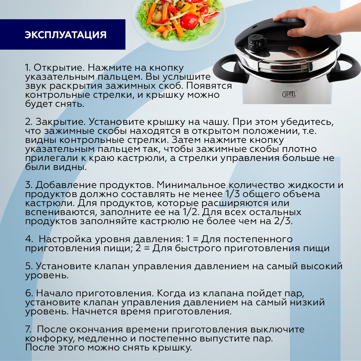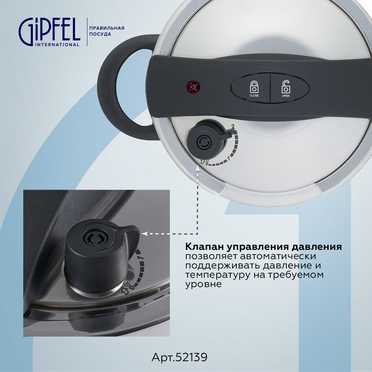 Скороварка оснащена клапаном управления давлением, который автоматически поддерживает давление и температуру на требуемом уровне.