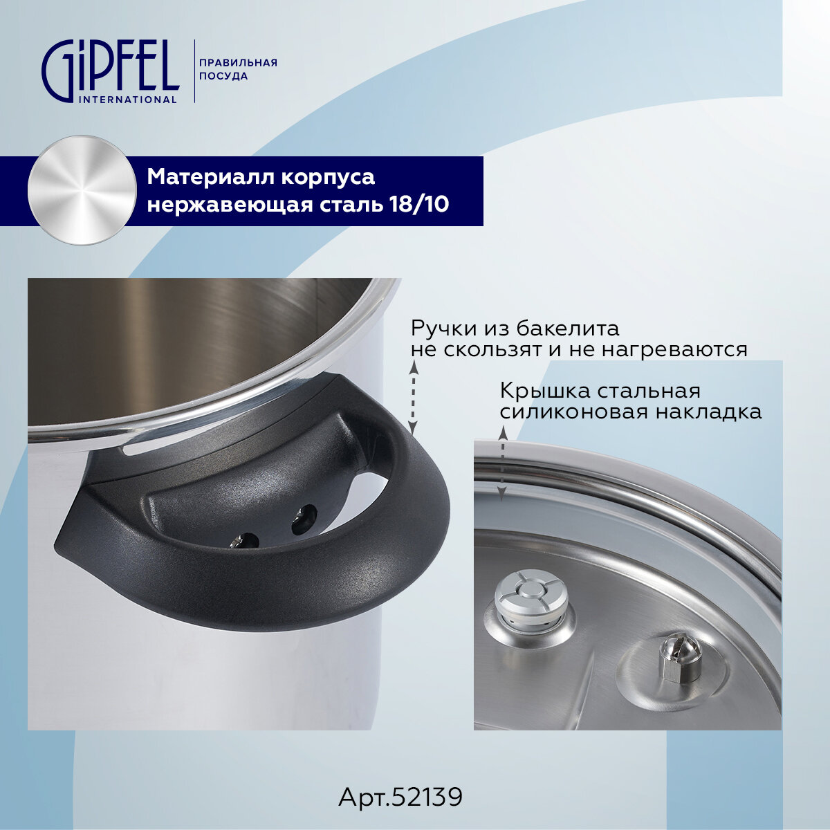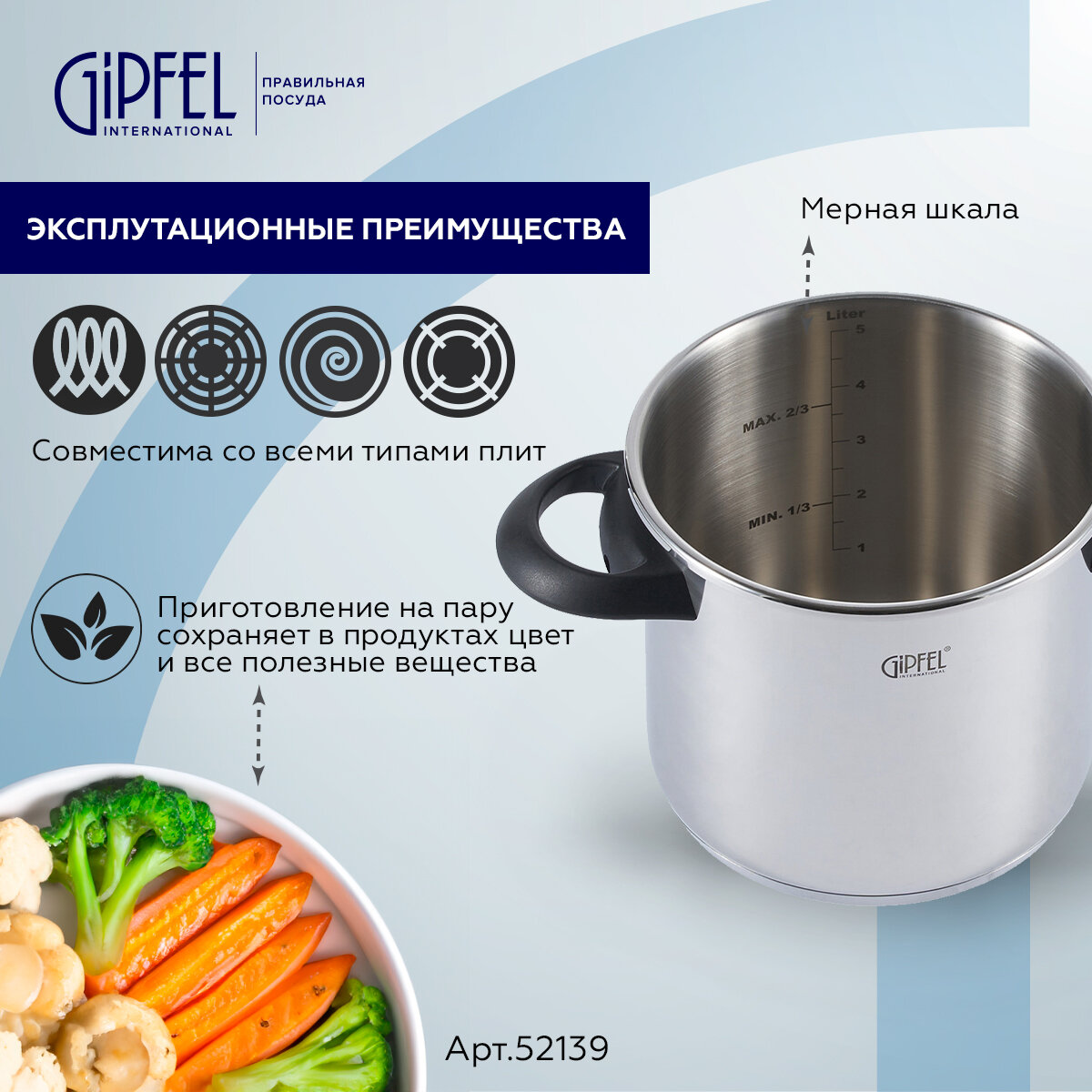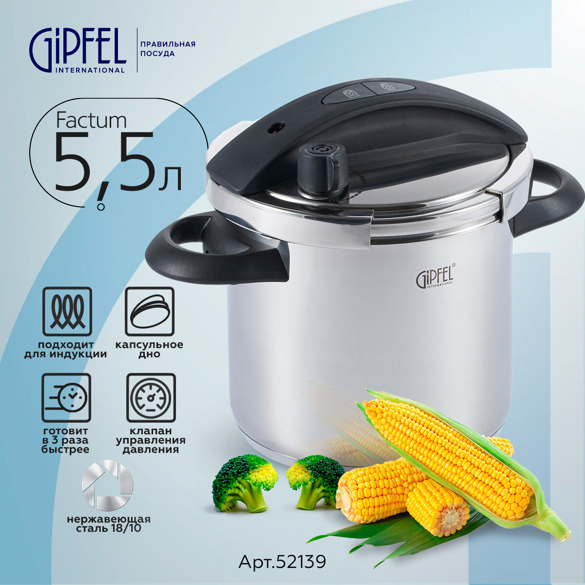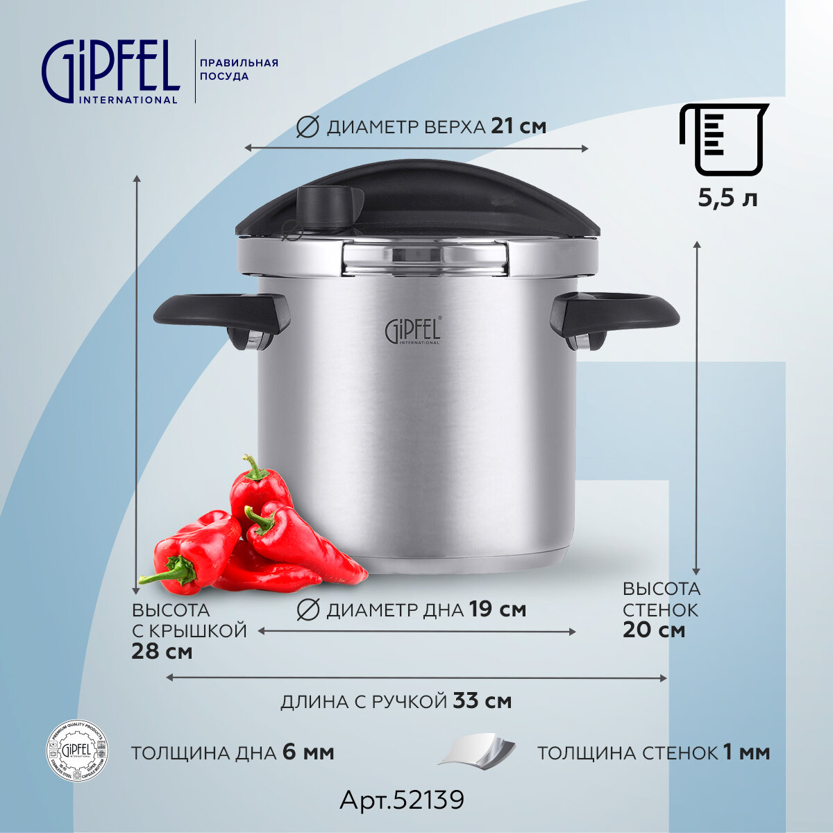 Скороварка Gipfel Factum 52139 объемом 5,5 л. Изготовлена из нержавеющей стали 18/10 - материала прочного, гигиеничного и долговечного. У изделия сверхпрочное трехслойное капсульное дно толщиной 6 мм. Толщина стенок 1 мм.