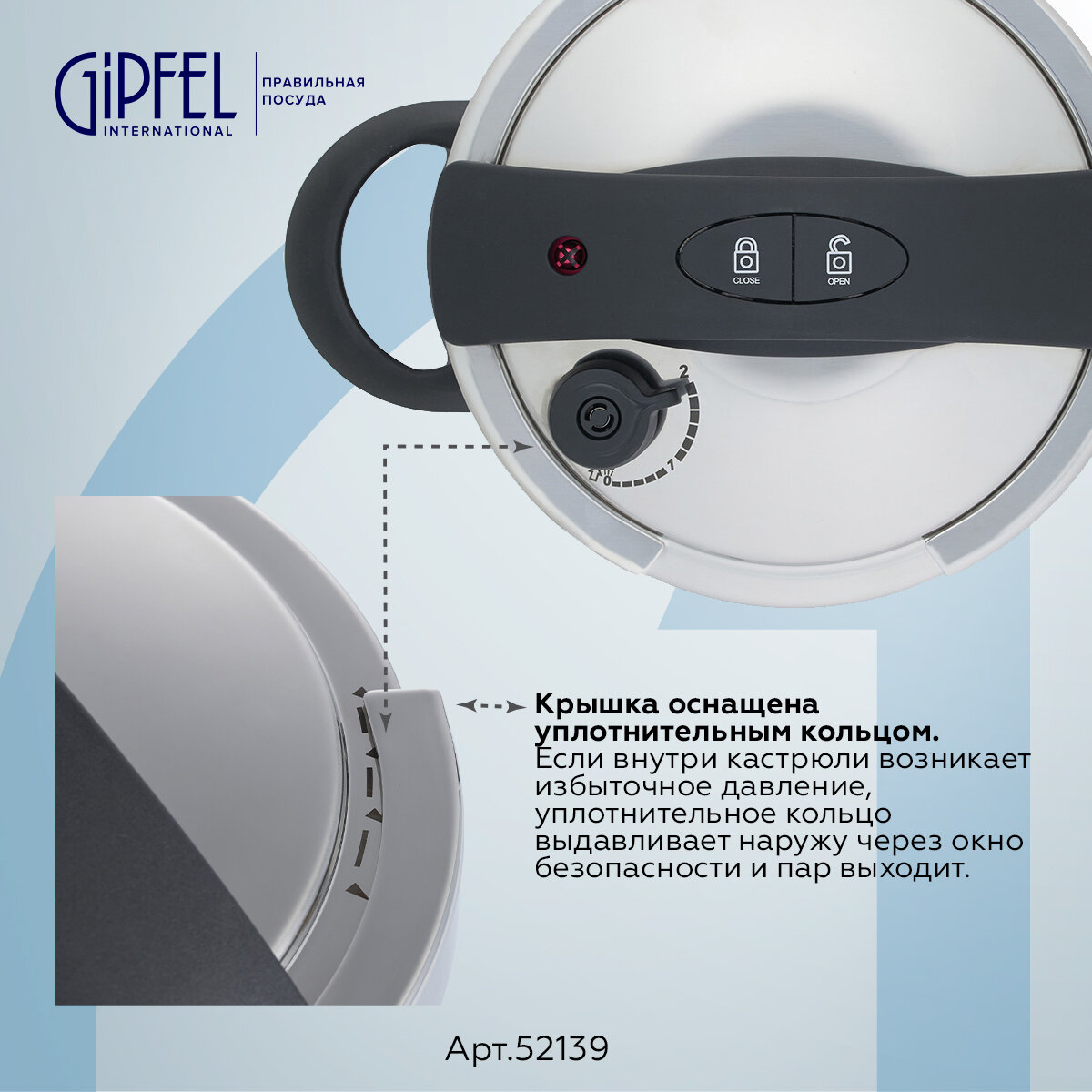 Крышка из нержавеющей стали толщиной 1,2 мм и с уплотнительным кольцом. Если внутри возникает избыточное давление, уплотнительное кольцо выдавливается наружу через окно безопасности, и пар выходит.