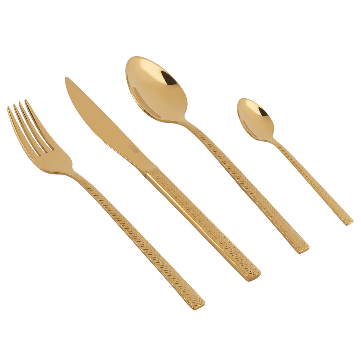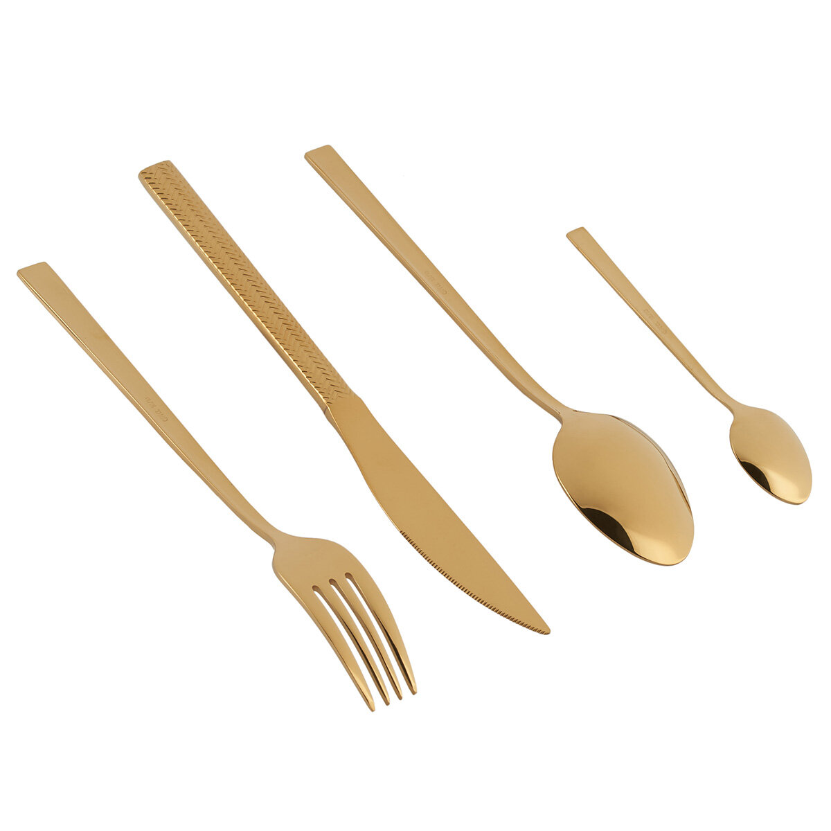 Блестящая поверхность изделий великолепно дополнит повседневную и праздничную сервировку, торжественный обед или ужин. Предметы в цвете золота, рукоятки с рельефным узором. Они удобно располагаются в руке.