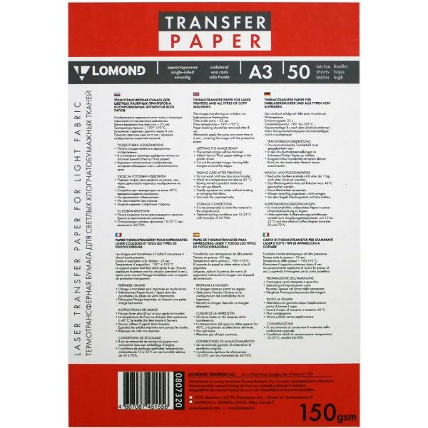 Термотрансферная бумага Lomond рекомендуется для изготовления малотиражной сувенирной и рекламной продукции, реализации индивидуальных идей и дизайнерских проектов. Изображение может переводиться на ткани, состоящие из 50% хлопка и 50% полиэстера.