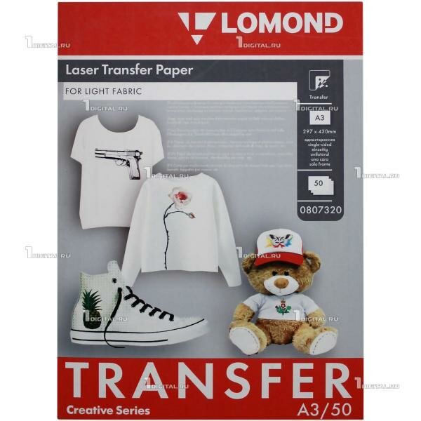 Термотрансферная бумага Lomond для лазерной печати, для светлых тканей, A3, 50листов.