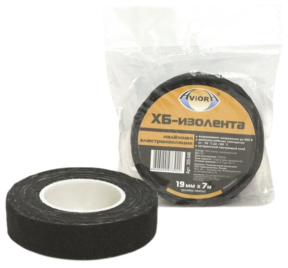 Изолента Aviora 305-046, ХБ, 19мм х 7м предназначена для электрической изоляции проводов. Помимо изоляции черная изолента на тканевой основе широко используется в быту в качестве спортивной ленты, например, для обмотки клюшек или рукояток инструмента. Хлопчатобумажная изолента также используется при ремонте автомобиля для обмотки проводки или датчиков.Преимущества Имеет ровную структуру тканевой основы и качественный слой клея из натурального каучука, который полностью пропитывает ленту Изолента ХБ имеет высокую и надежную адгезию (клейкость) к изолируемым проводам и к самой себе Хорошо растягивается, а значит более плотно ложится на обматываемую поверхность Зимой не дубеет, летом не расползается от повышенной температуры